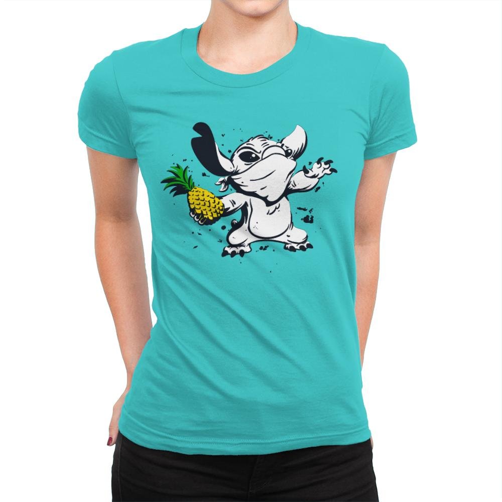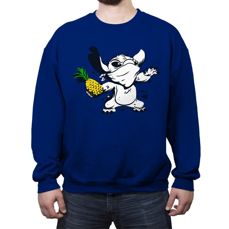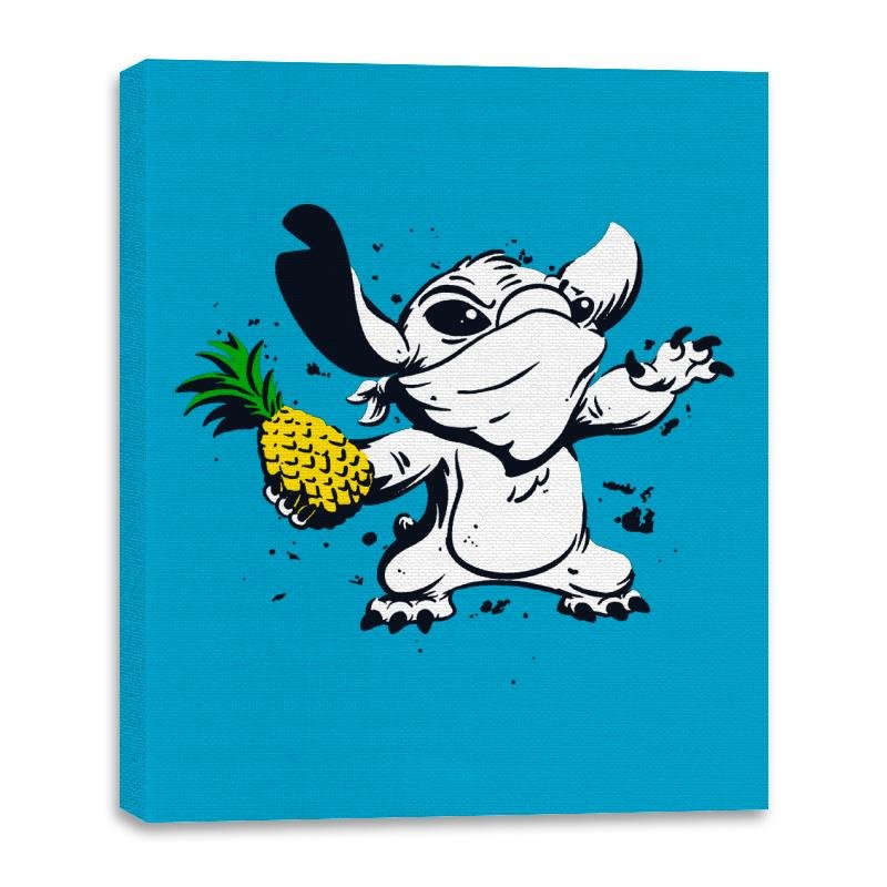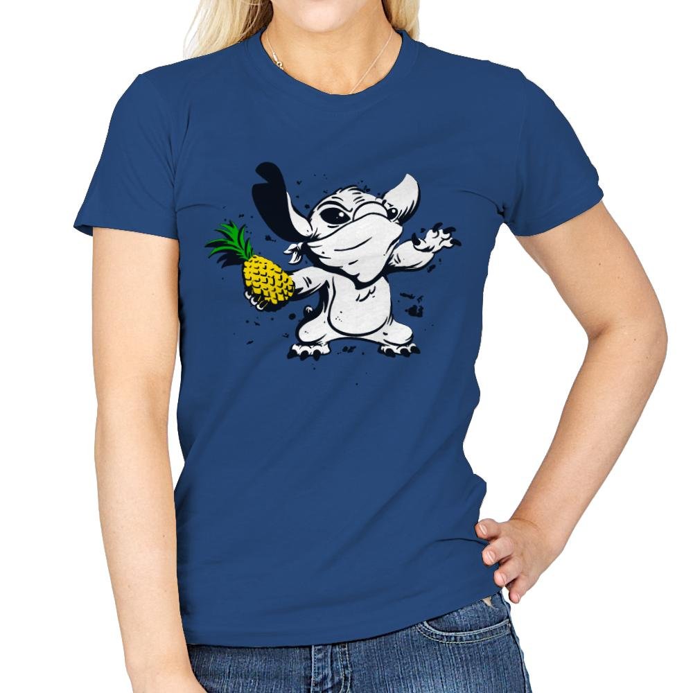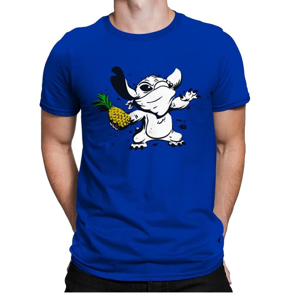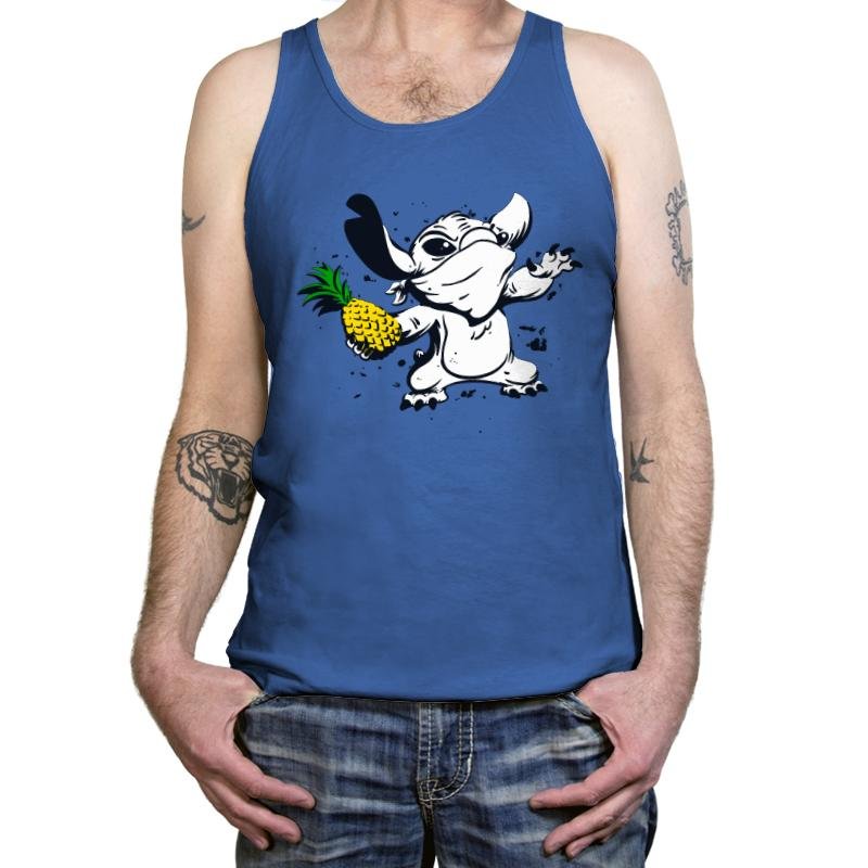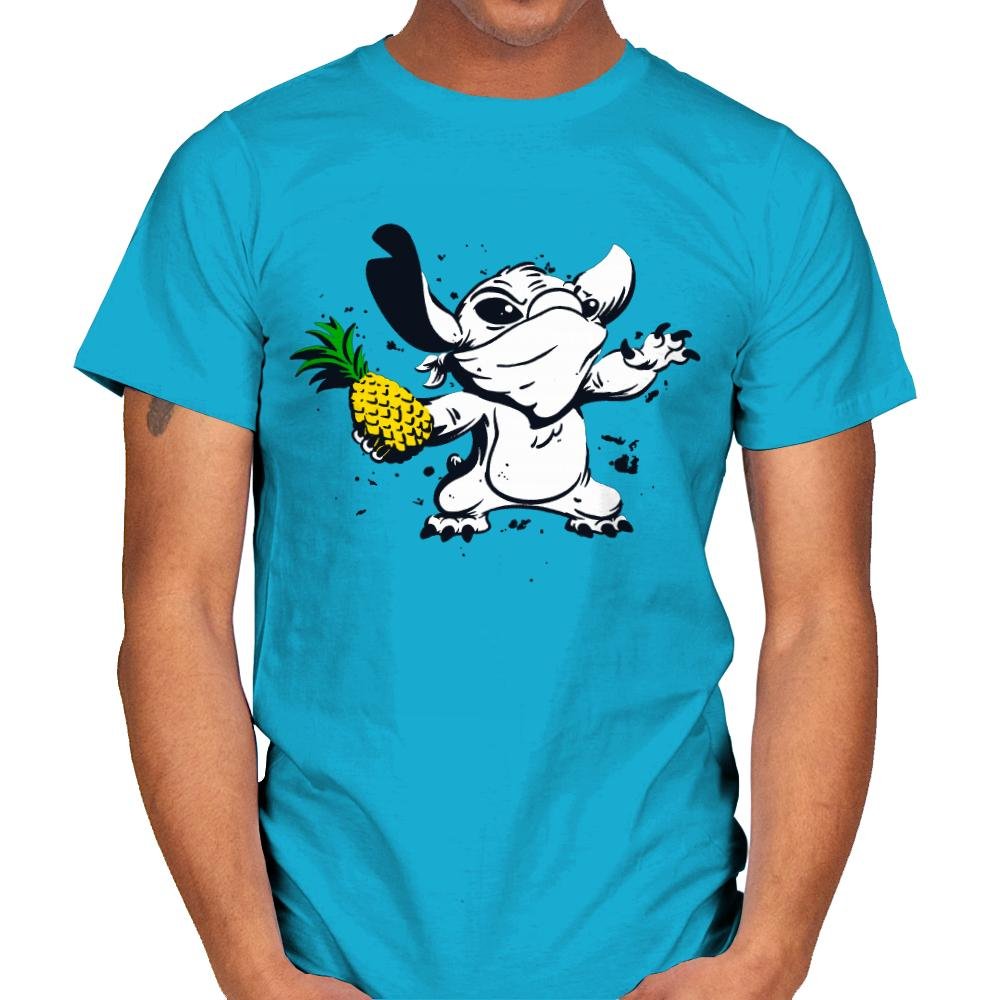 This design captures a tiny blue troublemaker mid-rampage, brandishing a pineapple as if it were classified tech. The pose is wide and defiant, with splattered ink strokes that make him feel even more chaotic. Fans will recognize the genetic experiment vibe and the tropical setting without a single word spelled out. It is playful mischief with a sunny backdrop.