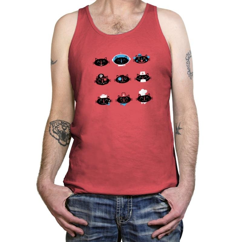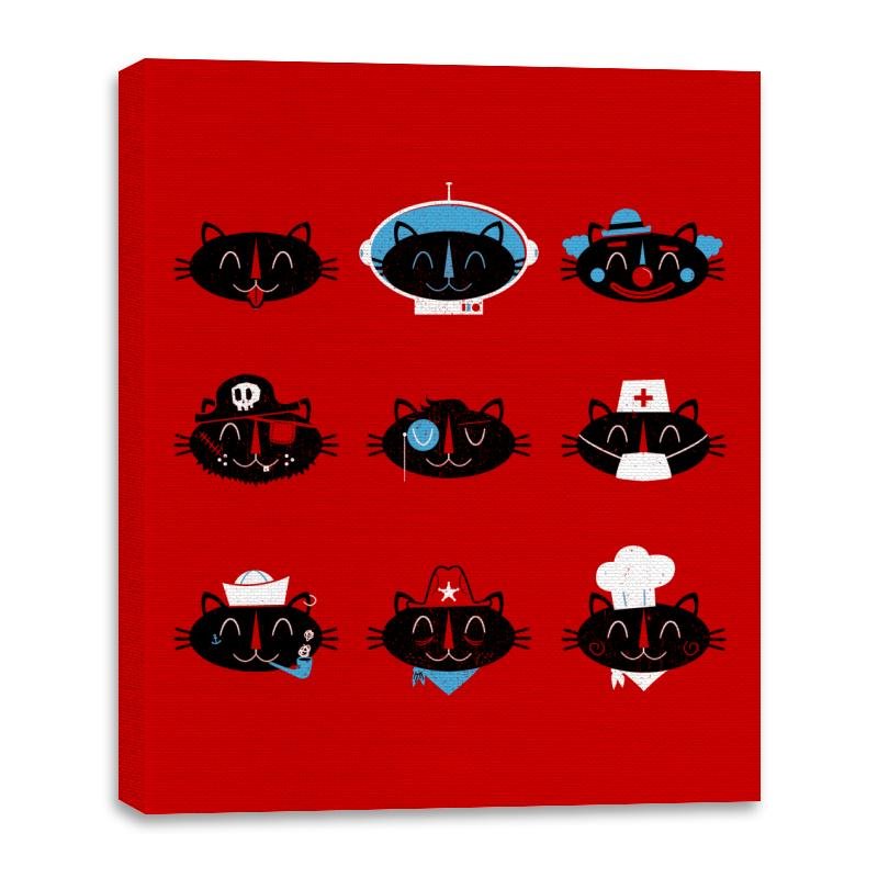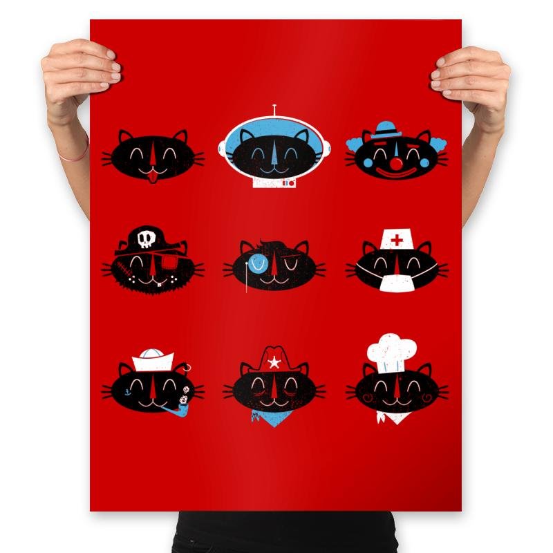 This design turns the old saying about cats having nine lives into a visual lineup of roles and personalities. Each square gives the same black cat a new identity: astronaut, clown, pirate, sailor, chef, doctor, and more. The charm comes from how simple the faces are while still giving each life its own distinct vibe. The bright red backdrop pushes the cartoon energy even further.