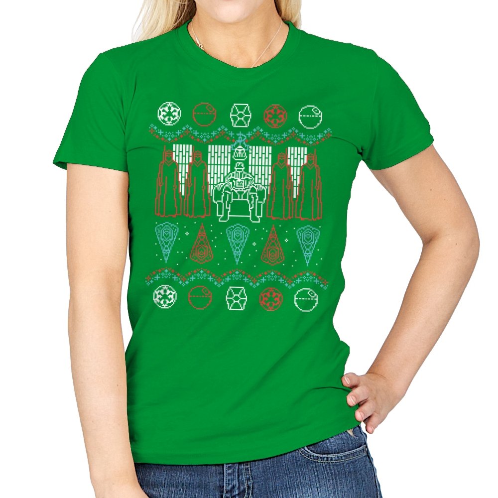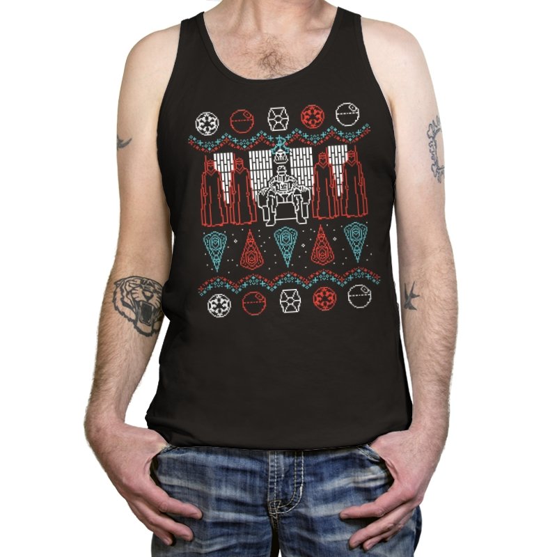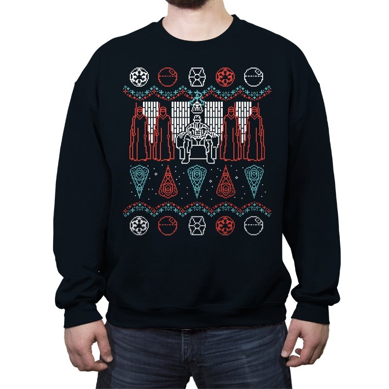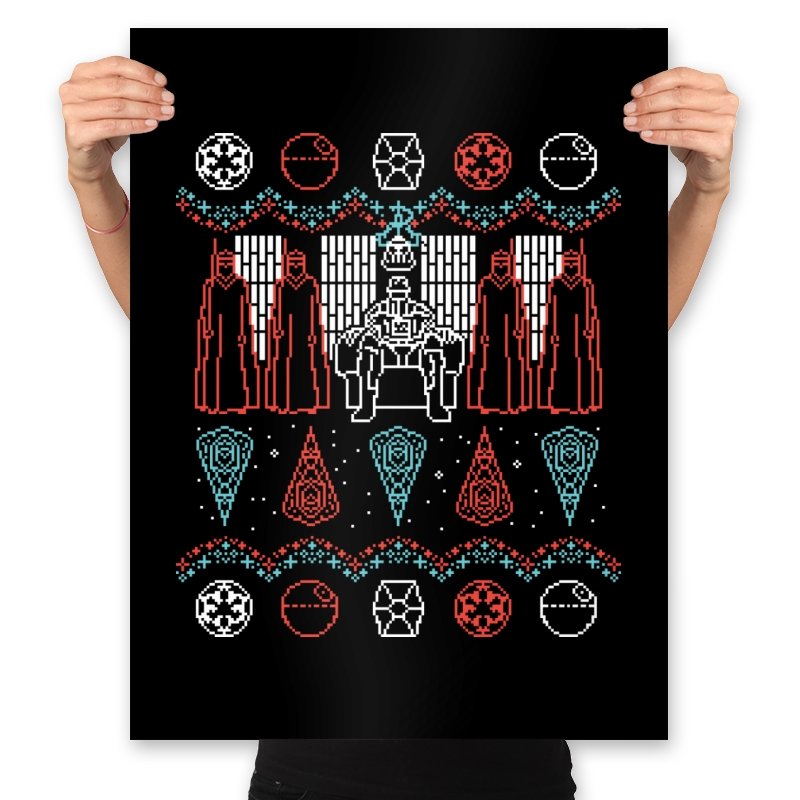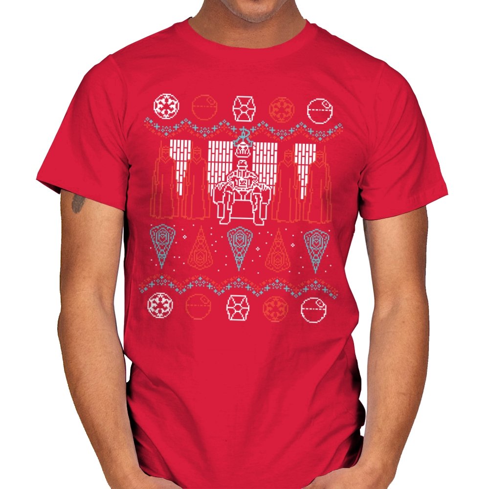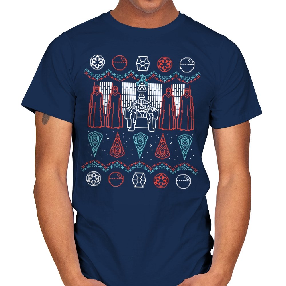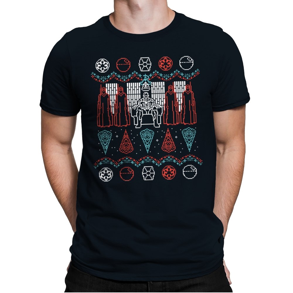 This design turns an ugly holiday sweater into a quiet meditation on power, symmetry, and control. A central armored figure sits rigid on a throne, flanked by robed silhouettes that mirror each other like ritual guardians. Above and below, repeating icons and sharp geometric patterns replace snowflakes with something more ceremonial. It reads like a winter tapestry from a galaxy where warmth is optional and discipline comes first.