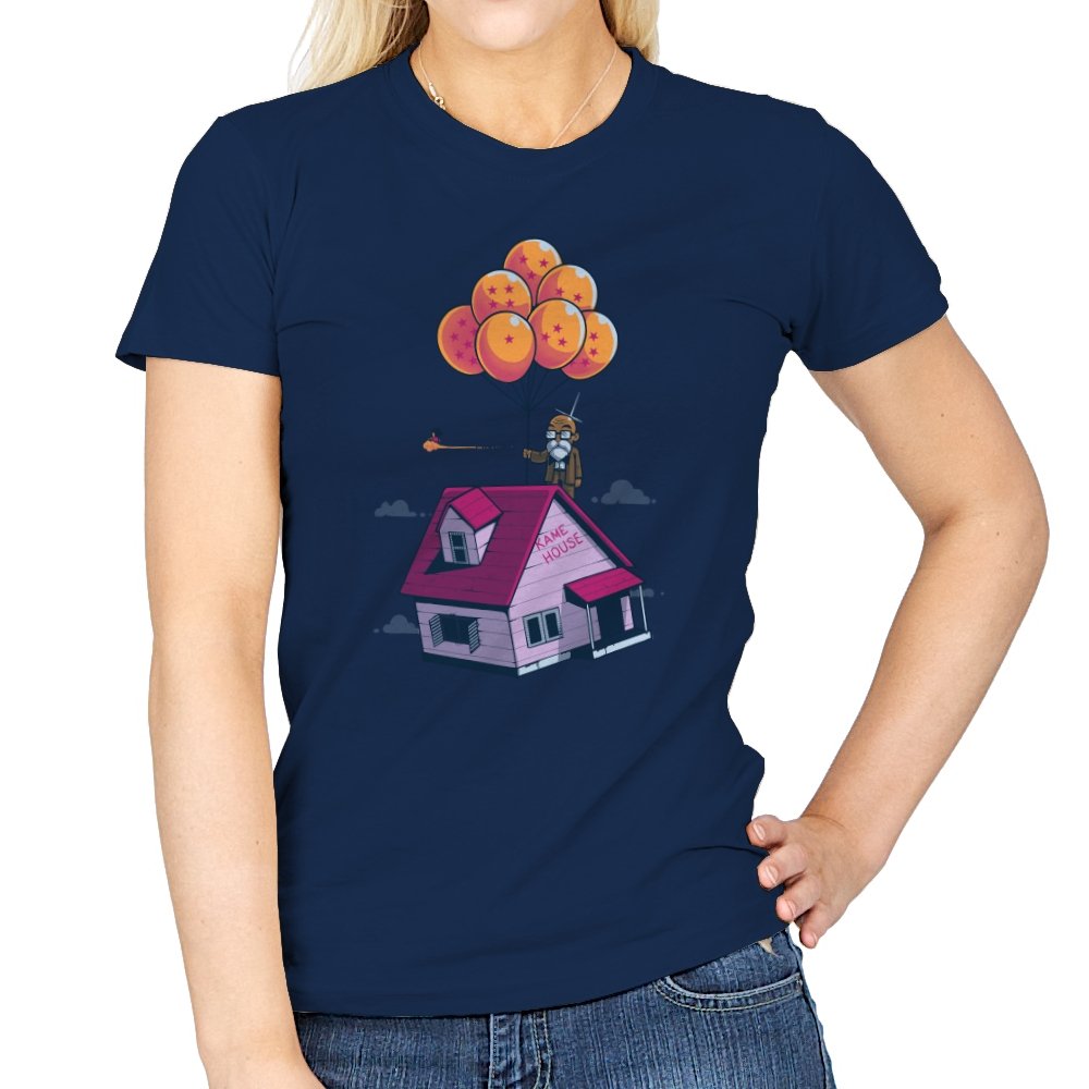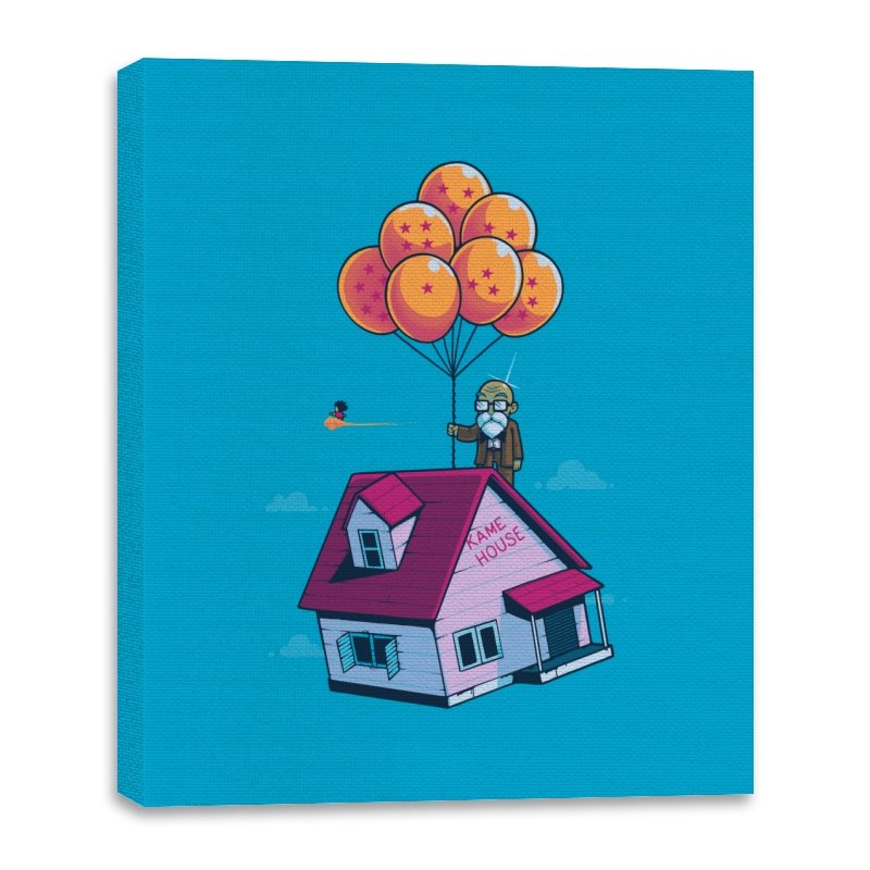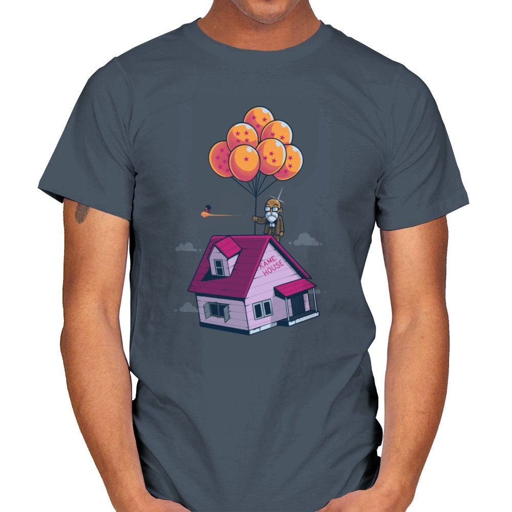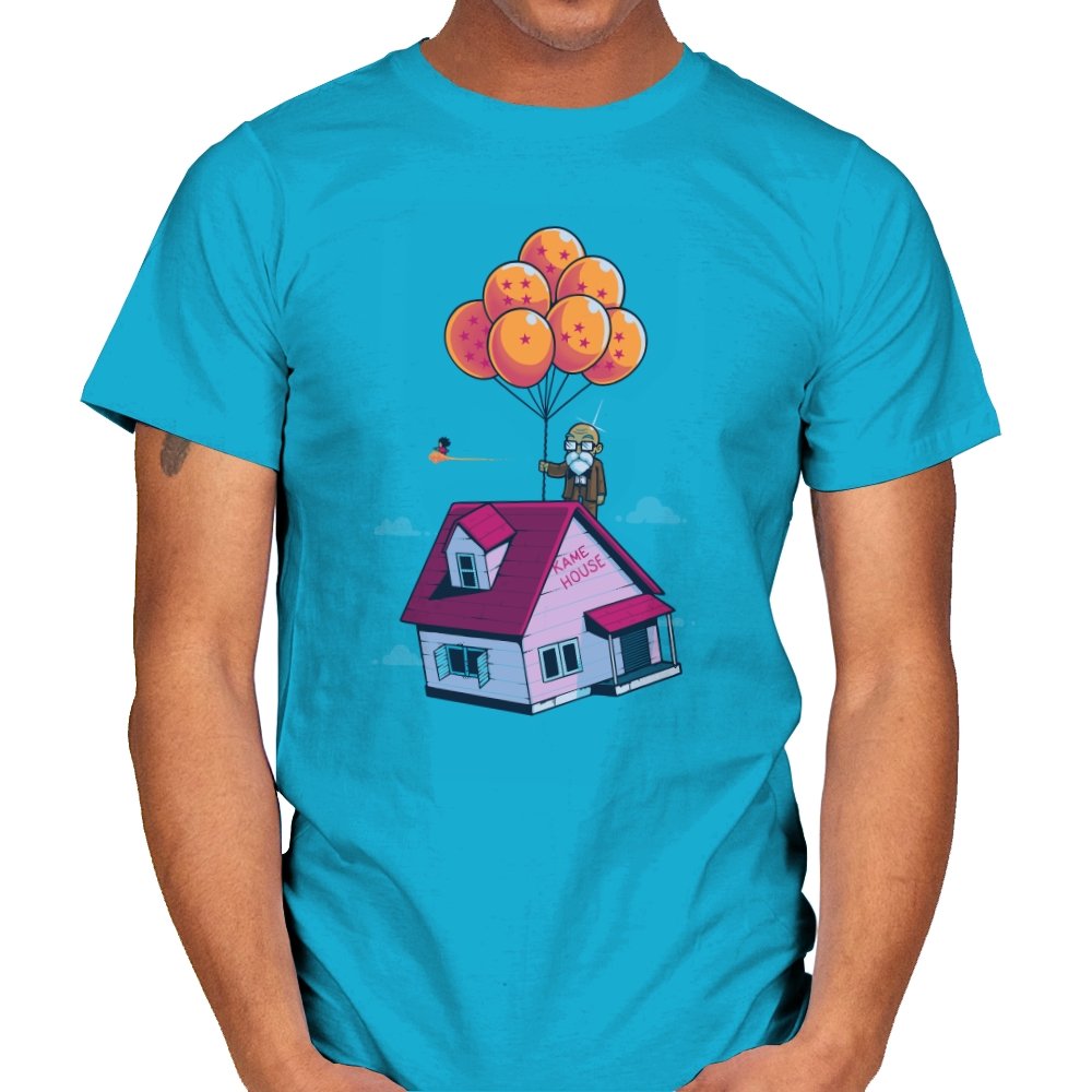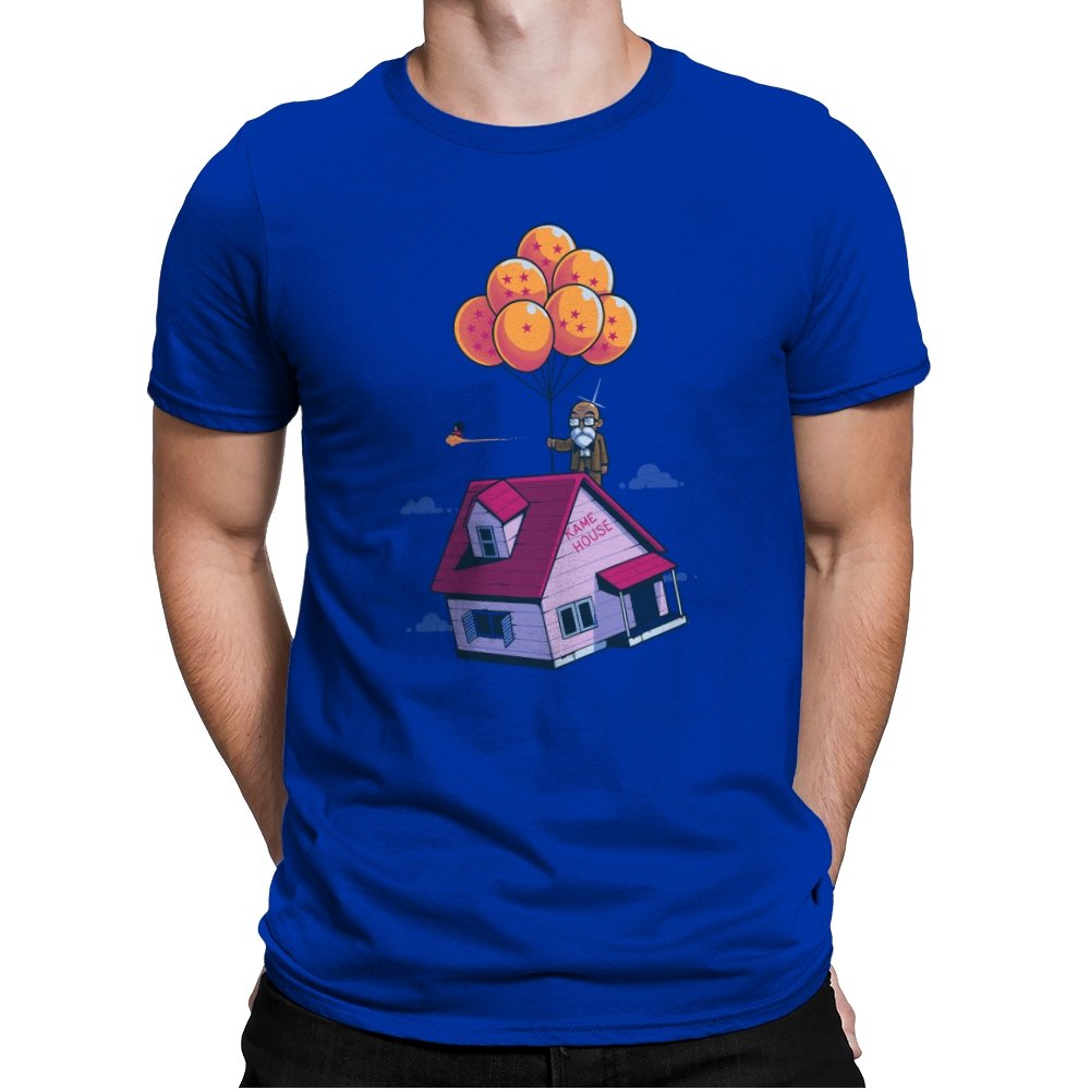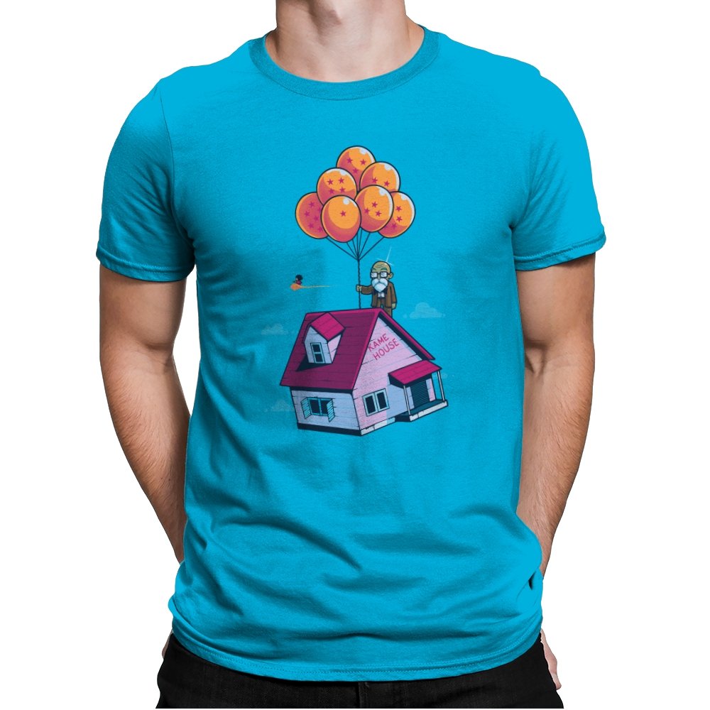 This design blends two beloved worlds into a single, floating image that fans instantly recognize. A small seaside house rises into a bright blue sky, lifted by a cluster of orange, star marked balloons. The quiet absurdity feels equal parts adventure, nostalgia, and gentle parody. It captures that moment where childhood wonder meets long earned wisdom.