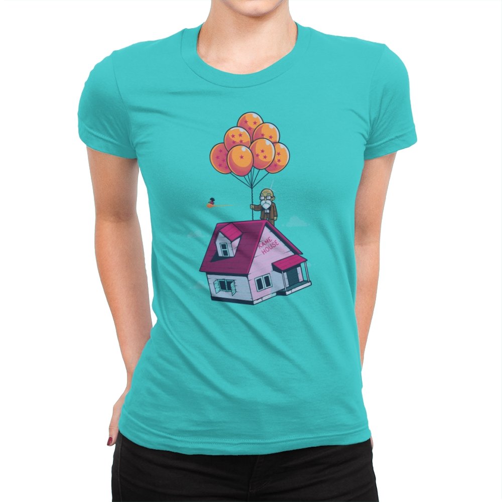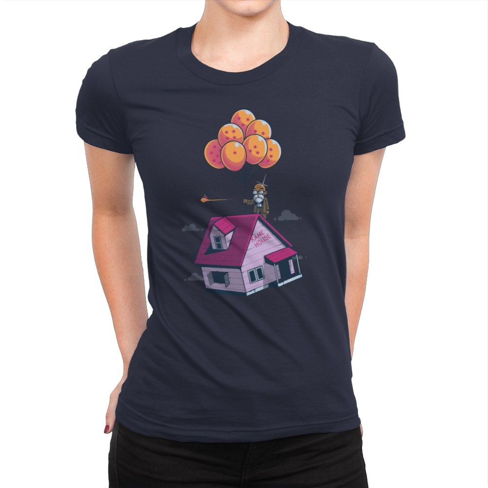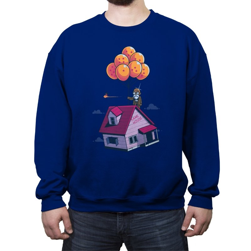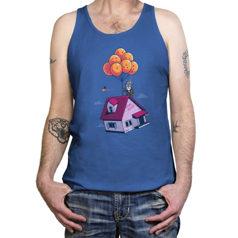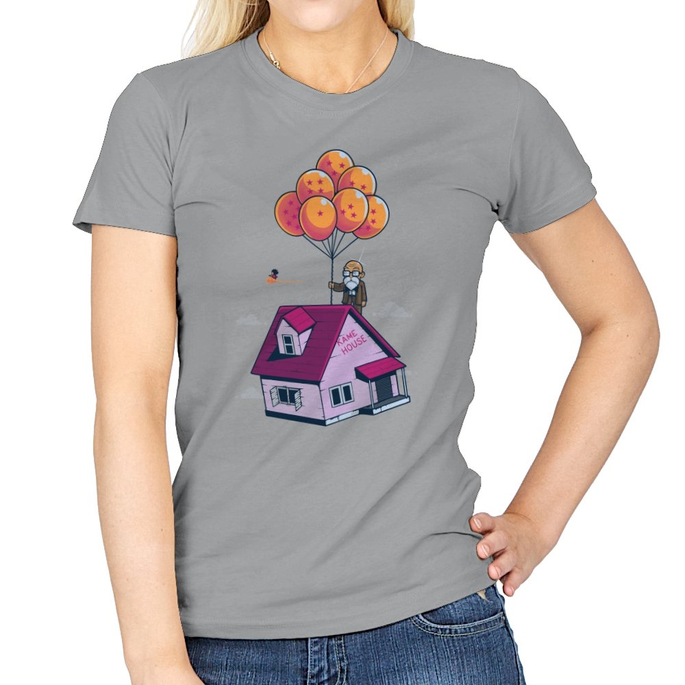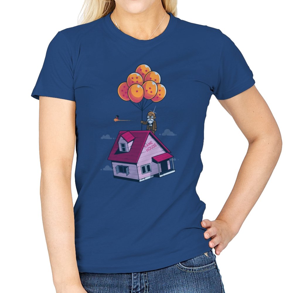 This design blends two beloved worlds into a single, floating image that fans instantly recognize. A small seaside house rises into a bright blue sky, lifted by a cluster of orange, star marked balloons. The quiet absurdity feels equal parts adventure, nostalgia, and gentle parody. It captures that moment where childhood wonder meets long earned wisdom.