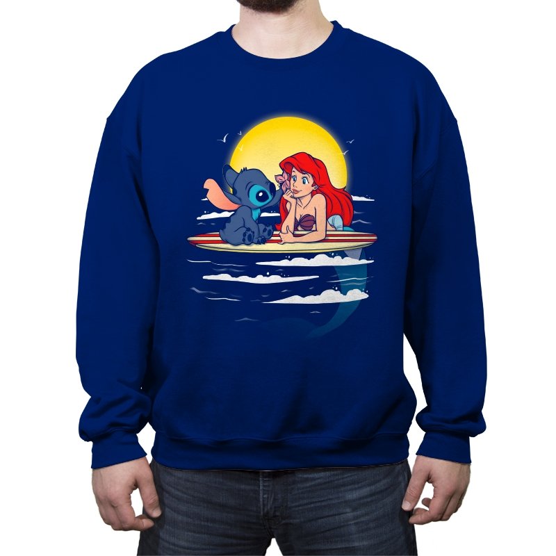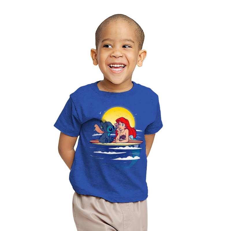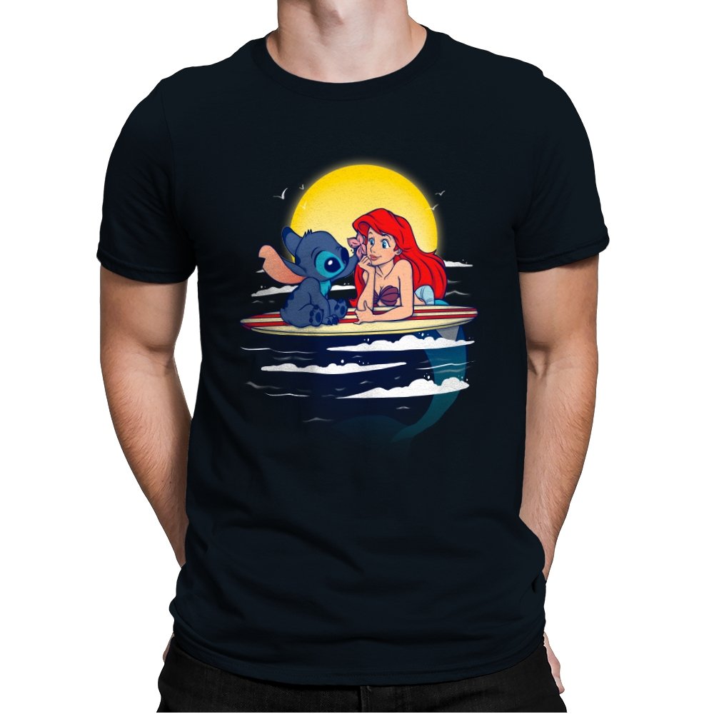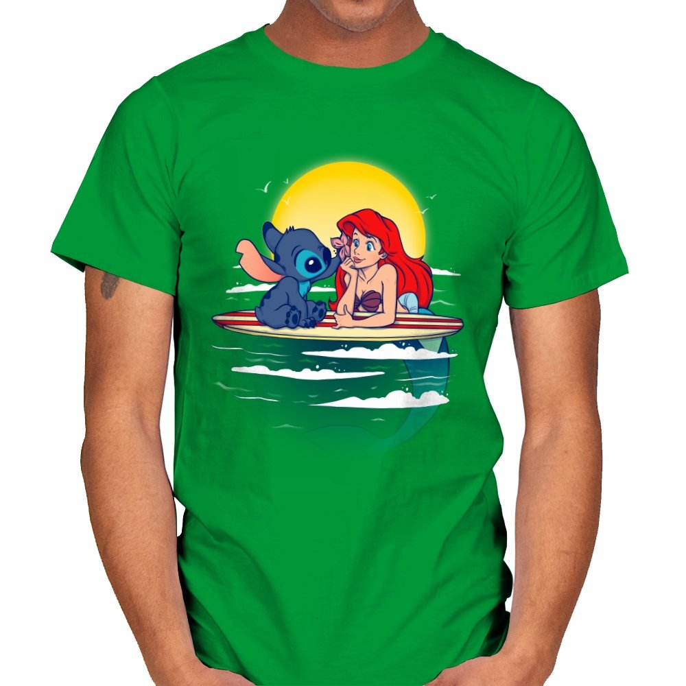 This design brings two misfit icons together on a calm ocean at sunset. One is wide eyed and stitched together for chaos, the other is curious and mythic with bright red hair and a hidden tail. They balance on a striped surfboard as waves glow beneath them and seabirds wheel overhead. The moment feels like a crossover that should not work but somehow does. Fans will recognize the references immediately and smile at how natural the conversation between worlds feels.