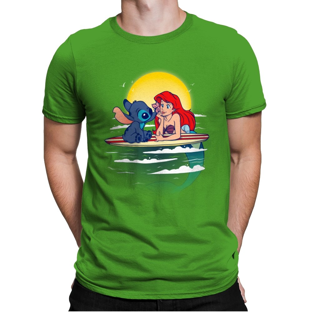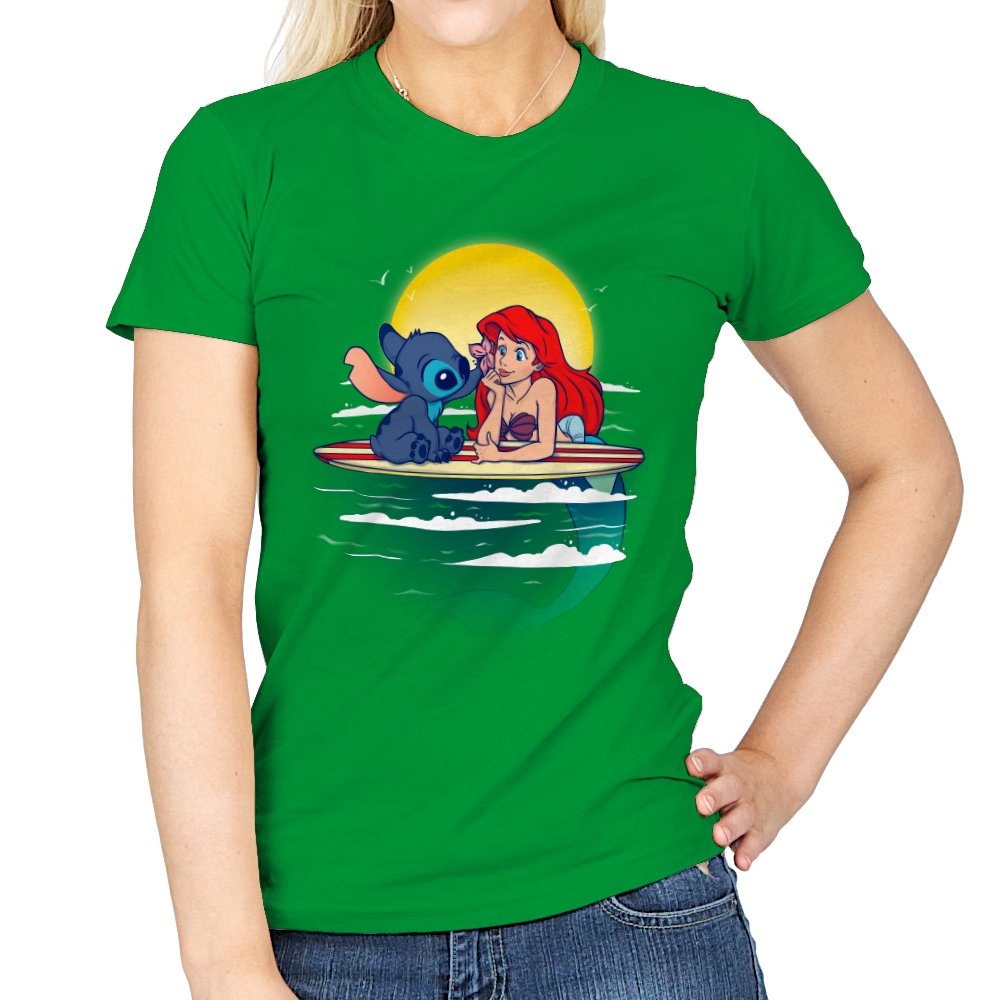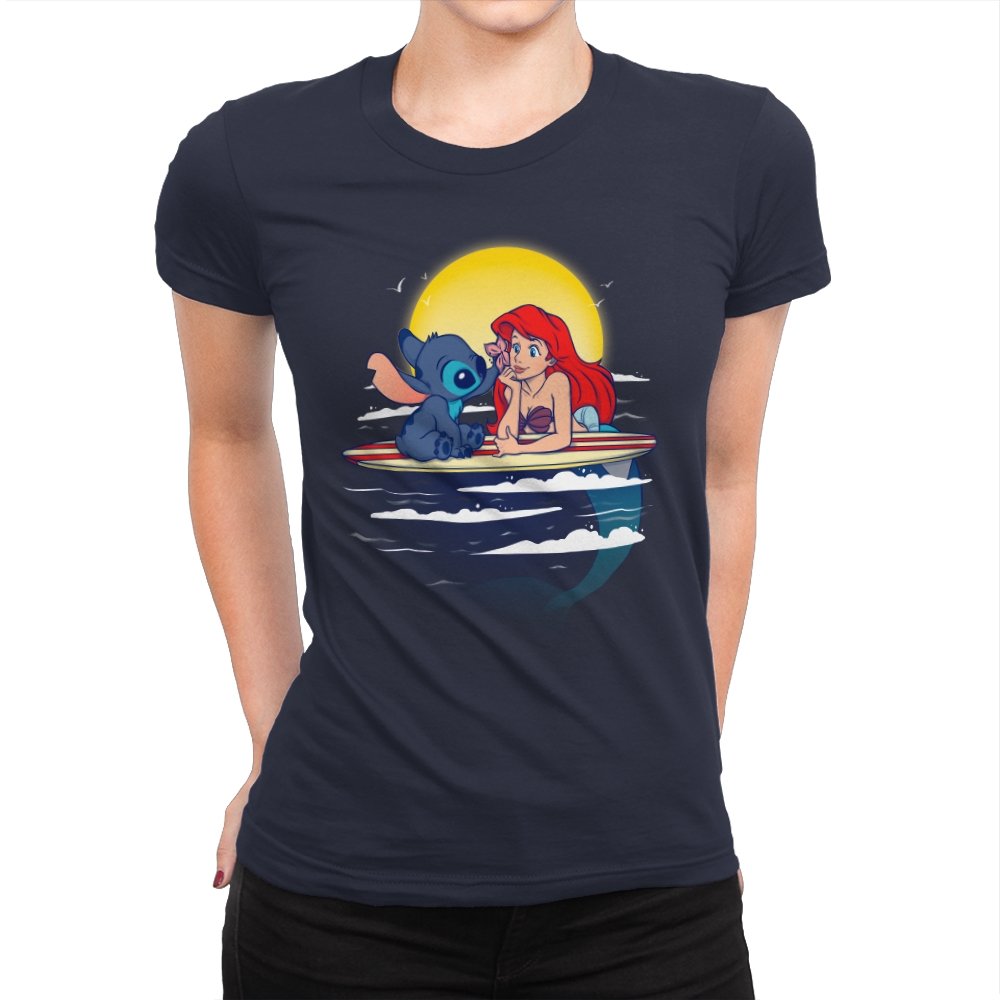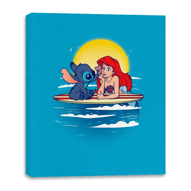 This design brings two misfit icons together on a calm ocean at sunset. One is wide eyed and stitched together for chaos, the other is curious and mythic with bright red hair and a hidden tail. They balance on a striped surfboard as waves glow beneath them and seabirds wheel overhead. The moment feels like a crossover that should not work but somehow does. Fans will recognize the references immediately and smile at how natural the conversation between worlds feels.