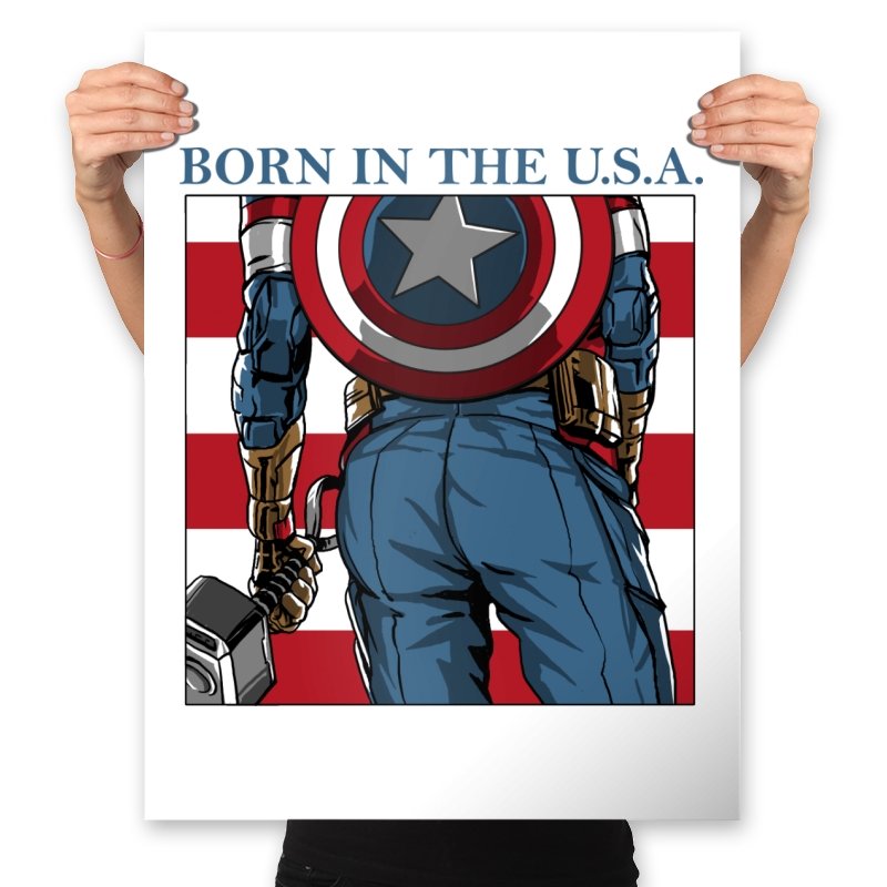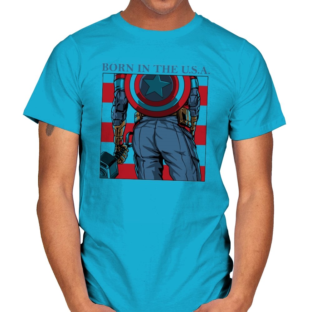 This design frames a familiar hero from the most confident angle possible, letting posture do the talking. The shield rests high, the hammer hangs low, and the striped backdrop locks the moment in place like a vintage poster. It is playful without being loud, leaning into self-awareness rather than spectacle. Fans who get the reference understand this as strength mixed with humor, delivered with a straight face.