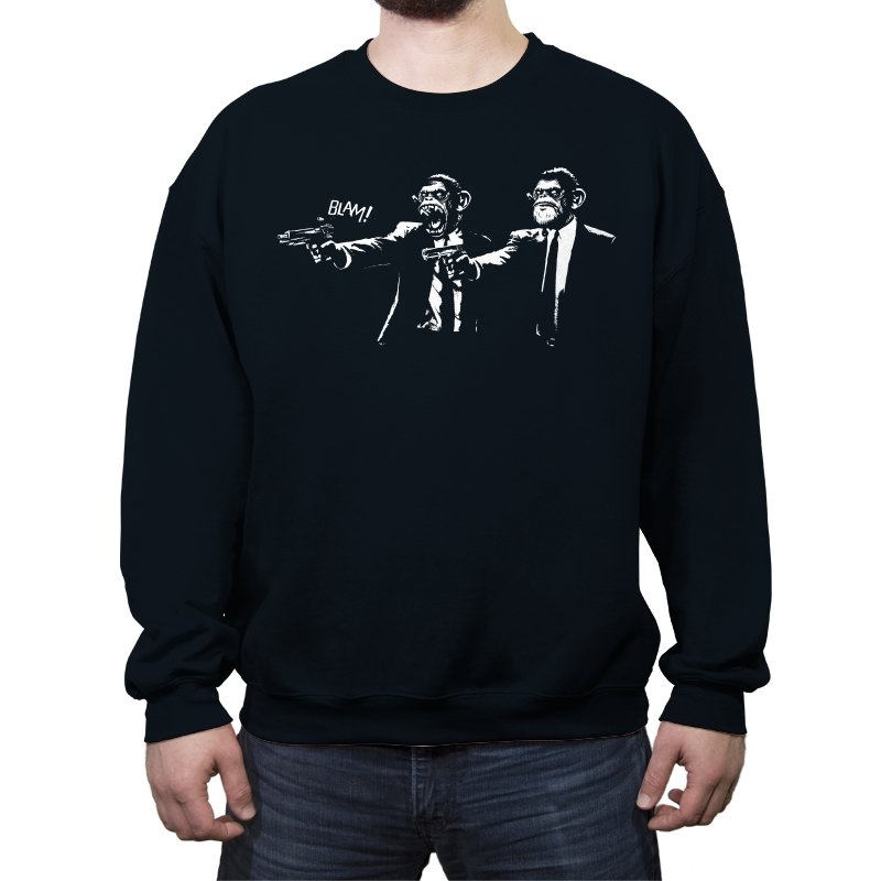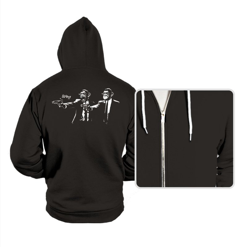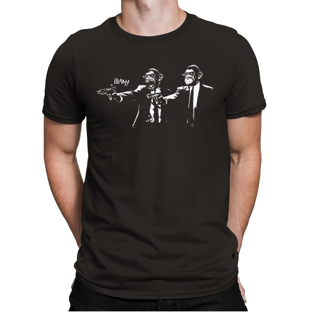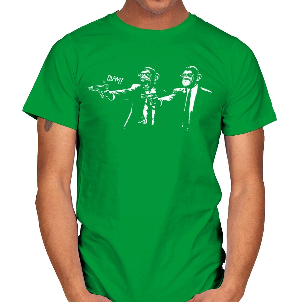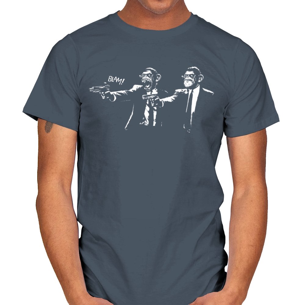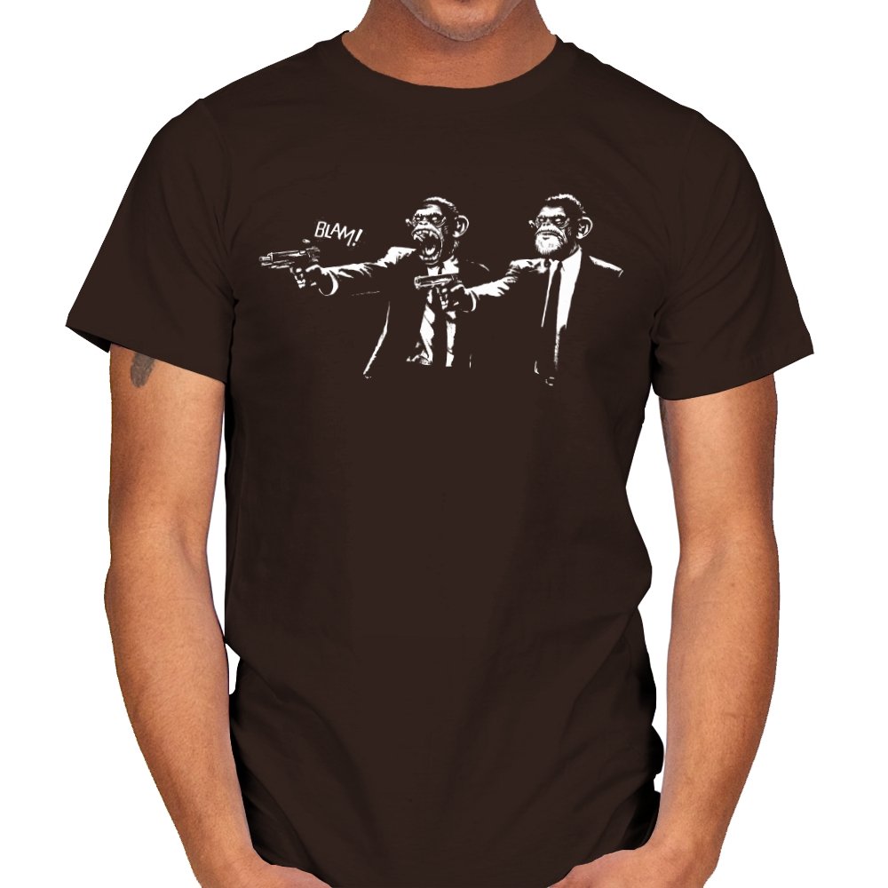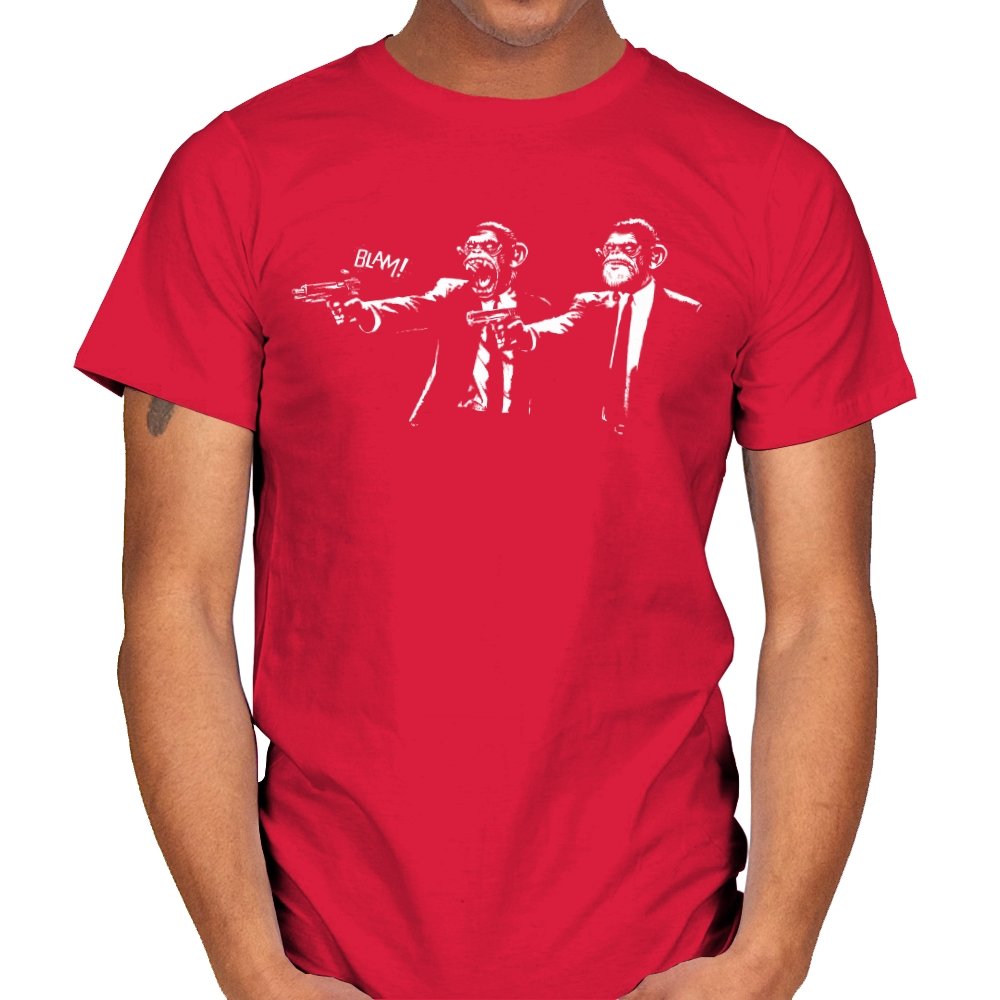 This design flips a familiar crime scene into something more primal, replacing sharp suits and cool detachment with snarling faces and exposed instinct. Two apes stand locked in the same pose you already recognize, guns raised, tension frozen at the moment before consequence. The contrast is the joke and the point, intelligence dressed up as civility, violence barely contained underneath. It is a visual remix that trusts you to catch the reference without spelling it out.