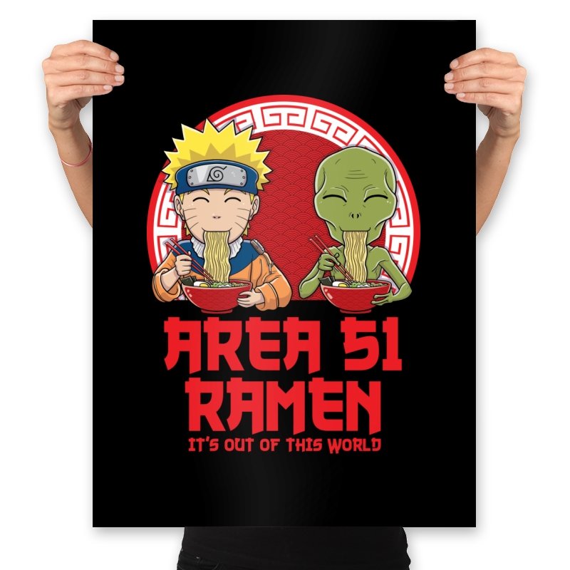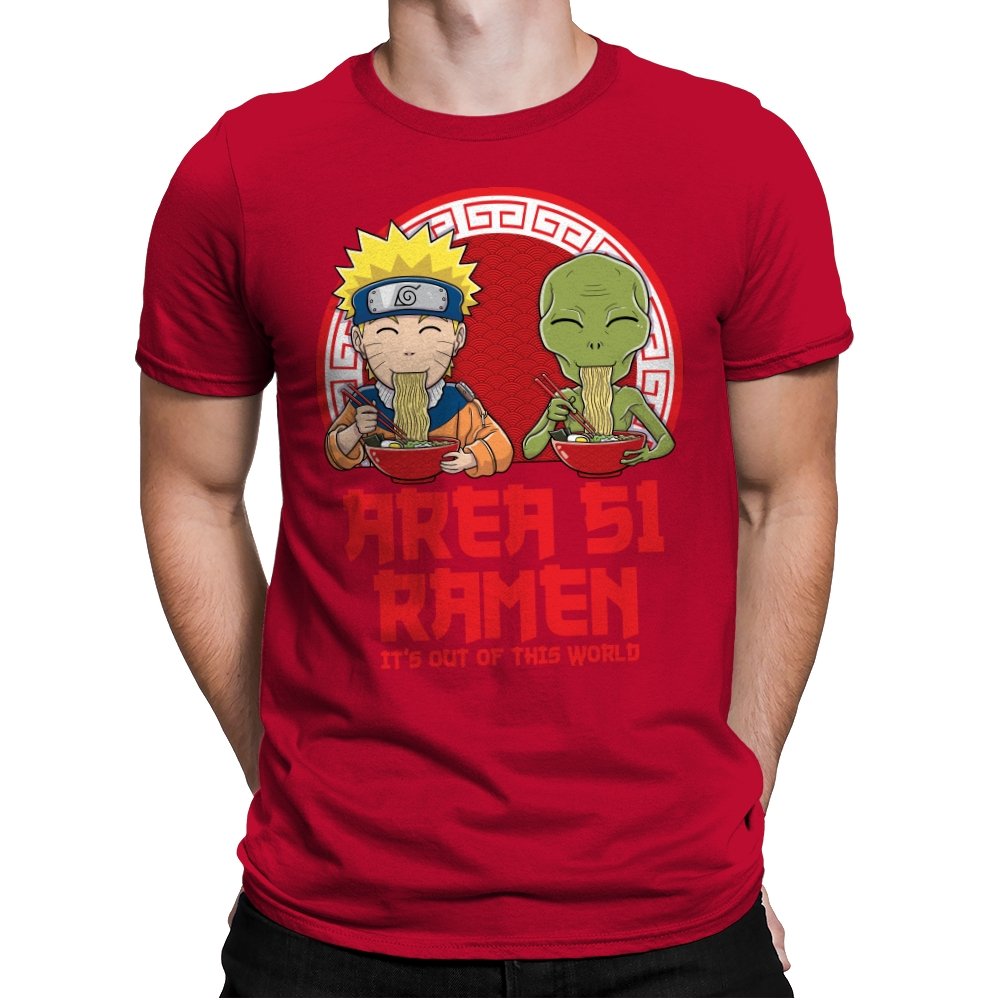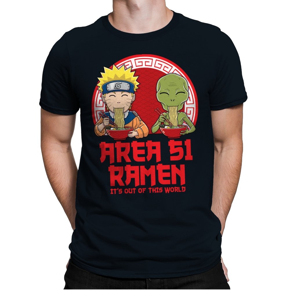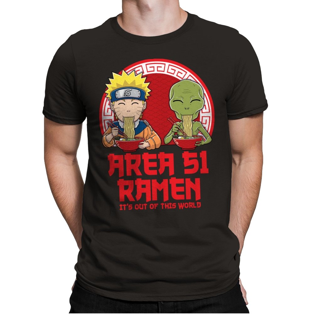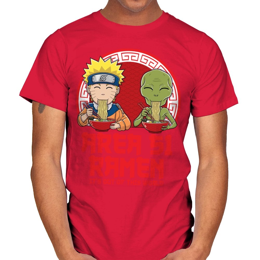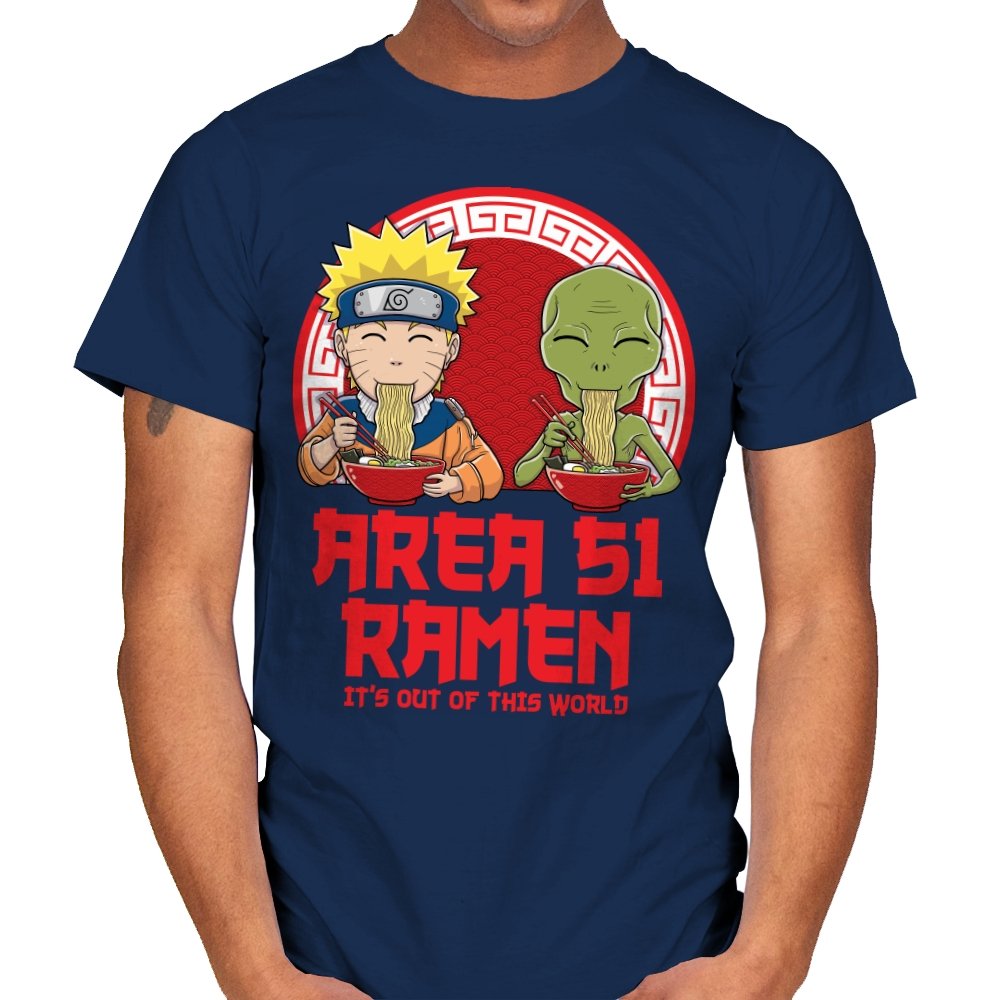 Area 51 Ramen brings together two obsessions that probably deserve their own conspiracy board. The design shows an orange clad ninja prodigy and a big eyed extraterrestrial sharing noodles like it is the most normal thing in the world. A circular bowl motif frames them with a pattern pulled from classic ramen shops, while bold red lettering anchors the joke. Fans instantly recognize both sources and enjoy how quietly the crossover lands.