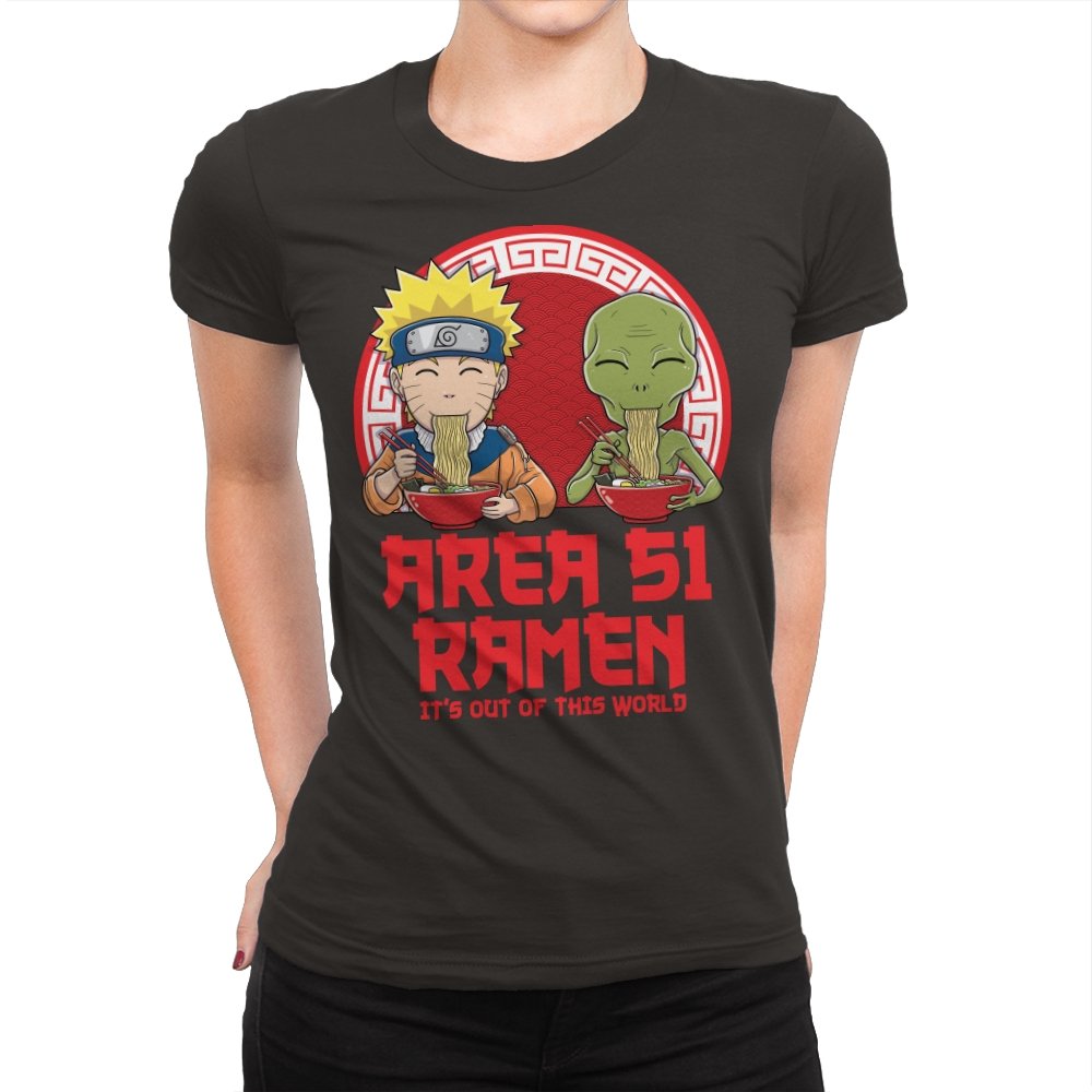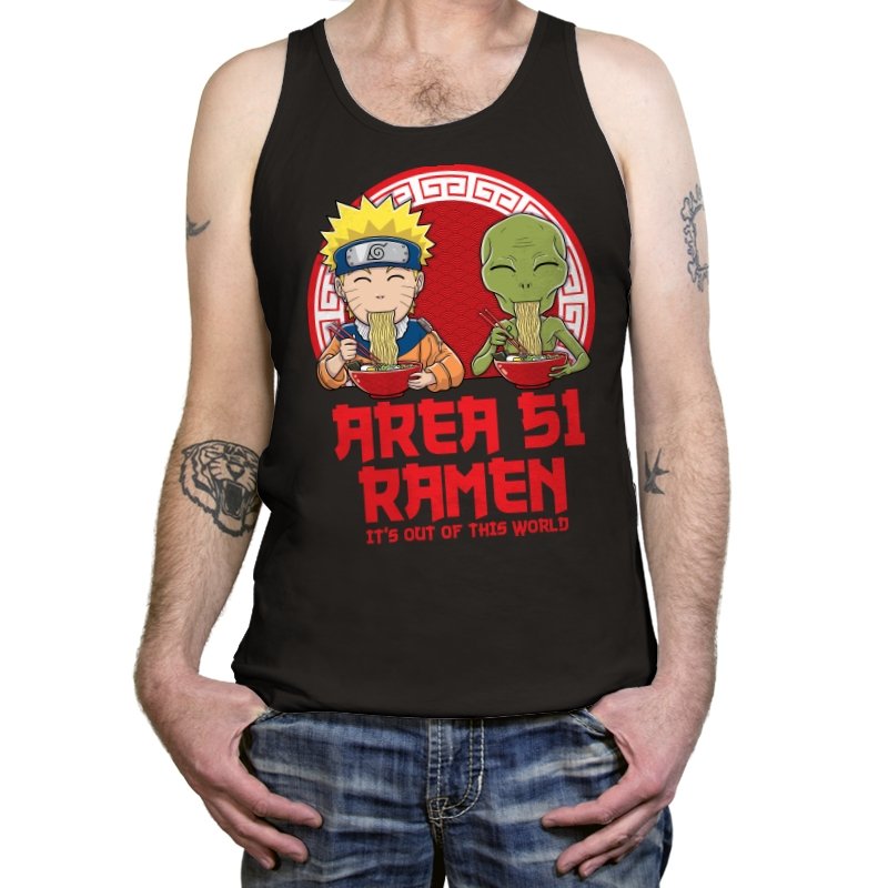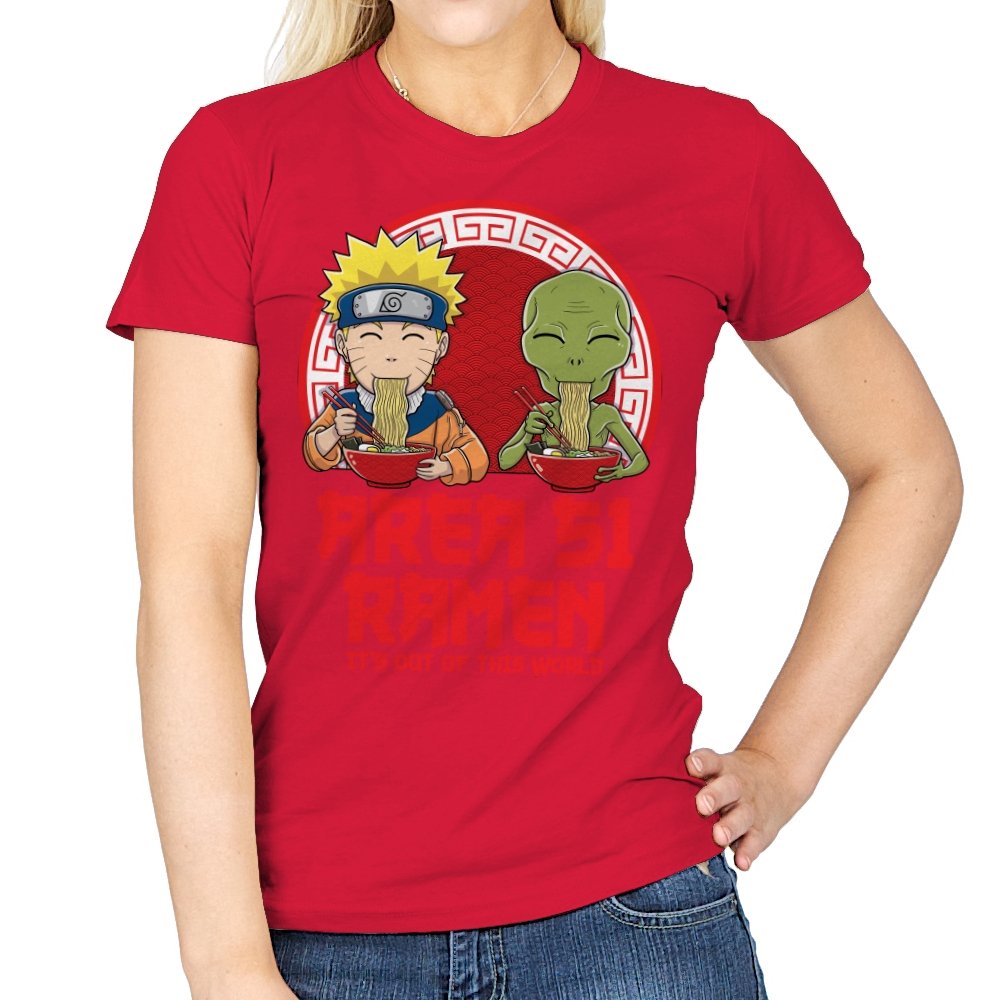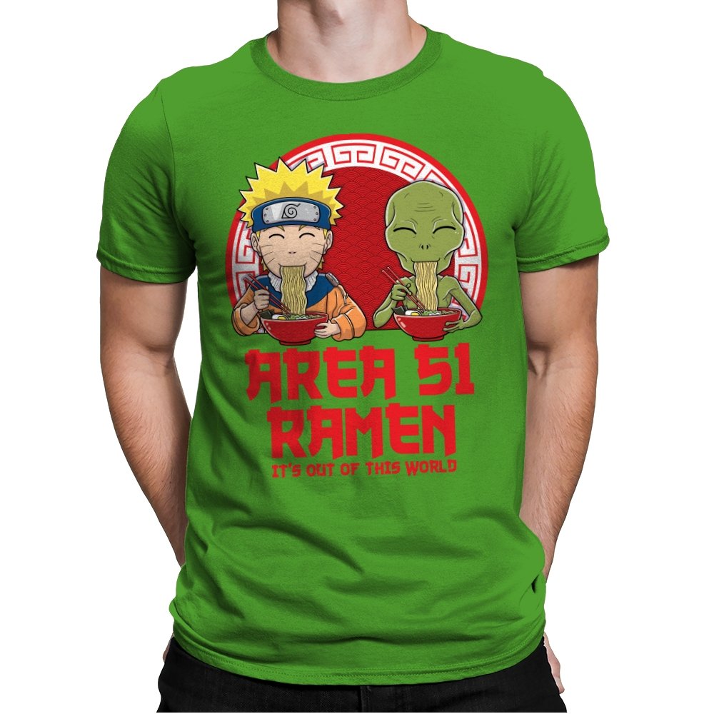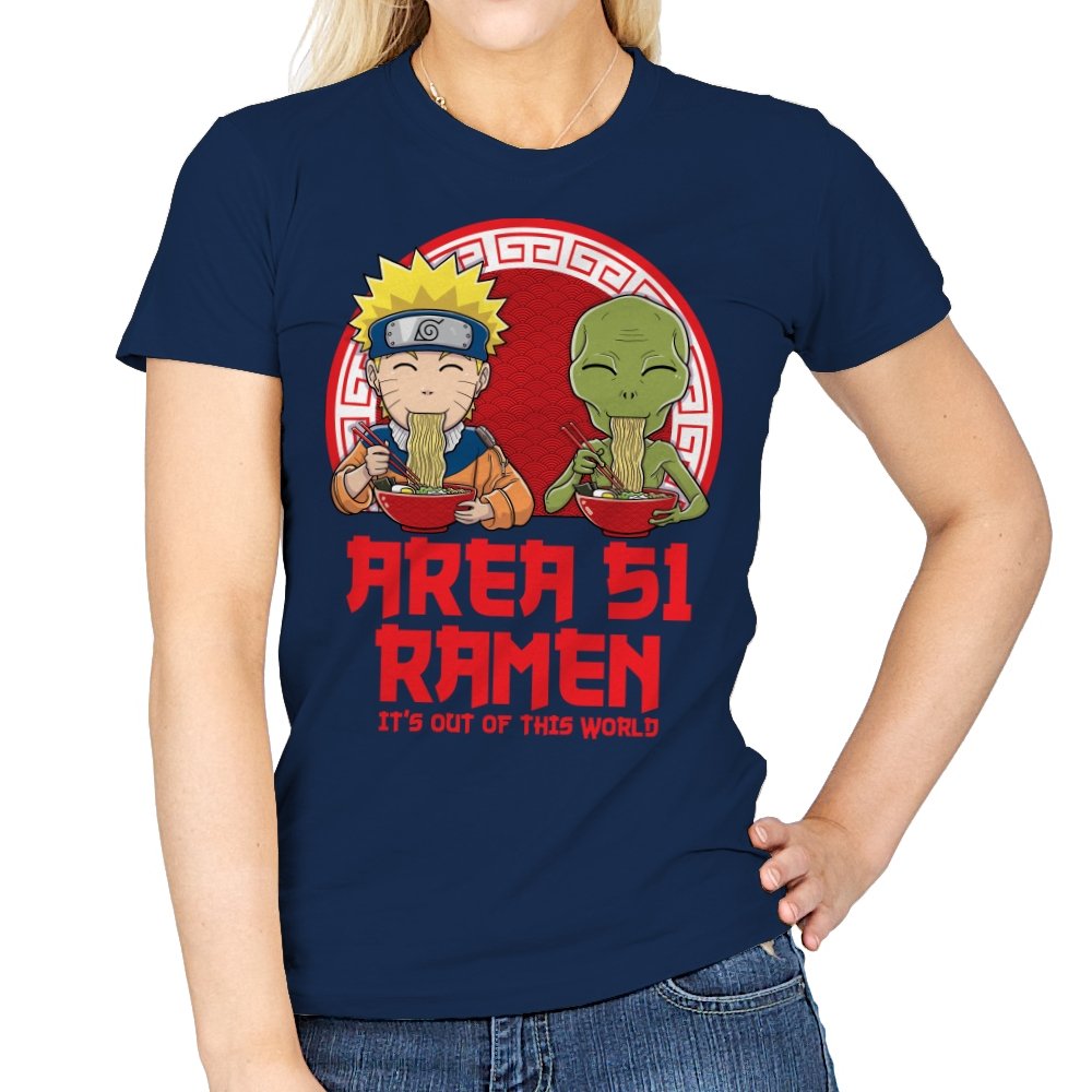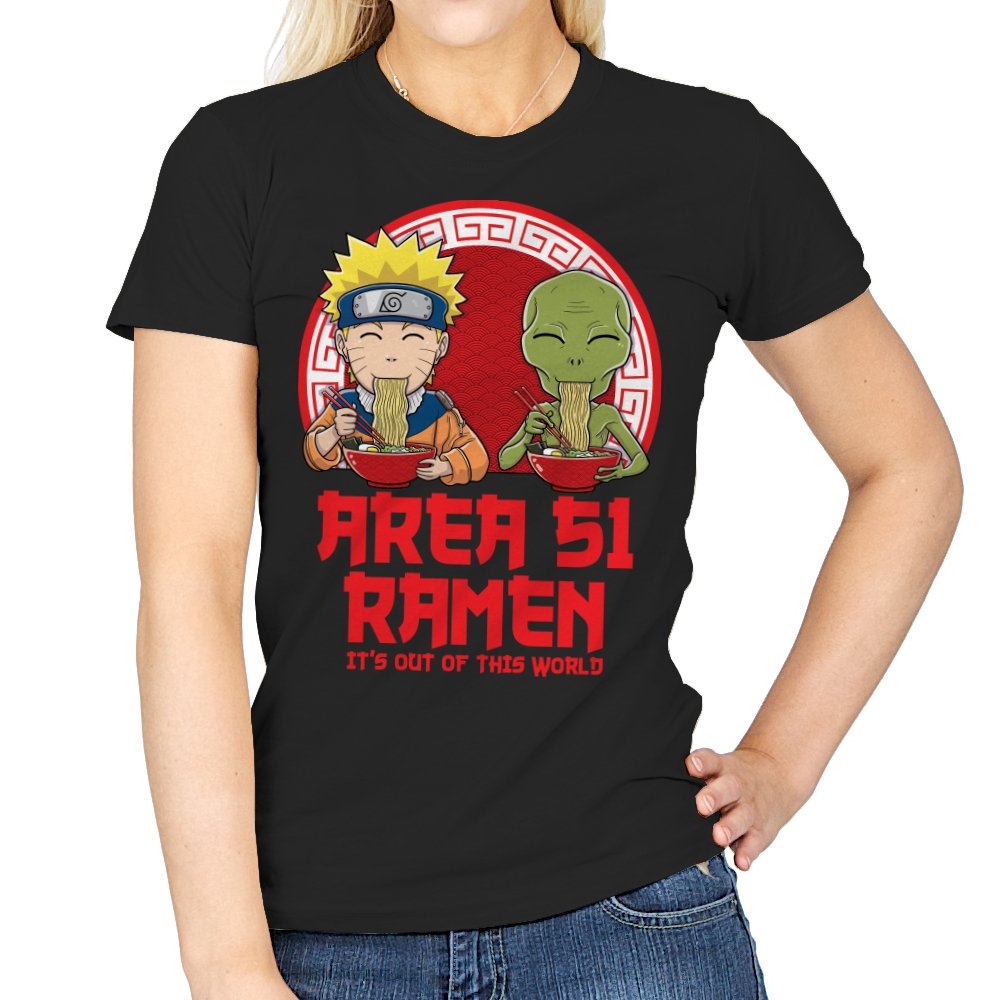 Area 51 Ramen brings together two obsessions that probably deserve their own conspiracy board. The design shows an orange clad ninja prodigy and a big eyed extraterrestrial sharing noodles like it is the most normal thing in the world. A circular bowl motif frames them with a pattern pulled from classic ramen shops, while bold red lettering anchors the joke. Fans instantly recognize both sources and enjoy how quietly the crossover lands.
