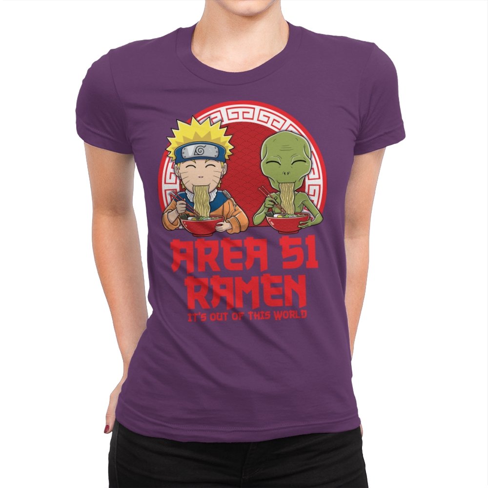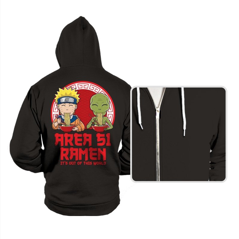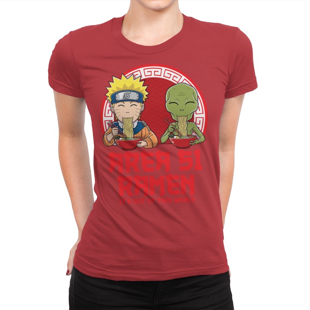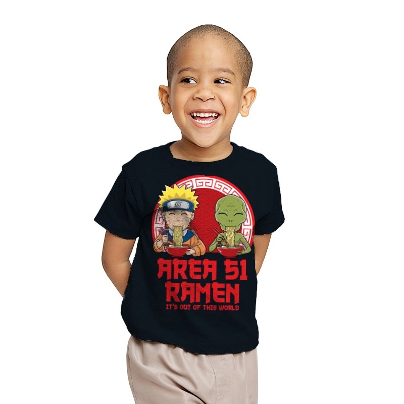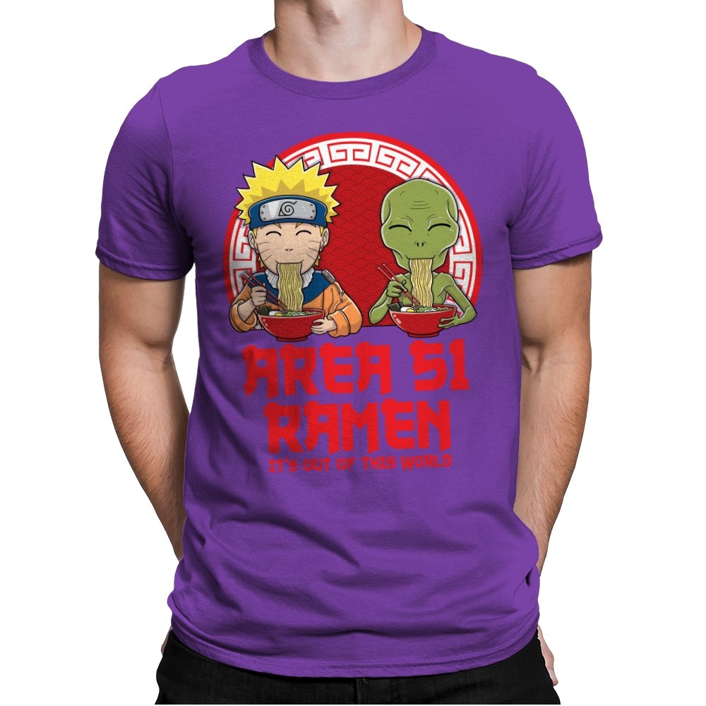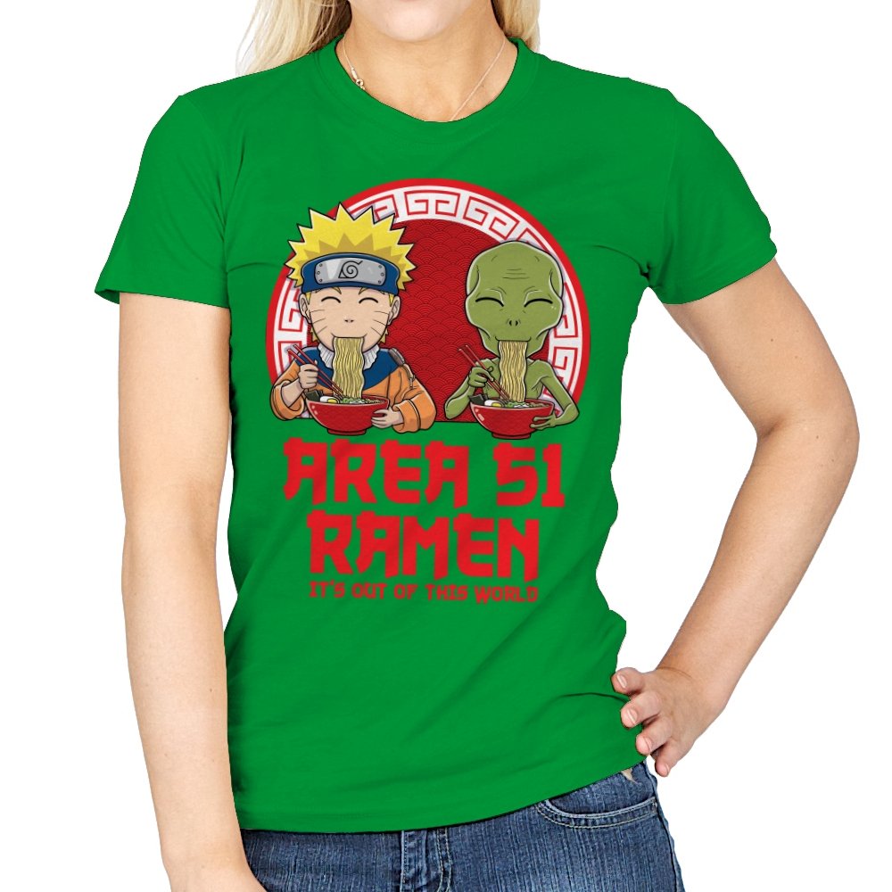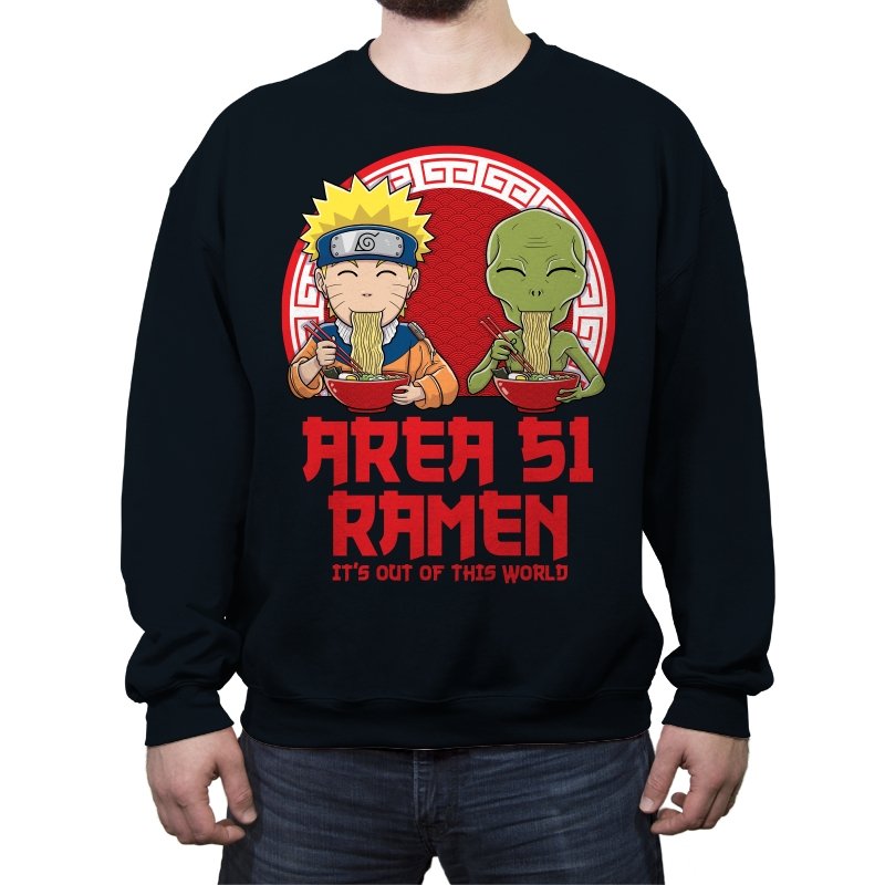 Area 51 Ramen brings together two obsessions that probably deserve their own conspiracy board. The design shows an orange clad ninja prodigy and a big eyed extraterrestrial sharing noodles like it is the most normal thing in the world. A circular bowl motif frames them with a pattern pulled from classic ramen shops, while bold red lettering anchors the joke. Fans instantly recognize both sources and enjoy how quietly the crossover lands.