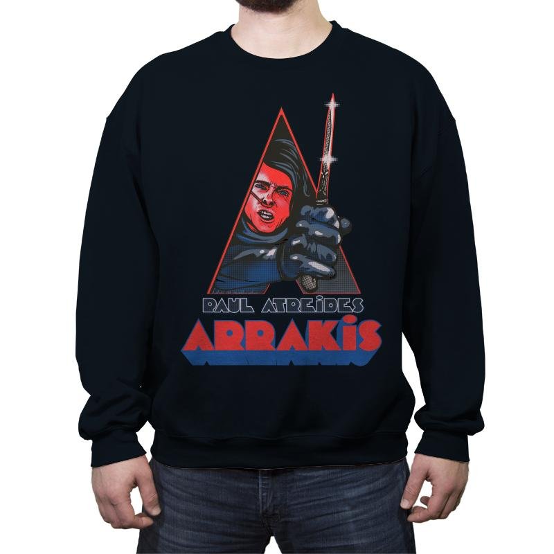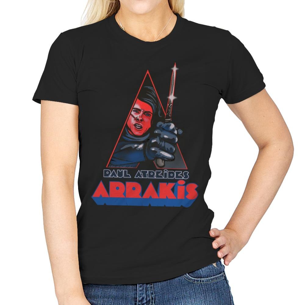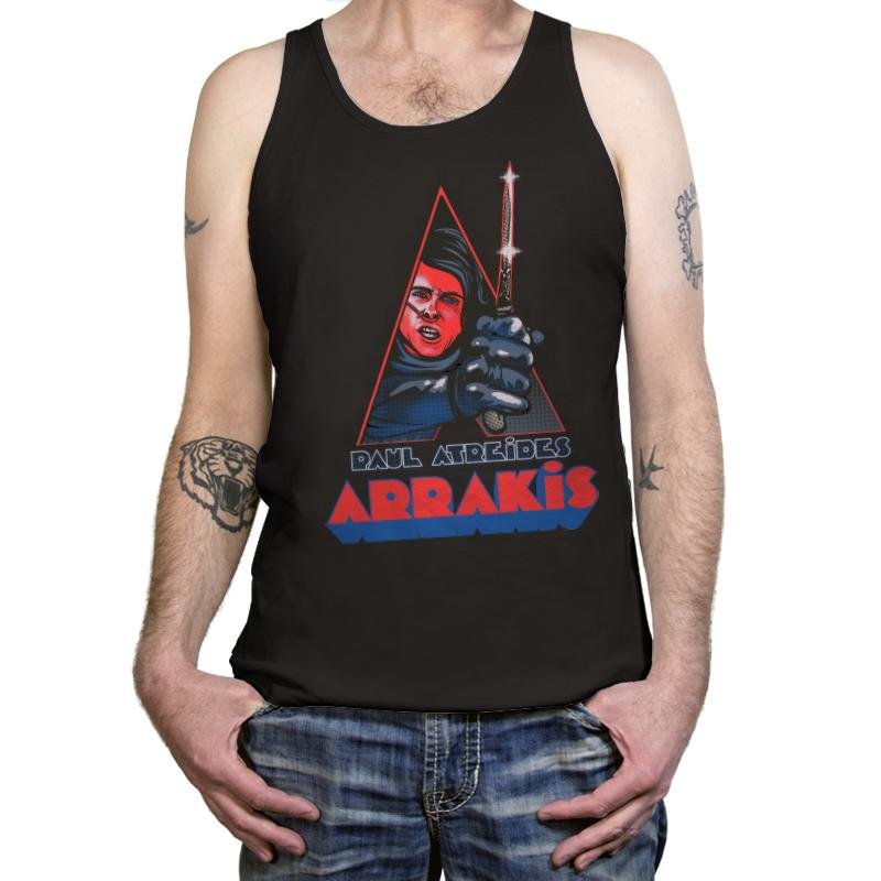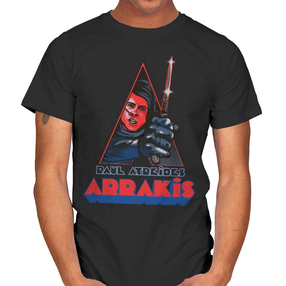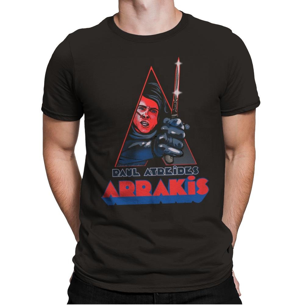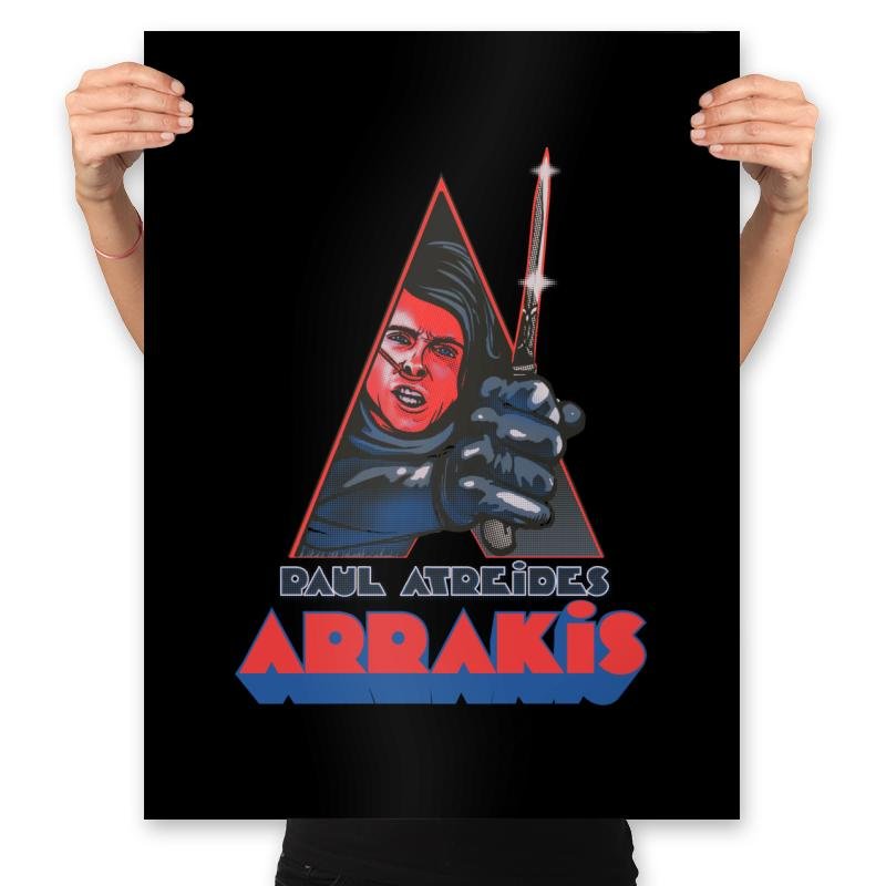 This design blends space mysticism with retro pulp aesthetics. A desert warrior figure snarls from inside a sharp triangular frame, clutching a shimmering blade. The palette leans into vintage print tones, using halftone textures and bold reds that feel ripped from an alternate 80s sci fi shelf. The “Arrakis” title sits below like a theatrical poster that never existed but should have.