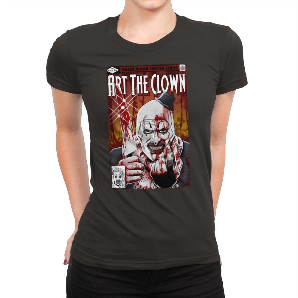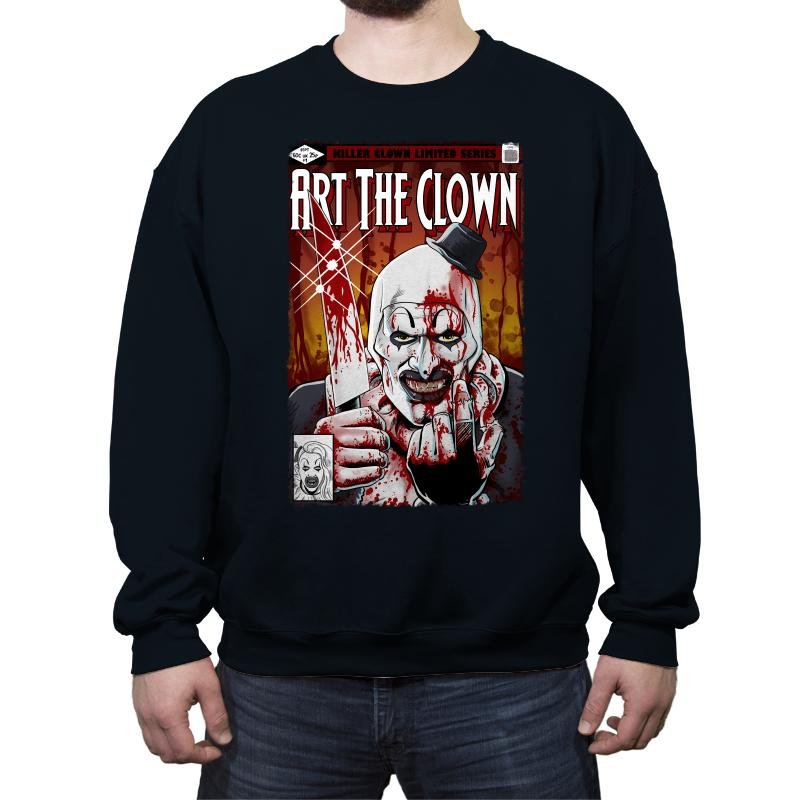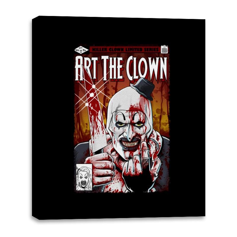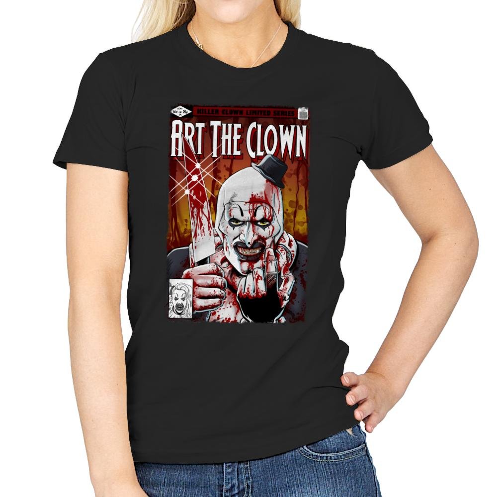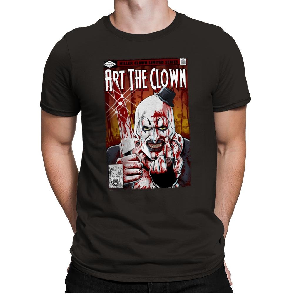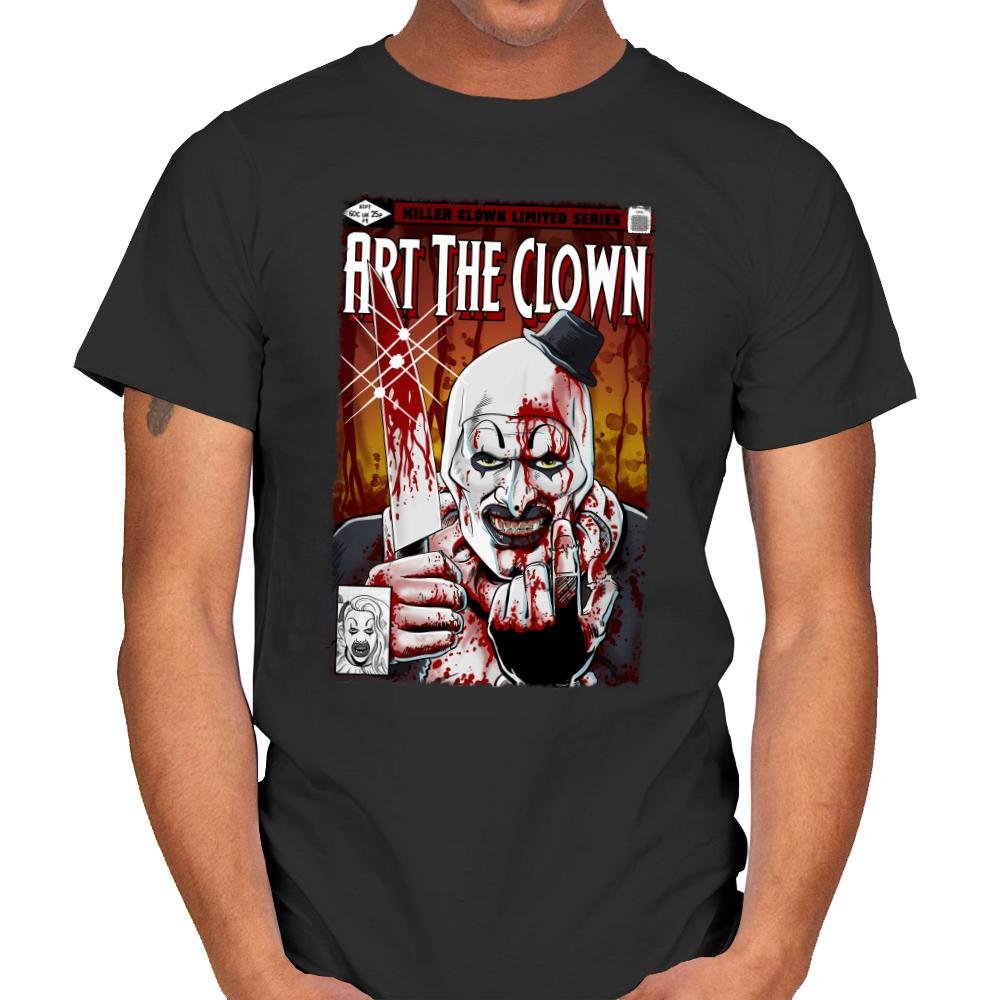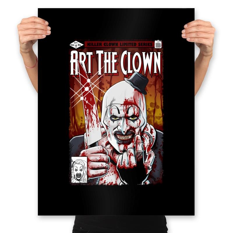 This design presents a brutal comic cover-style portrait of a grinning clown, smeared in red and staring straight through the frame. The heavy shadows, splattered textures, and tight crop give it the feel of a pulp horror issue you were not supposed to find. A small hat, sharp expression, and exaggerated features lock the image in a very specific corner of modern horror. Fans who know the character will recognize the tone instantly.