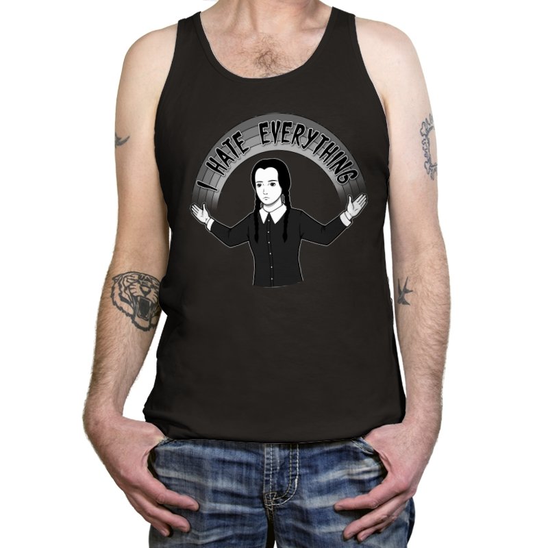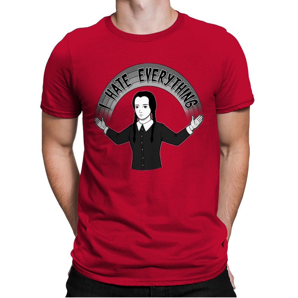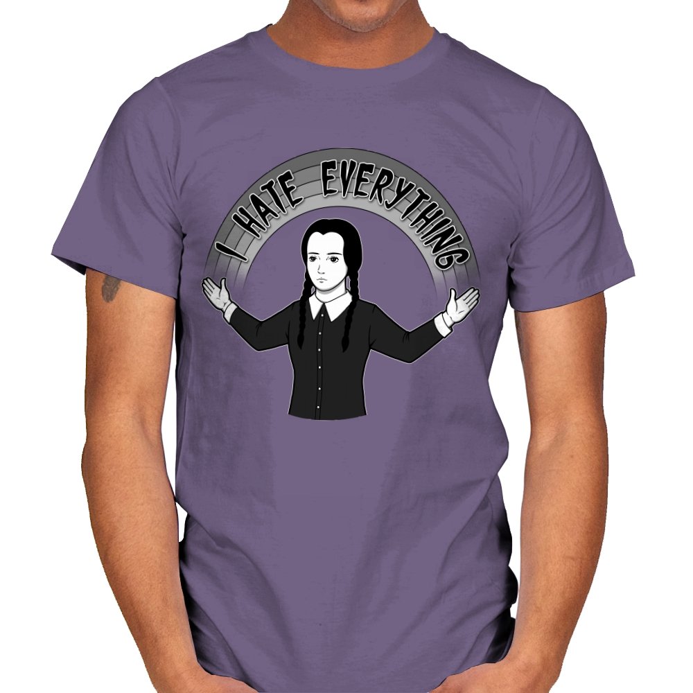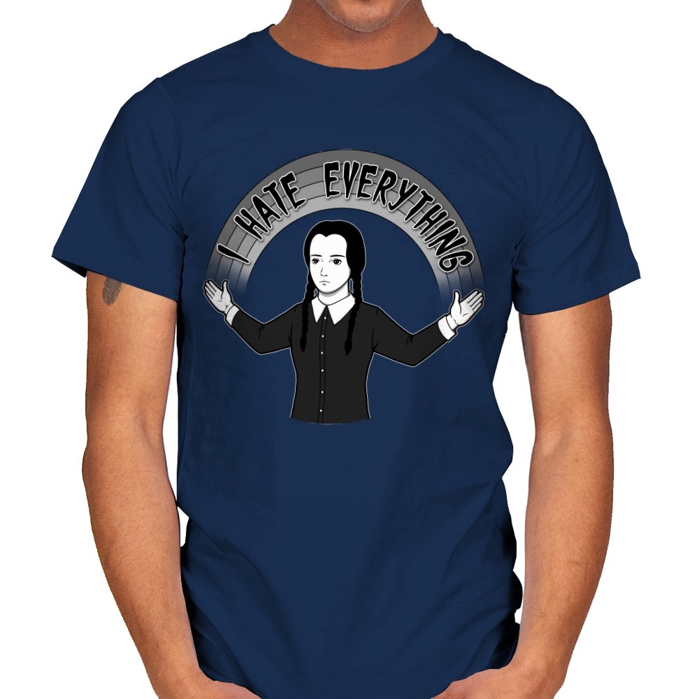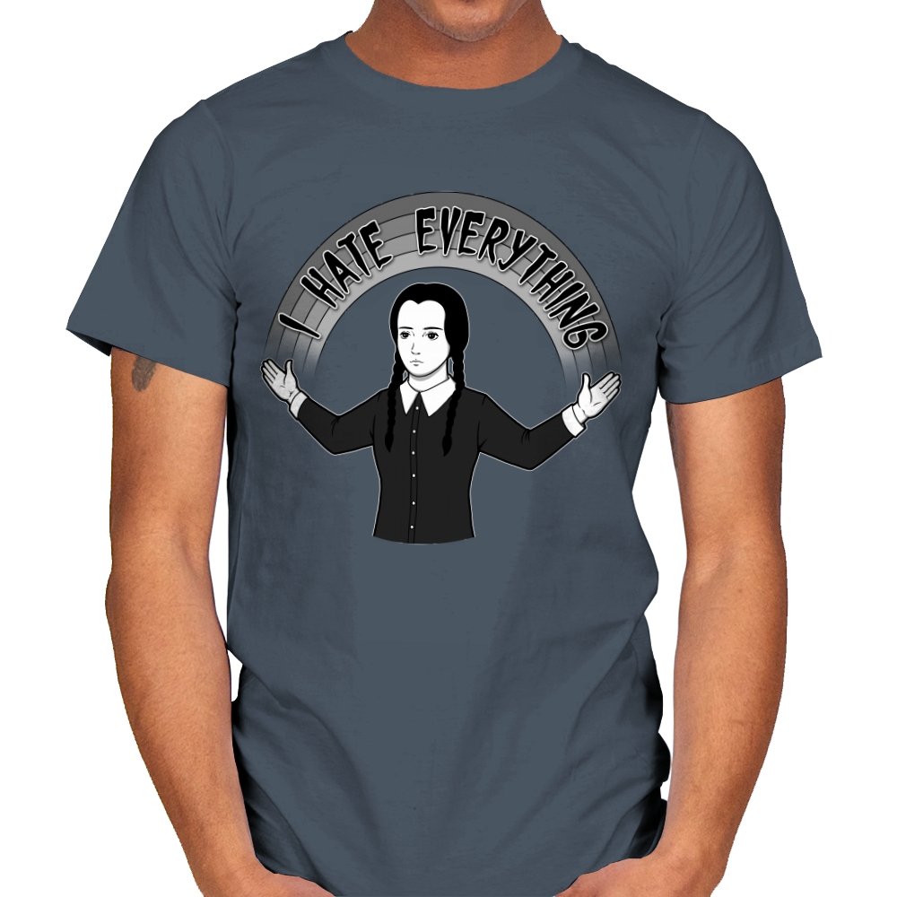 This design channels the iconic dark humor and attitude of the character, featuring a classic image of a character with a strong disdain for everything. The bold text, “I HATE EVERYTHING,” arches over the figure, who stands with arms outstretched, capturing the essence of the character’s sarcastic and rebellious nature. The stark black-and-white style makes the design visually striking, perfect for fans who resonate with that edgy, no-nonsense vibe.
