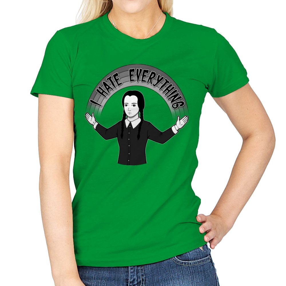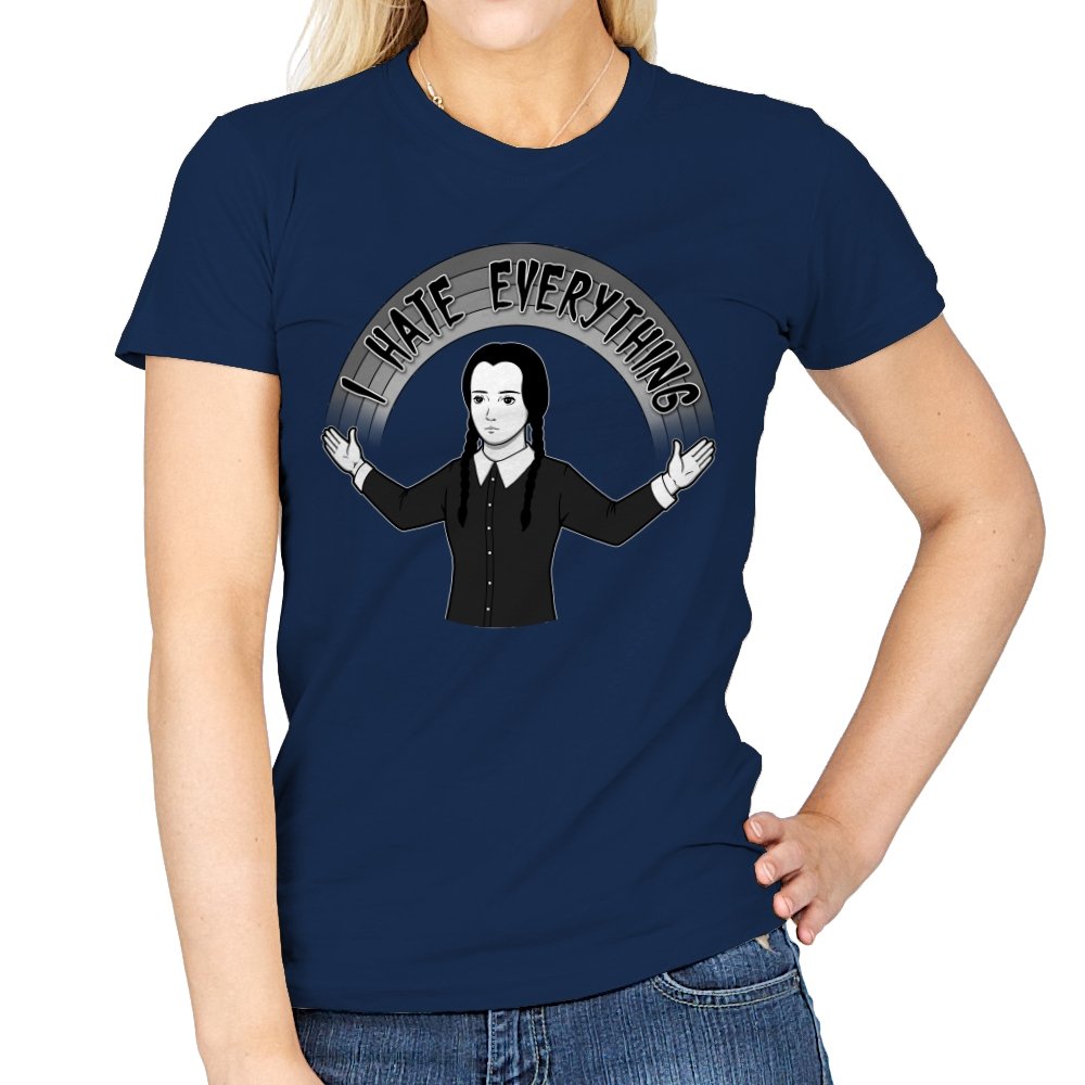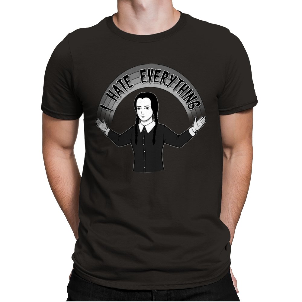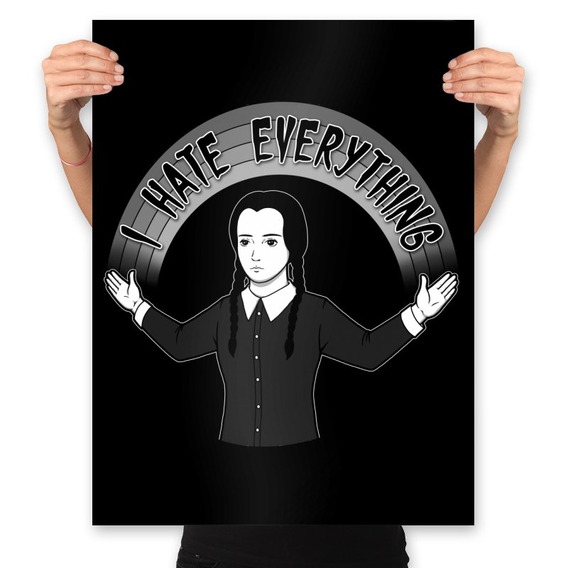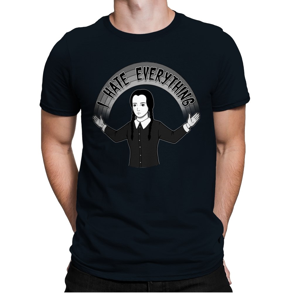 This design channels the iconic dark humor and attitude of the character, featuring a classic image of a character with a strong disdain for everything. The bold text, “I HATE EVERYTHING,” arches over the figure, who stands with arms outstretched, capturing the essence of the character’s sarcastic and rebellious nature. The stark black-and-white style makes the design visually striking, perfect for fans who resonate with that edgy, no-nonsense vibe.