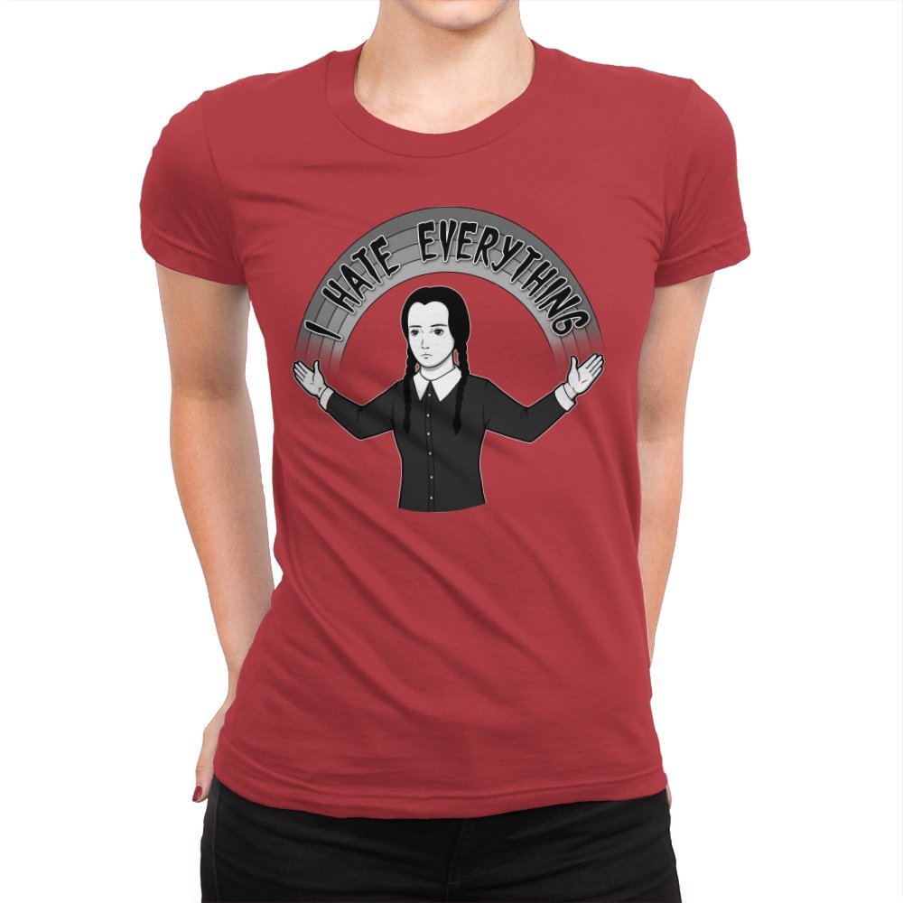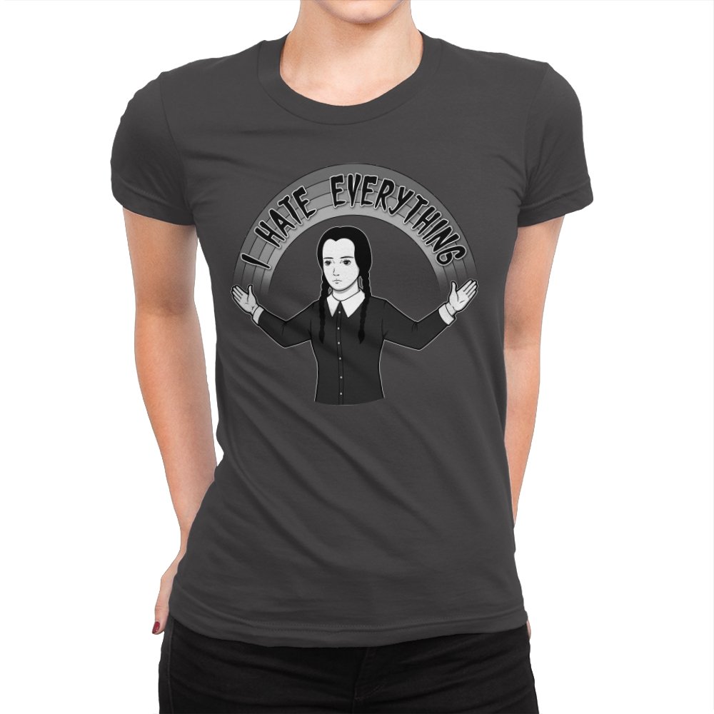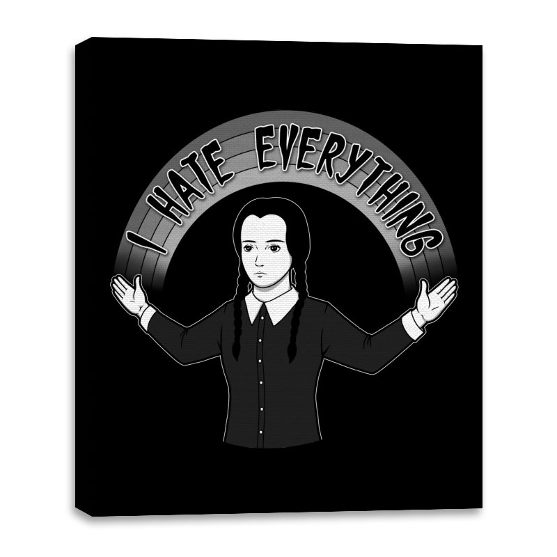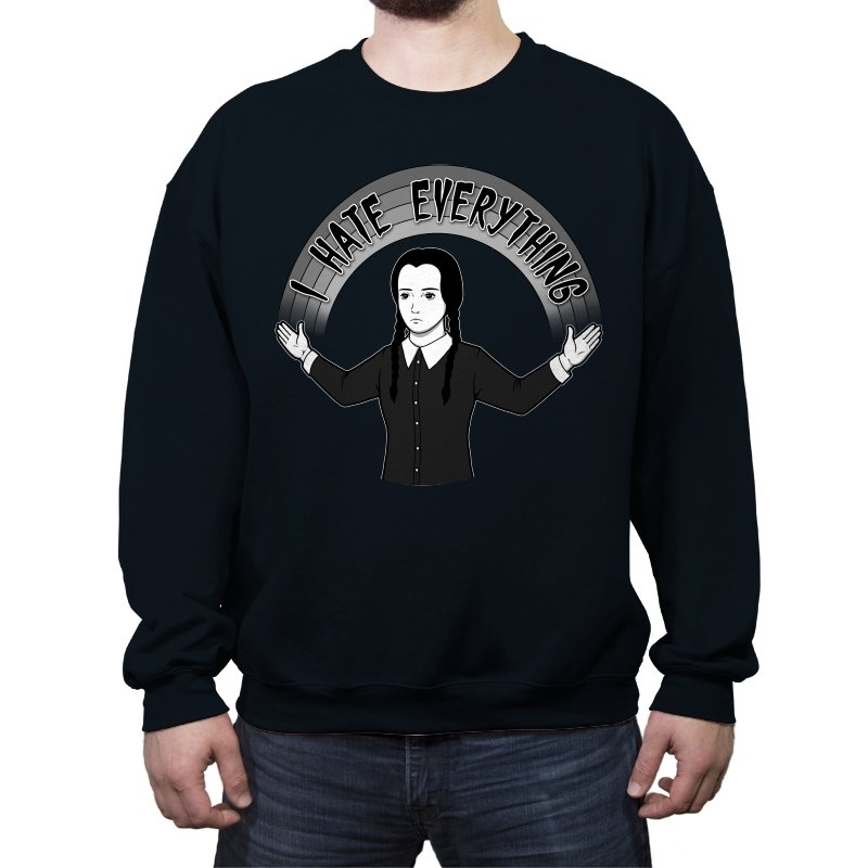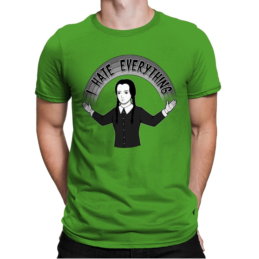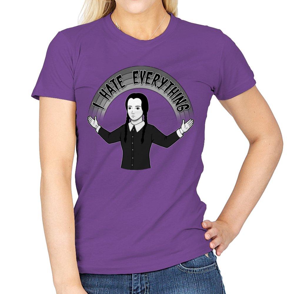 This design channels the iconic dark humor and attitude of the character, featuring a classic image of a character with a strong disdain for everything. The bold text, “I HATE EVERYTHING,” arches over the figure, who stands with arms outstretched, capturing the essence of the character’s sarcastic and rebellious nature. The stark black-and-white style makes the design visually striking, perfect for fans who resonate with that edgy, no-nonsense vibe.