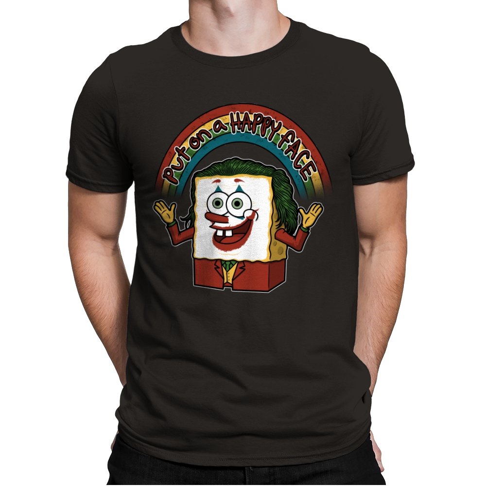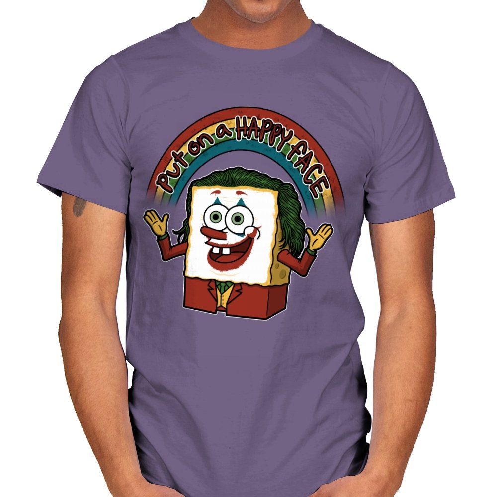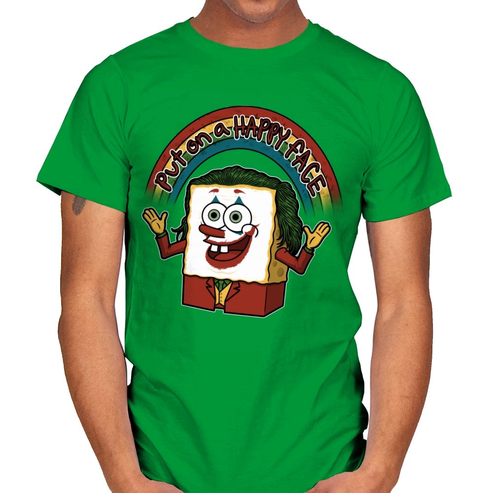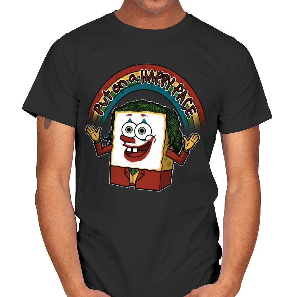 A cheerful sponge shaped character wears a deep red suit and sports green slicked hair while throwing both hands in the air under a rainbow. The text above urges everyone to smile, which would be sweet if not for the uneasy grin stretched across his face. The design blends kids cartoon innocence with grim stand up comedy energy, and fans will immediately clock the layered pop culture joke. It feels like two very different worlds colliding in the most awkward way possible.