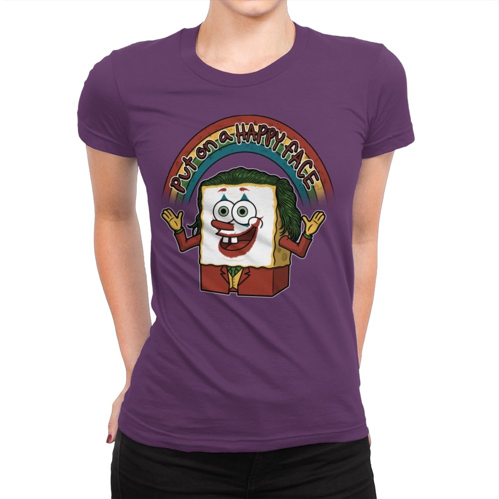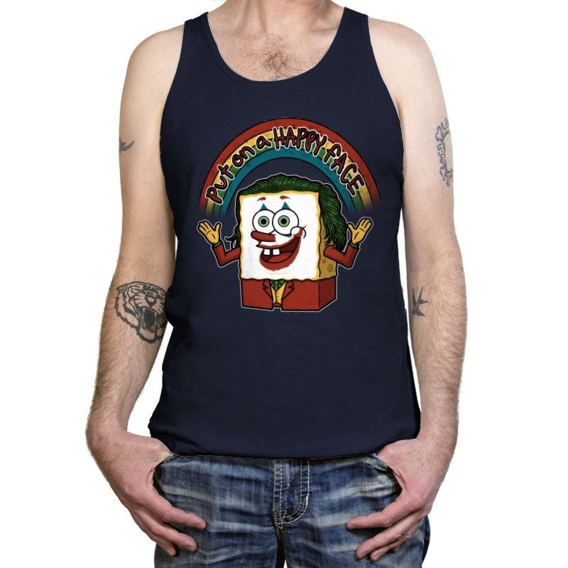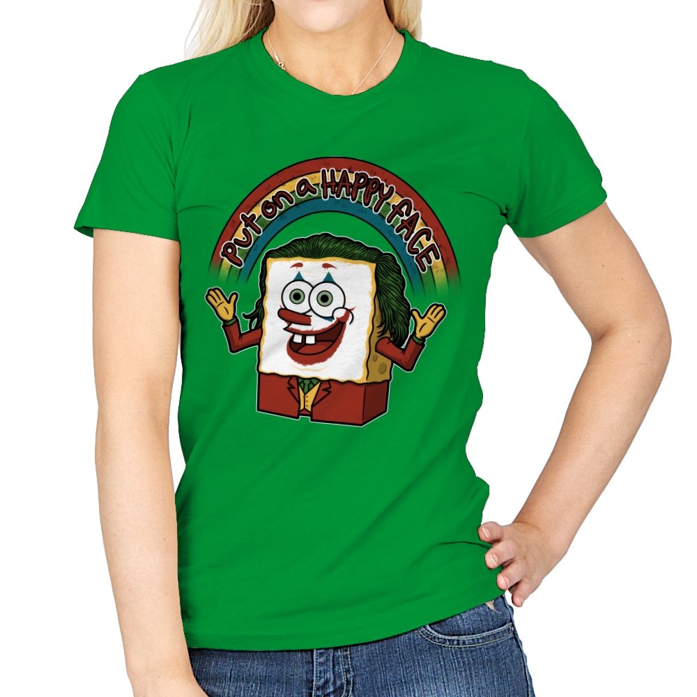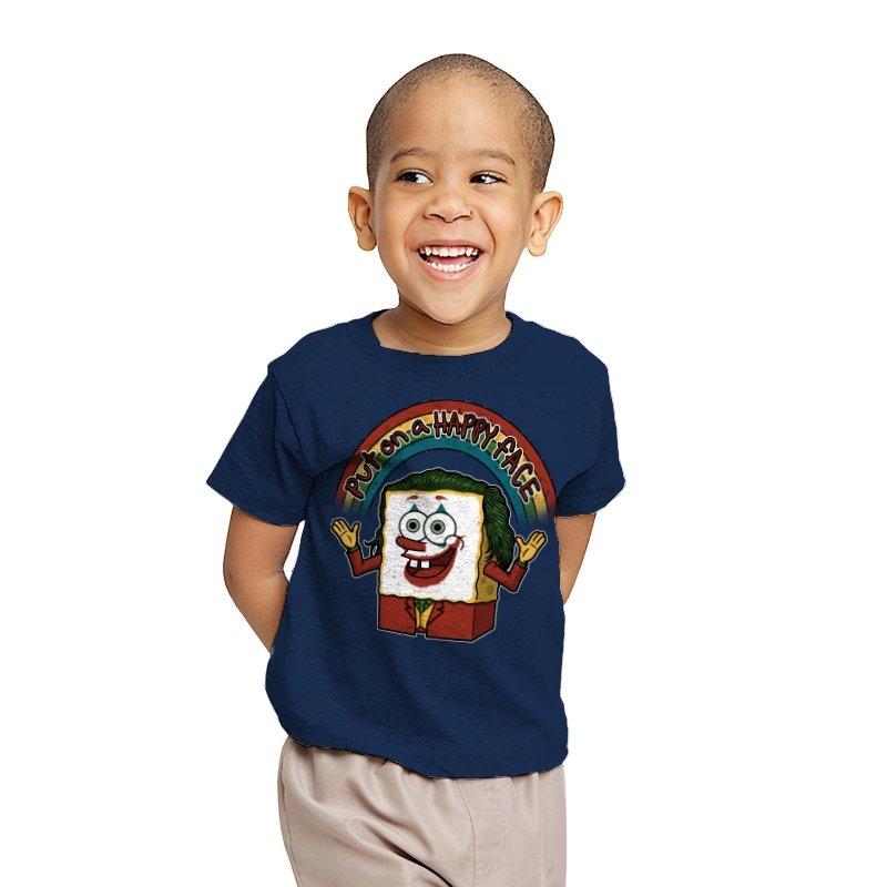 A cheerful sponge shaped character wears a deep red suit and sports green slicked hair while throwing both hands in the air under a rainbow. The text above urges everyone to smile, which would be sweet if not for the uneasy grin stretched across his face. The design blends kids cartoon innocence with grim stand up comedy energy, and fans will immediately clock the layered pop culture joke. It feels like two very different worlds colliding in the most awkward way possible.