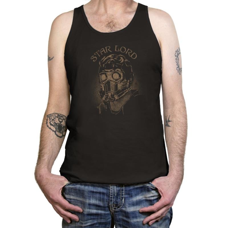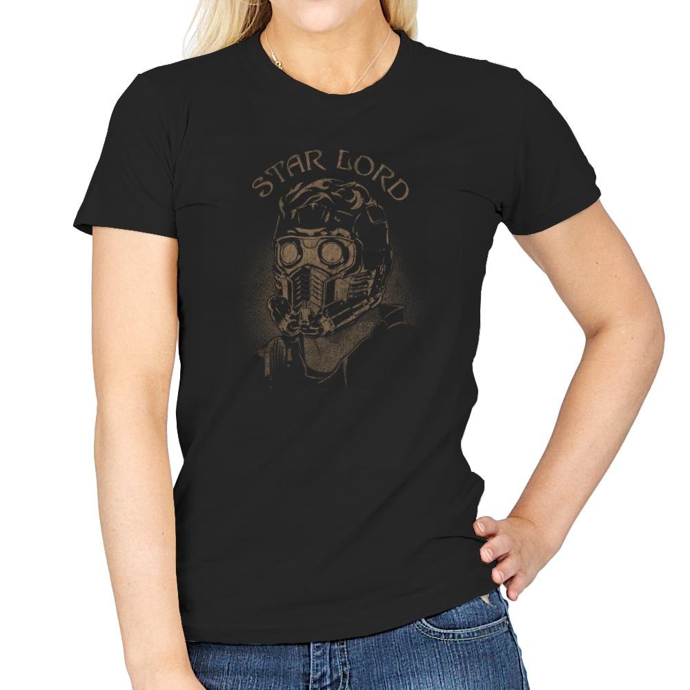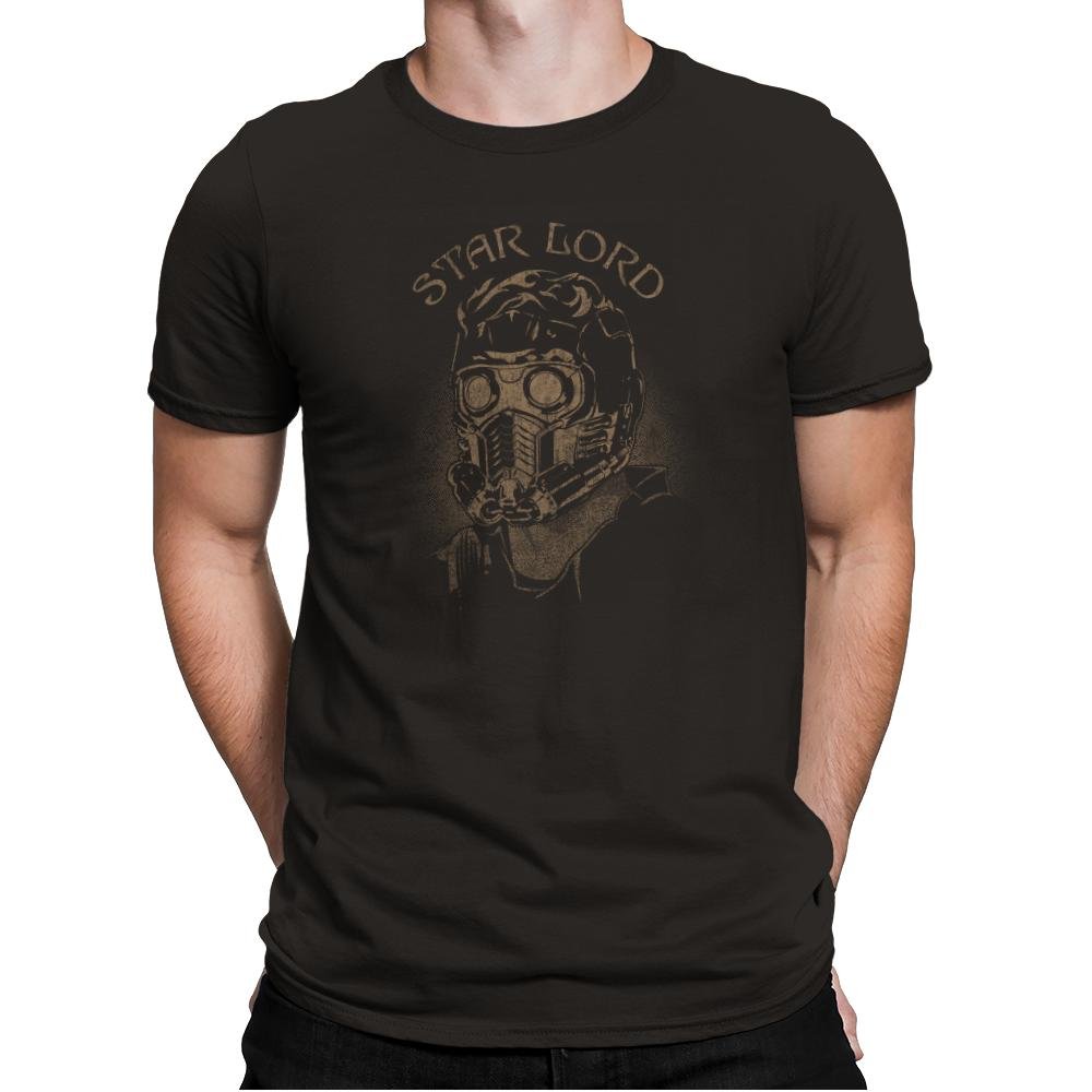 This design frames a retro space outlaw wearing his iconic respirator mask and goggles. The illustration looks like it was pulled from a worn tour tee for a band that never quite existed outside a mixtape. The muted gold on black gives it a dusty, screen-printed feel, as if it has already lived through a few adventures. The typography arches above the portrait like a marquee from some interstellar gig.