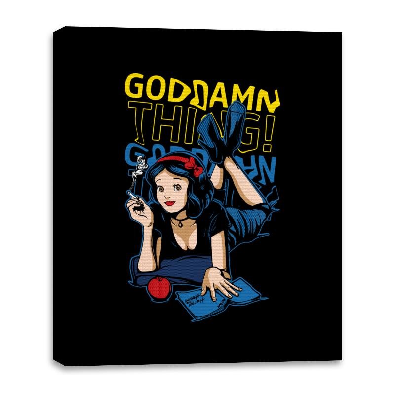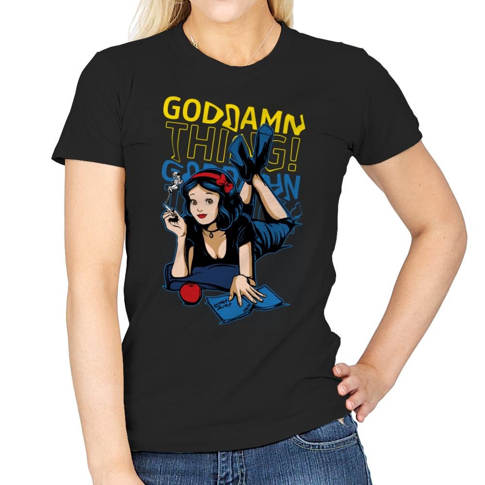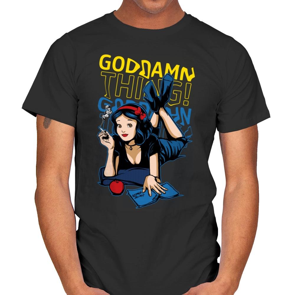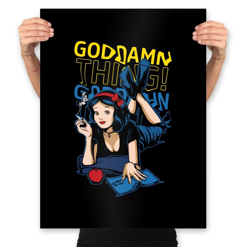 This design twists the usual fairy tale image into something more grounded and snarky. A familiar dark-haired princess lounges on her stomach with a cigarette in one hand, kicking her heels up like she is flipping through a zine instead of waiting for Prince Charming. The bright lettering above her feels like something muttered under her breath after dealing with enchanted nonsense one time too many. The apple on the floor makes the gag complete without needing to spell anything out.