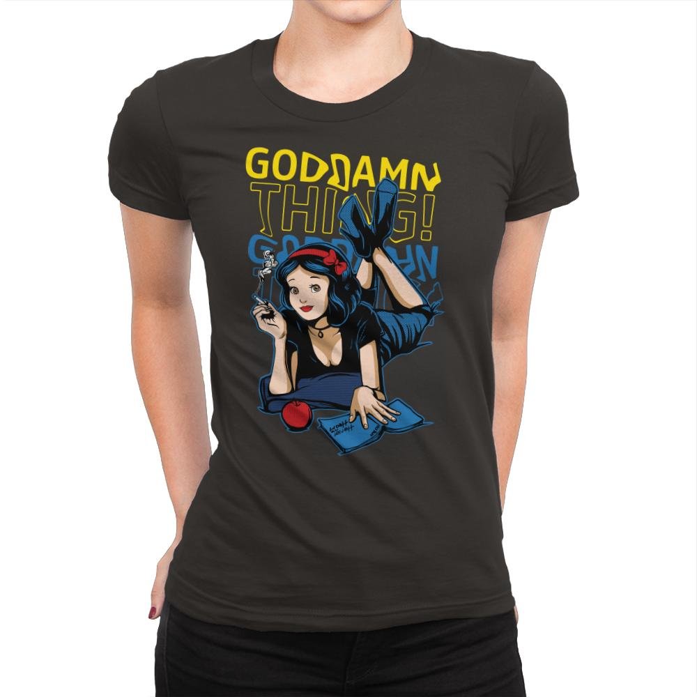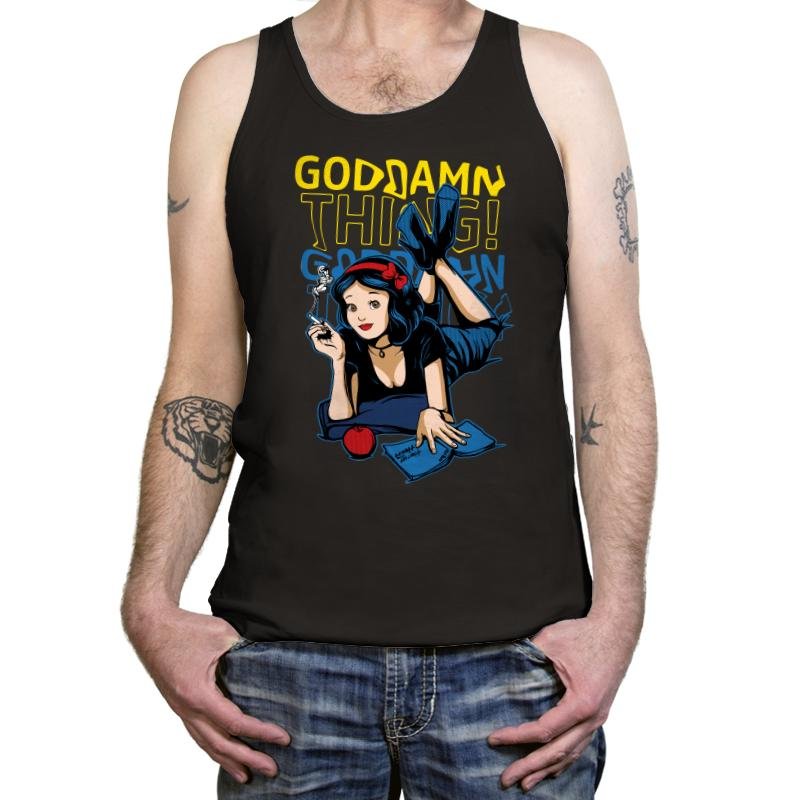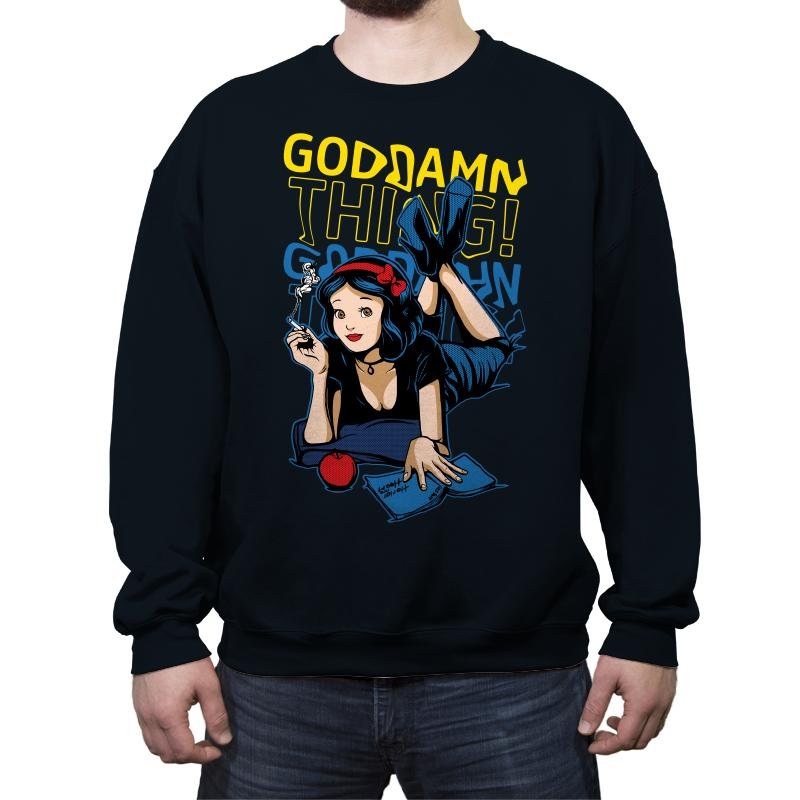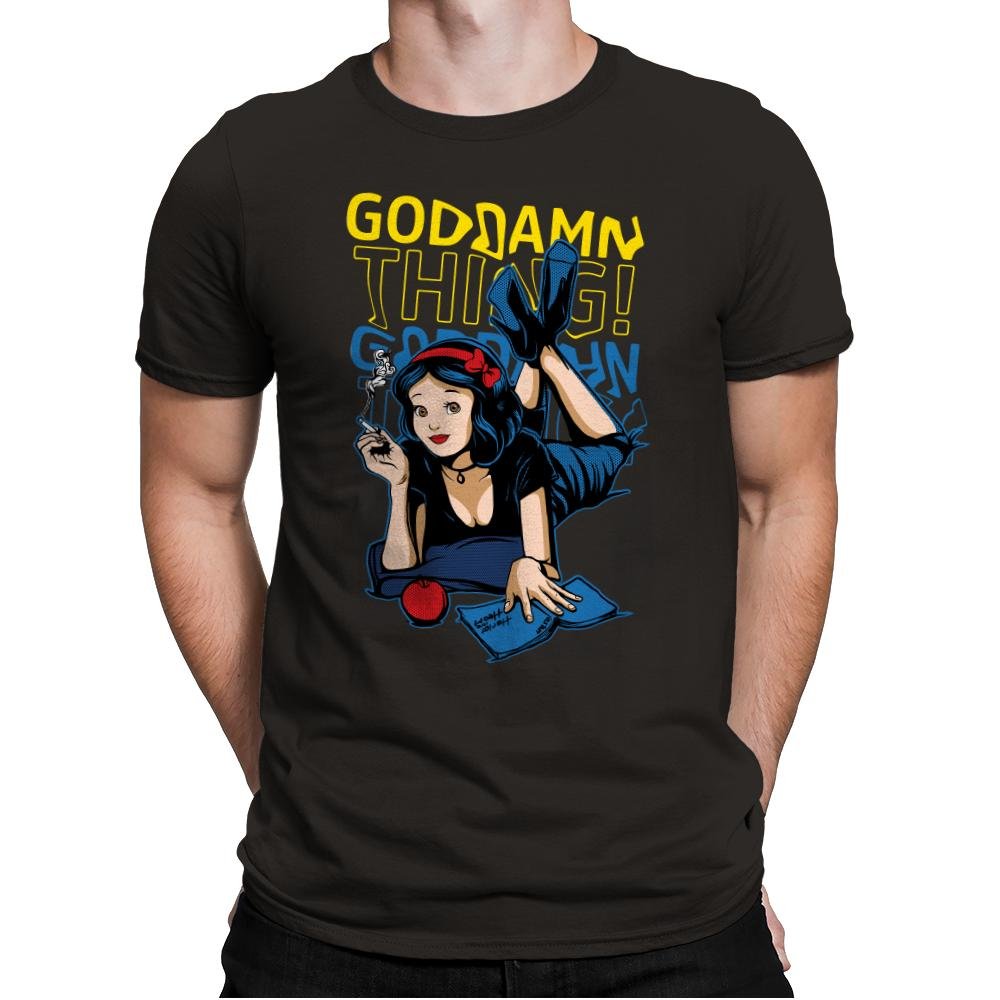 This design twists the usual fairy tale image into something more grounded and snarky. A familiar dark-haired princess lounges on her stomach with a cigarette in one hand, kicking her heels up like she is flipping through a zine instead of waiting for Prince Charming. The bright lettering above her feels like something muttered under her breath after dealing with enchanted nonsense one time too many. The apple on the floor makes the gag complete without needing to spell anything out.