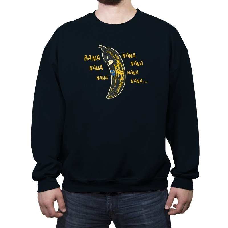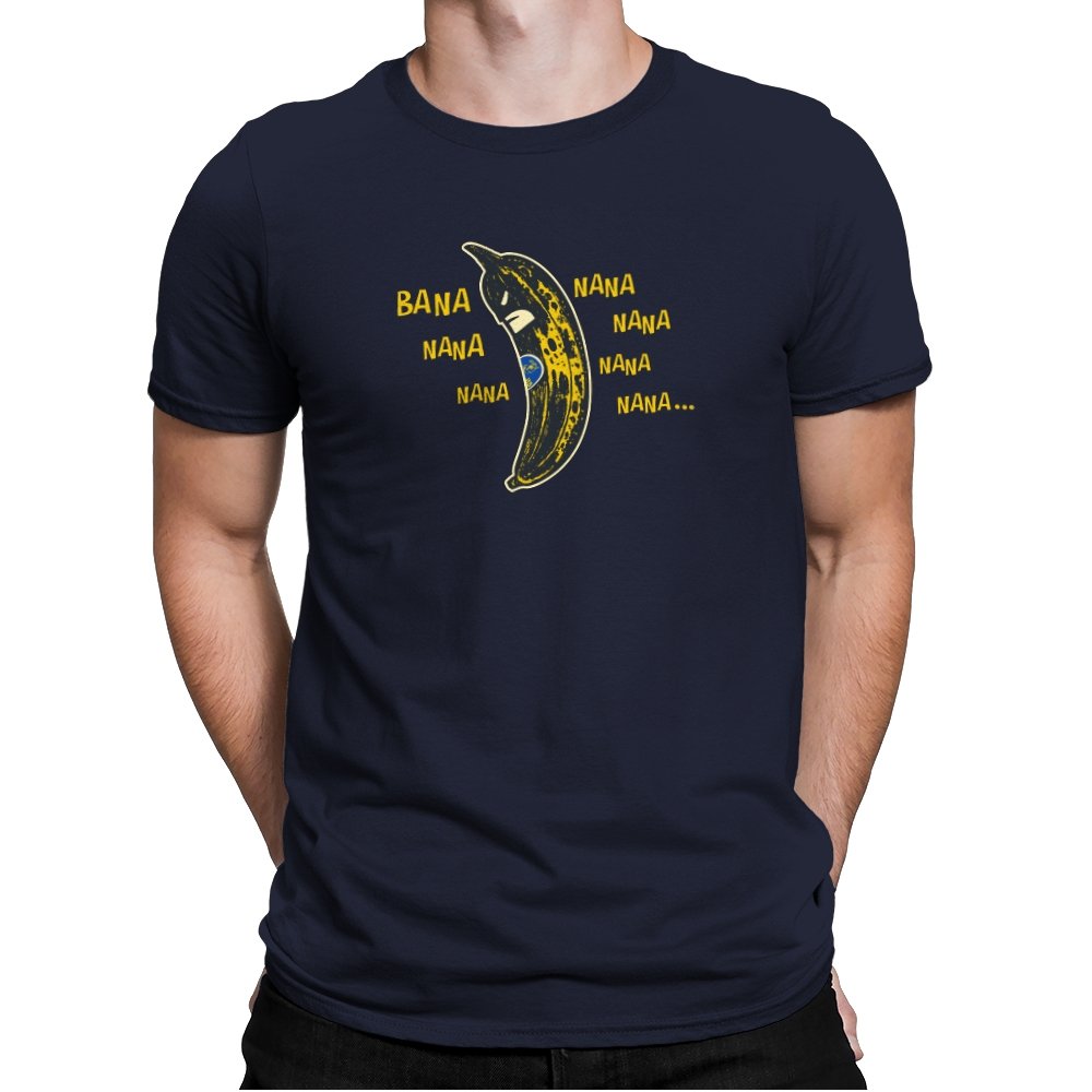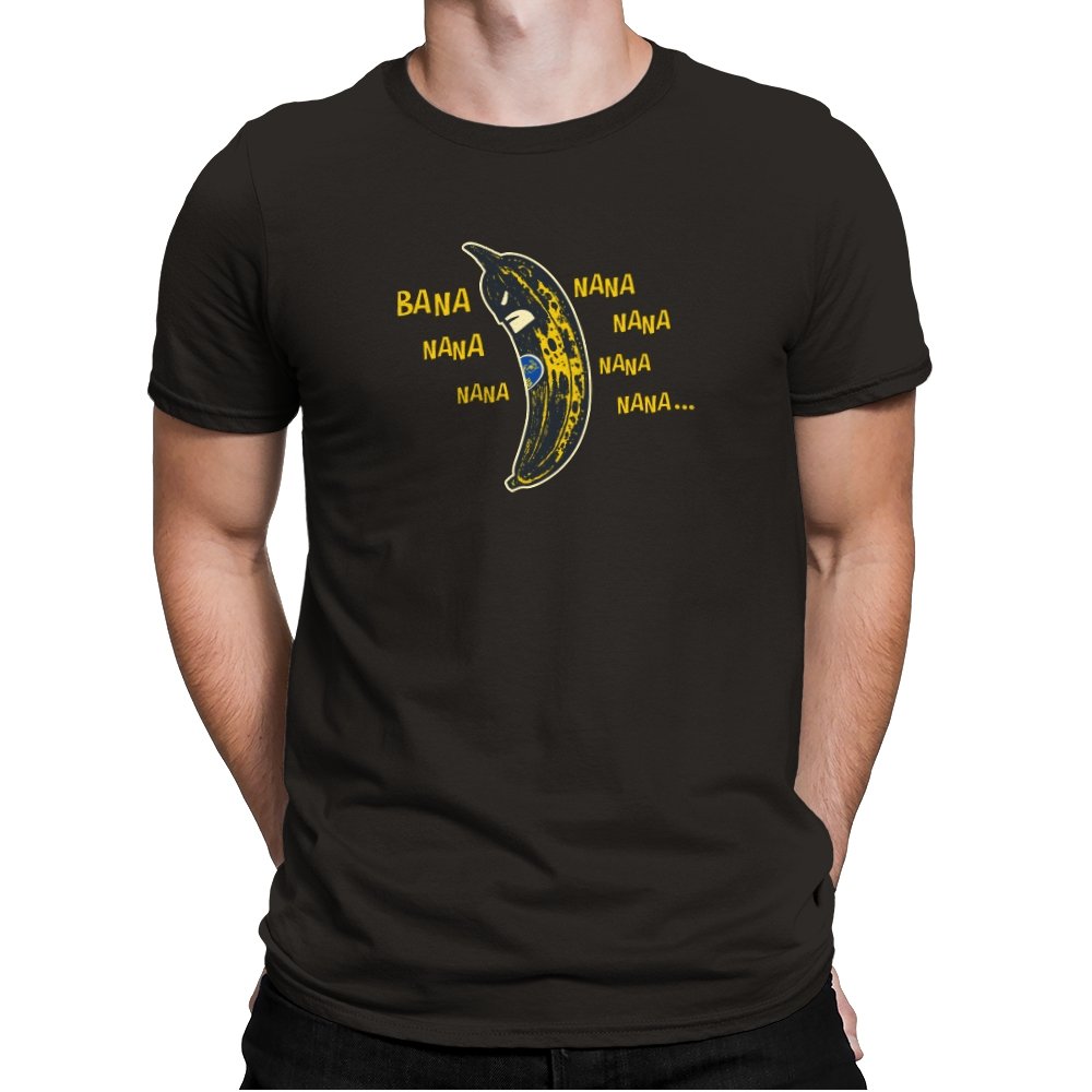 This design turns a bruised yellow banana into a scowling masked vigilante. The fruit curves like a cape and cowl while a tiny produce sticker acts as the hero’s emblem. Around it floats a chorus of “bana” and “nana” sounds that fans recognize from a certain retro theme tune, so the gag lands without naming names. It feels like a grocery aisle parody of late night rooftop justice.