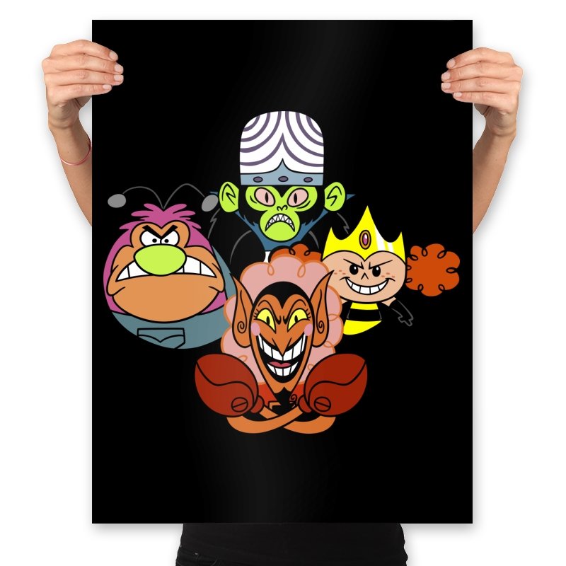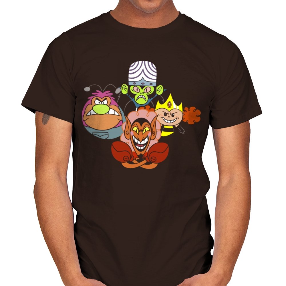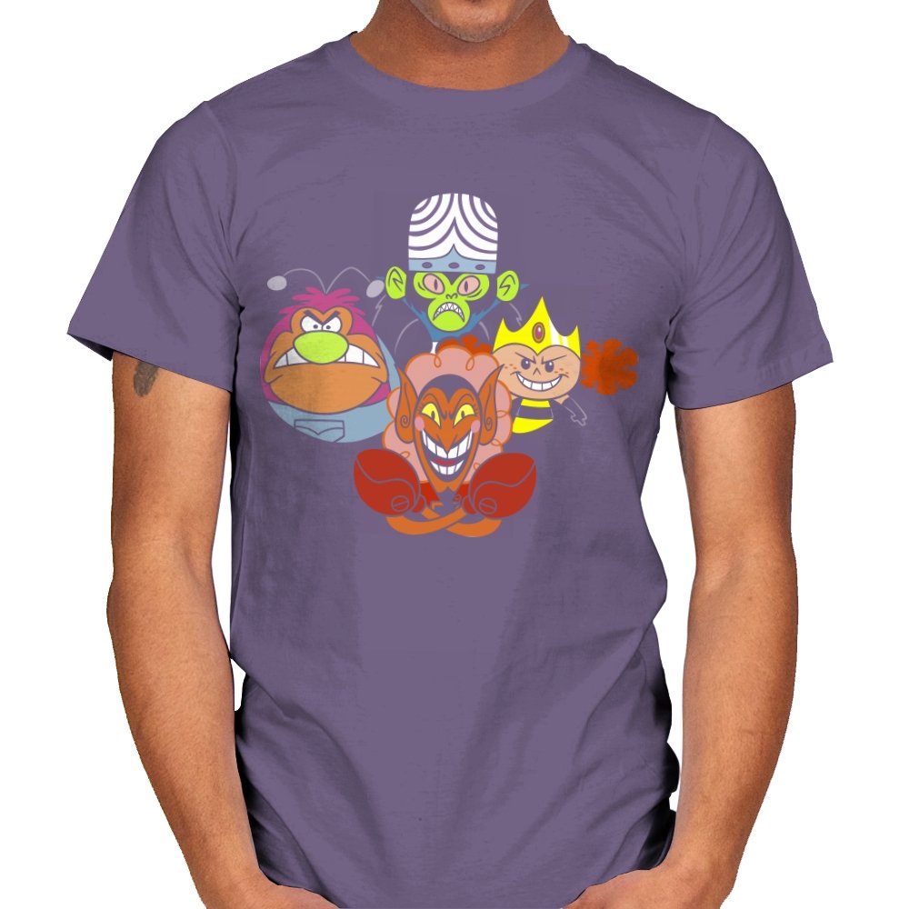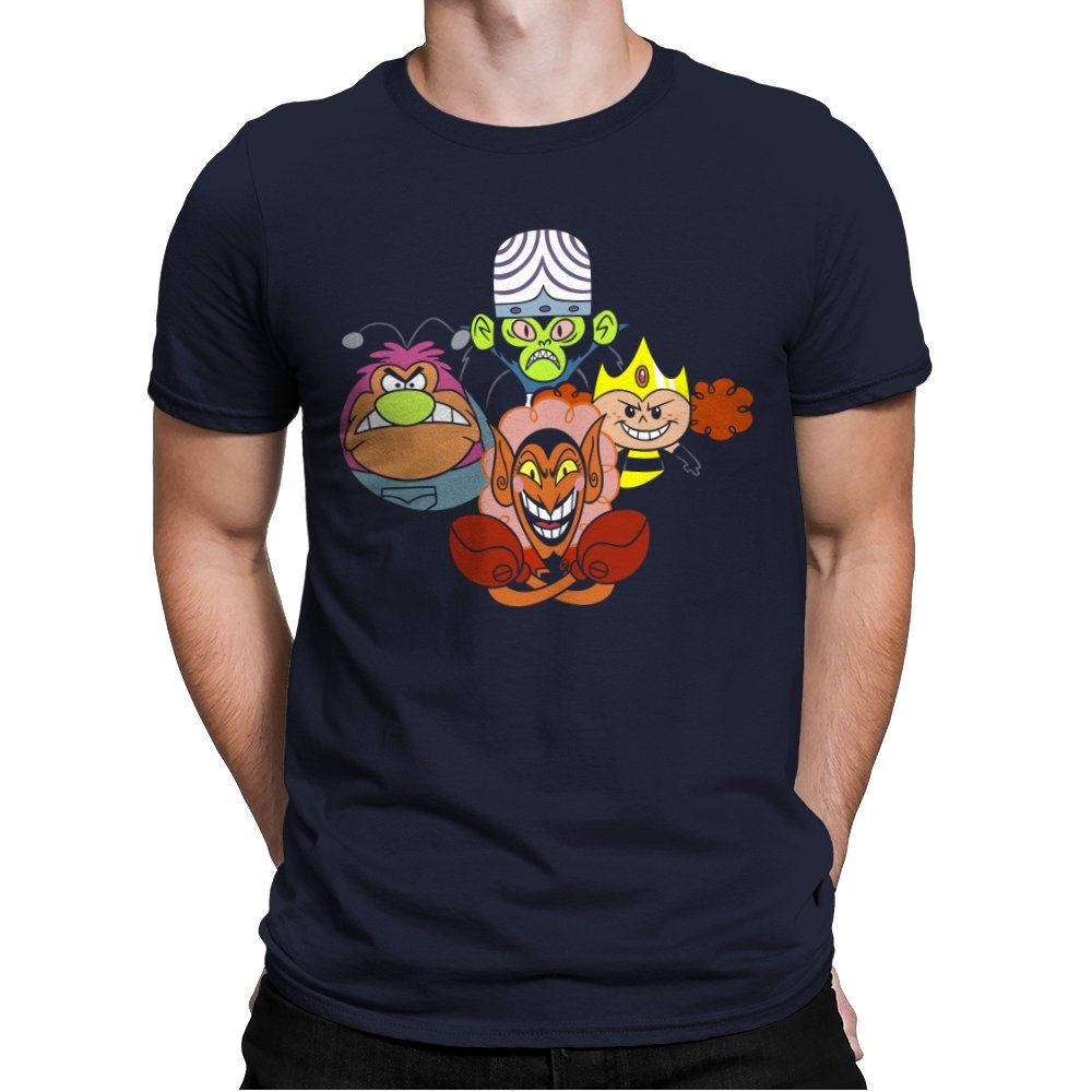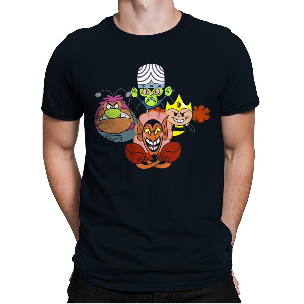 The design stacks four familiar animated villains into a tight formation, each exaggerated expression locked into a shared moment of theatrical menace. Bold colors, heavy outlines, and rounded shapes keep the tone playful even as the characters glare, grin, and sneer. The composition mirrors an iconic band portrait, swapping microphones for mind control, magic, and brute force. Fans recognize the joke instantly and appreciate how chaos is organized into harmony.