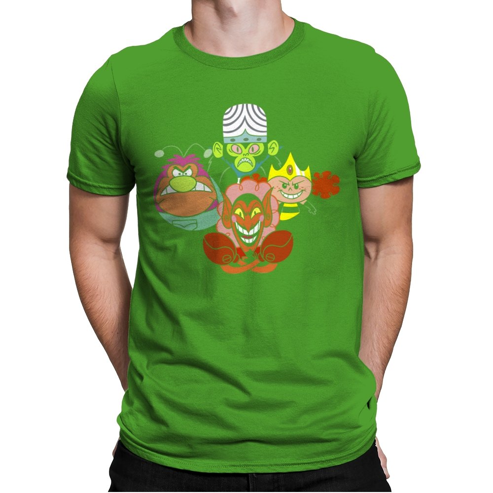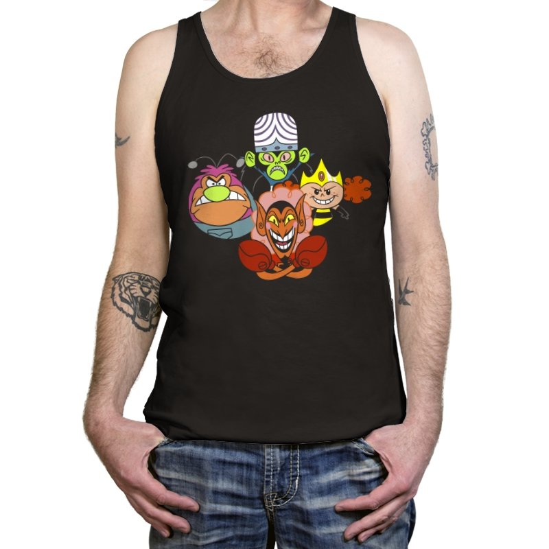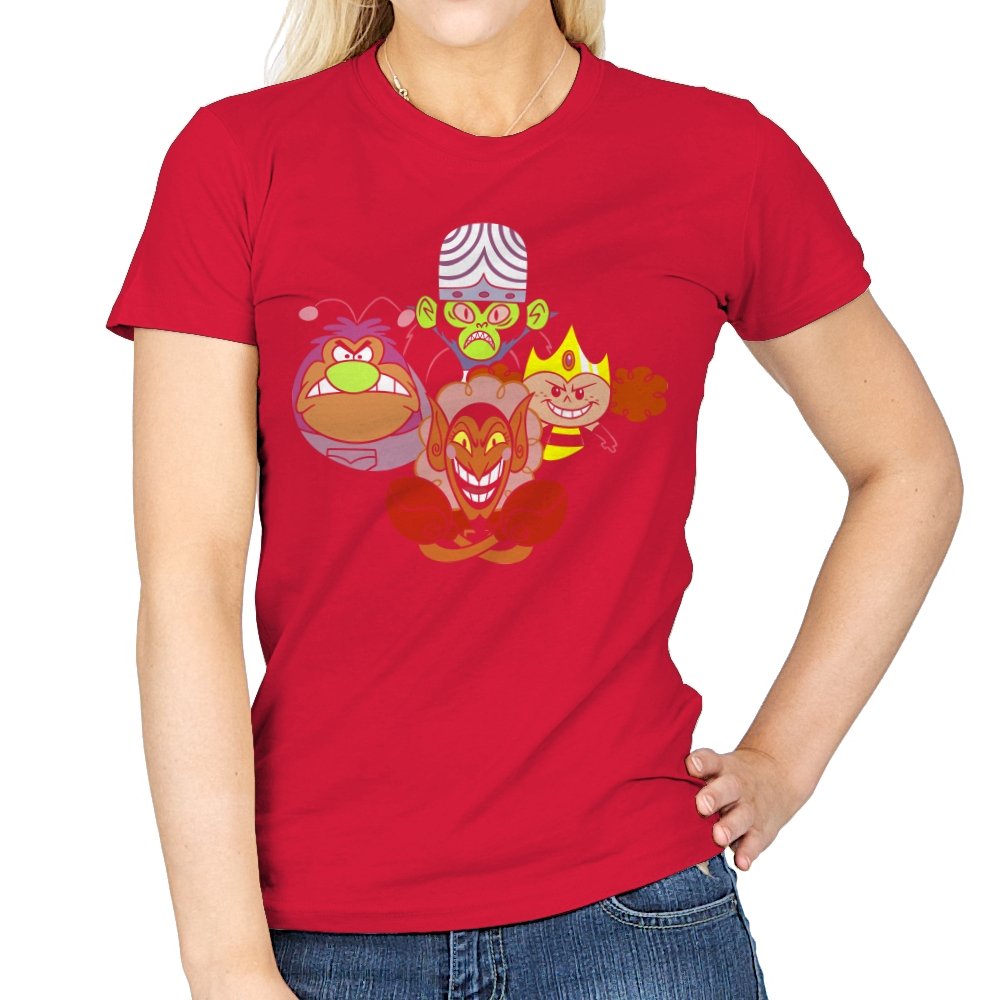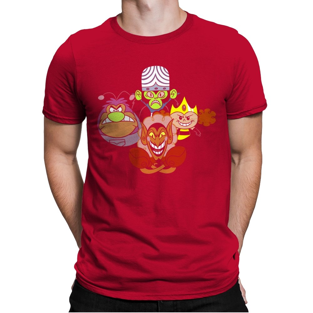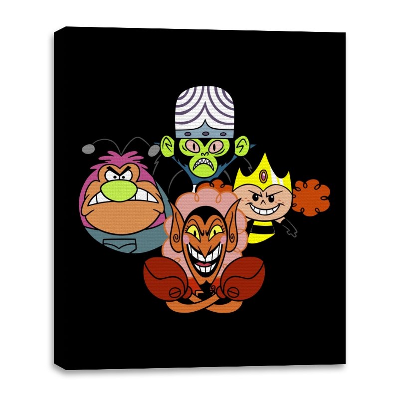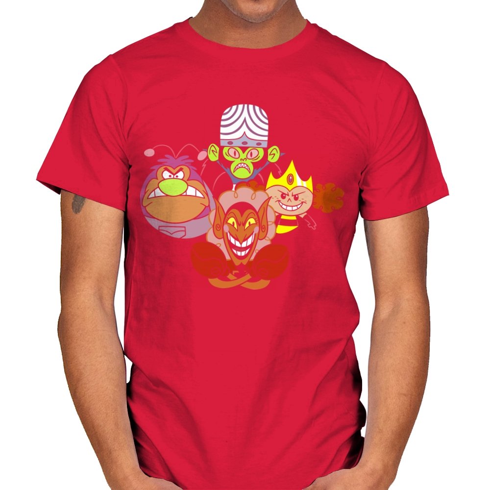The design stacks four familiar animated villains into a tight formation, each exaggerated expression locked into a shared moment of theatrical menace. Bold colors, heavy outlines, and rounded shapes keep the tone playful even as the characters glare, grin, and sneer. The composition mirrors an iconic band portrait, swapping microphones for mind control, magic, and brute force. Fans recognize the joke instantly and appreciate how chaos is organized into harmony.