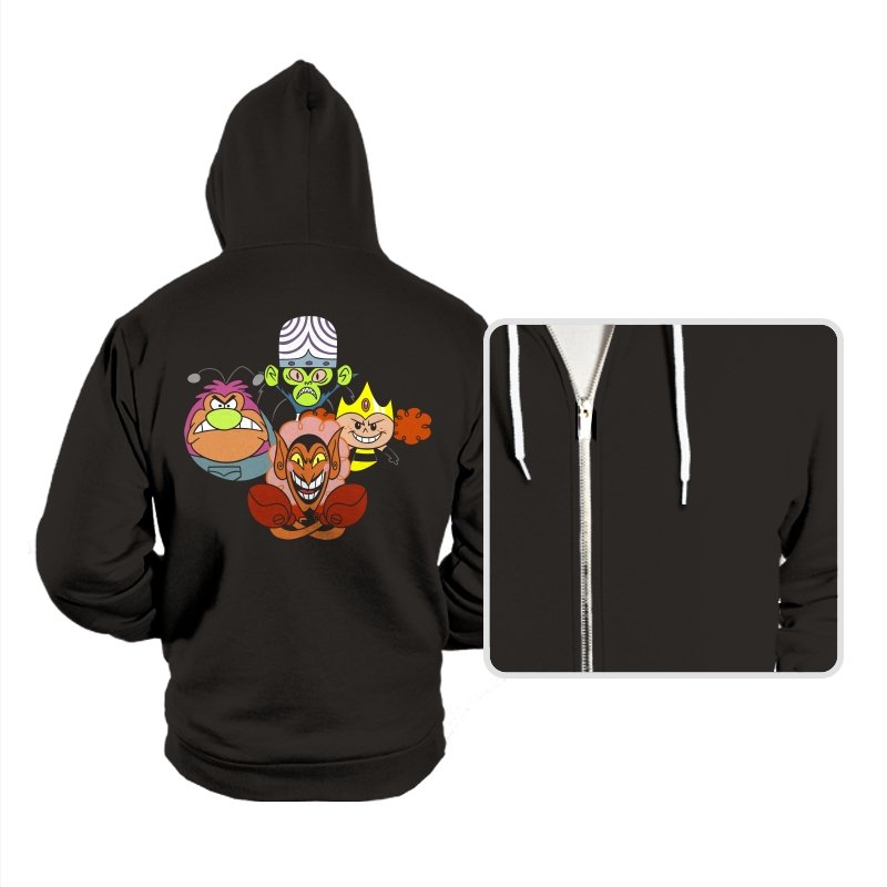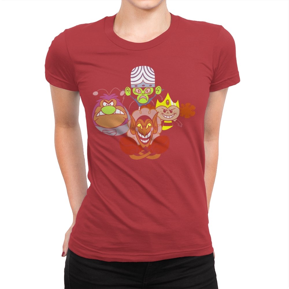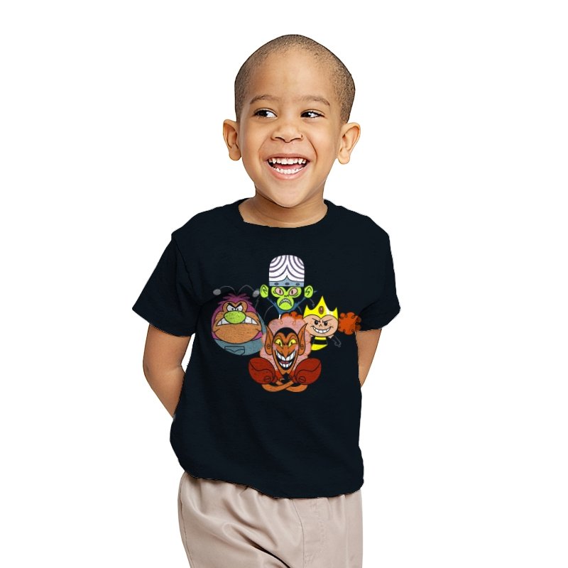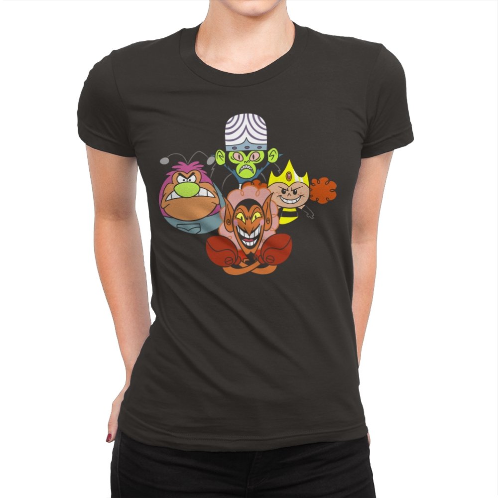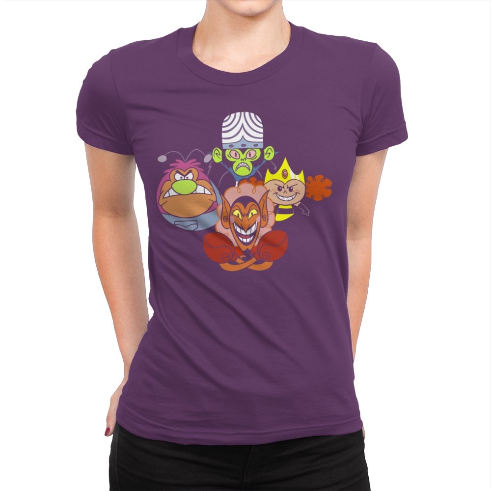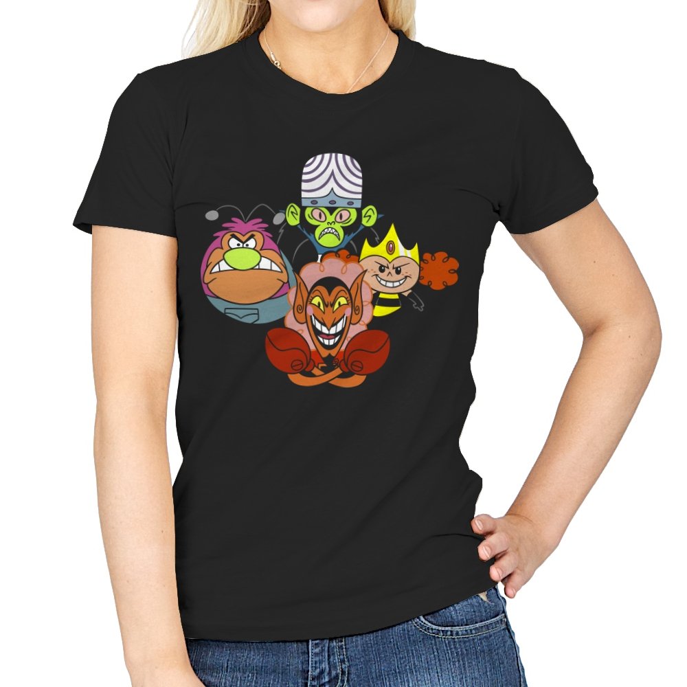 The design stacks four familiar animated villains into a tight formation, each exaggerated expression locked into a shared moment of theatrical menace. Bold colors, heavy outlines, and rounded shapes keep the tone playful even as the characters glare, grin, and sneer. The composition mirrors an iconic band portrait, swapping microphones for mind control, magic, and brute force. Fans recognize the joke instantly and appreciate how chaos is organized into harmony.