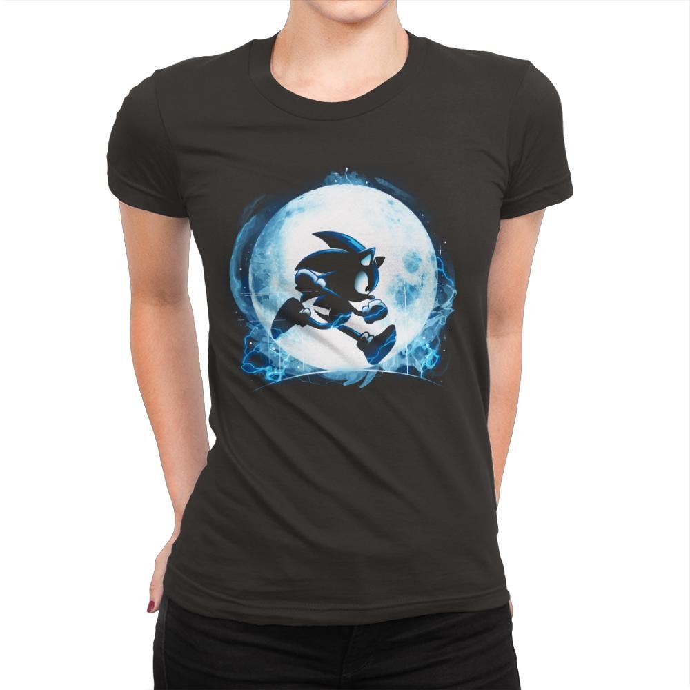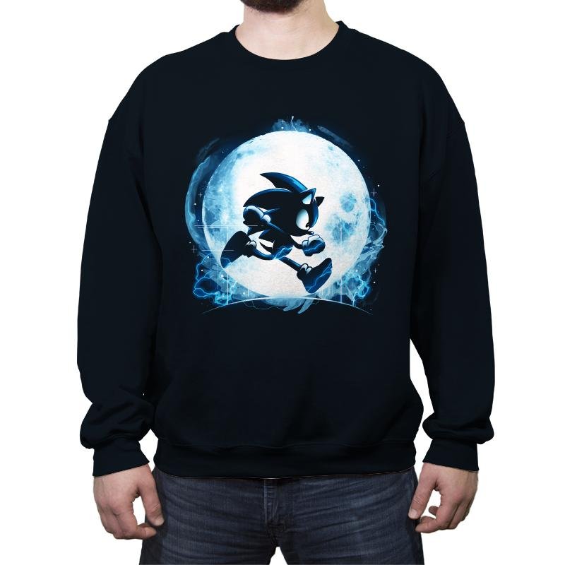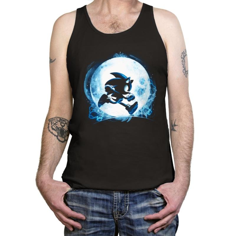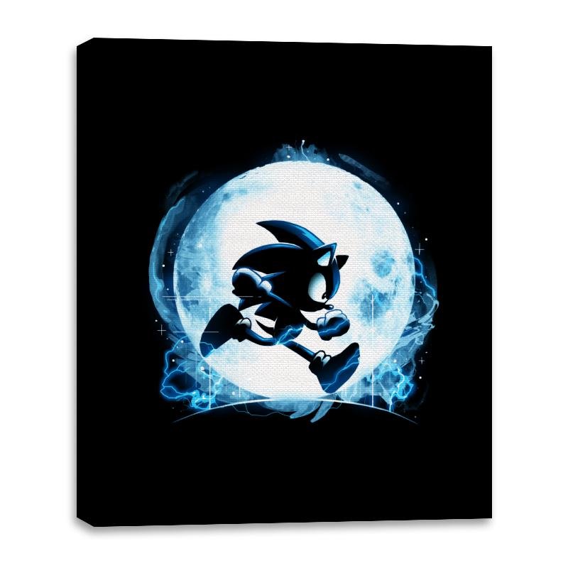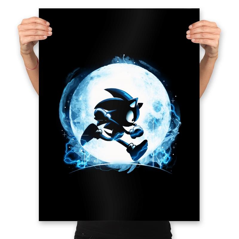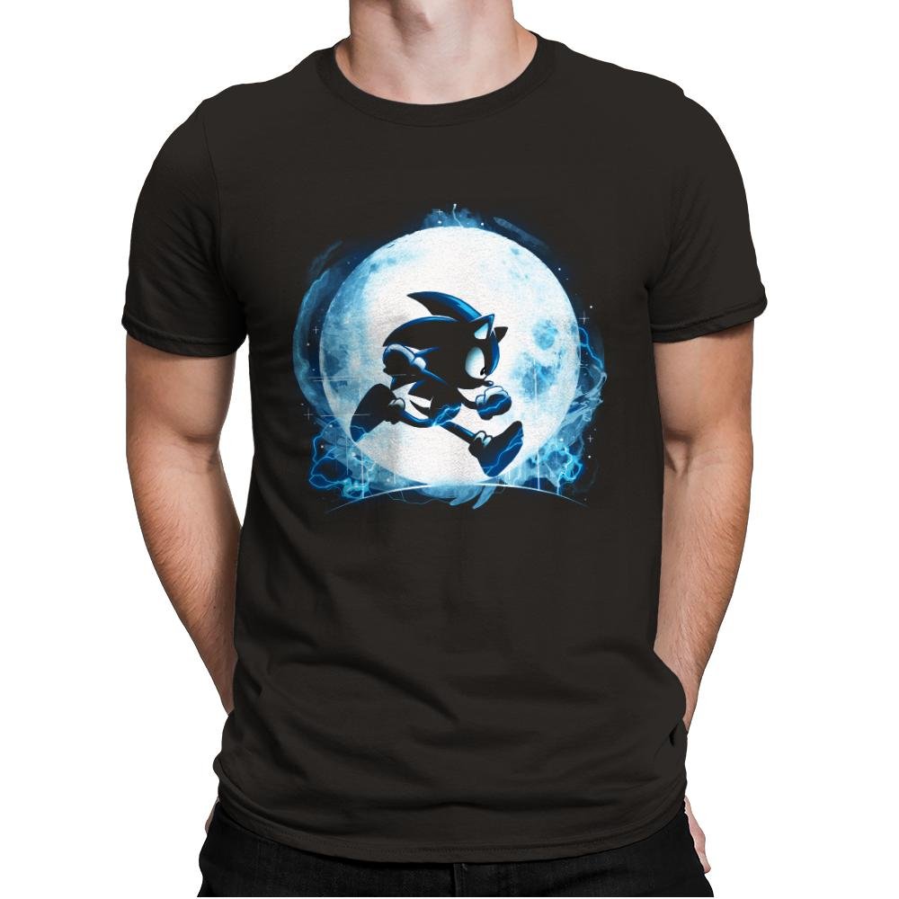 This design frames a familiar speed driven silhouette against a glowing full moon, turning motion into something almost mythic. The character is rendered as a dark figure in mid run, outlined by electric blue energy that feels more elemental than technological. The moonlight does the heavy lifting, creating contrast and atmosphere instead of detail. It reads like a quiet moment pulled from an endless sprint.