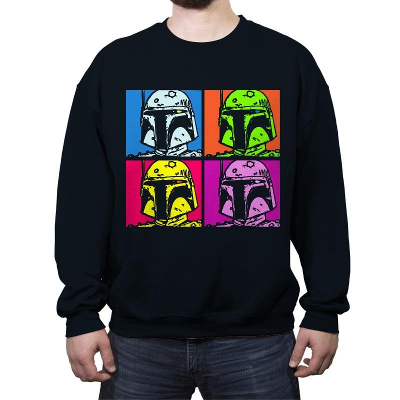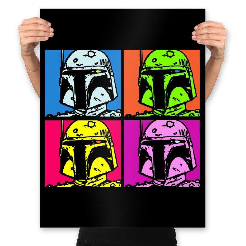 This design riffs on pop art panels by repeating a familiar helmeted silhouette in four loud color blocks. The bounty hunter icon becomes less about lore and more about form, texture, and attitude. Each square shifts palette but keeps the dented armor and narrow visor recognizable to fans across eras. It feels like someone dropped a galactic outlaw into an art museum’s modern wing.