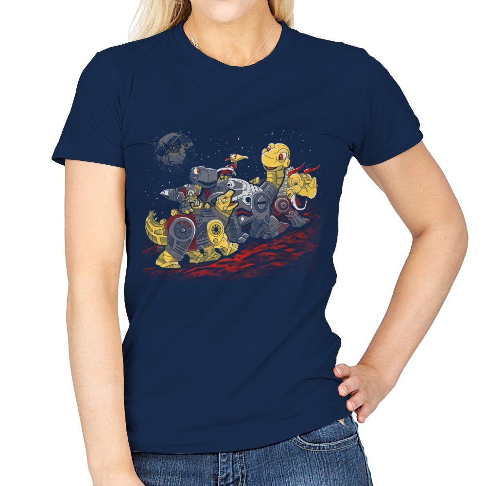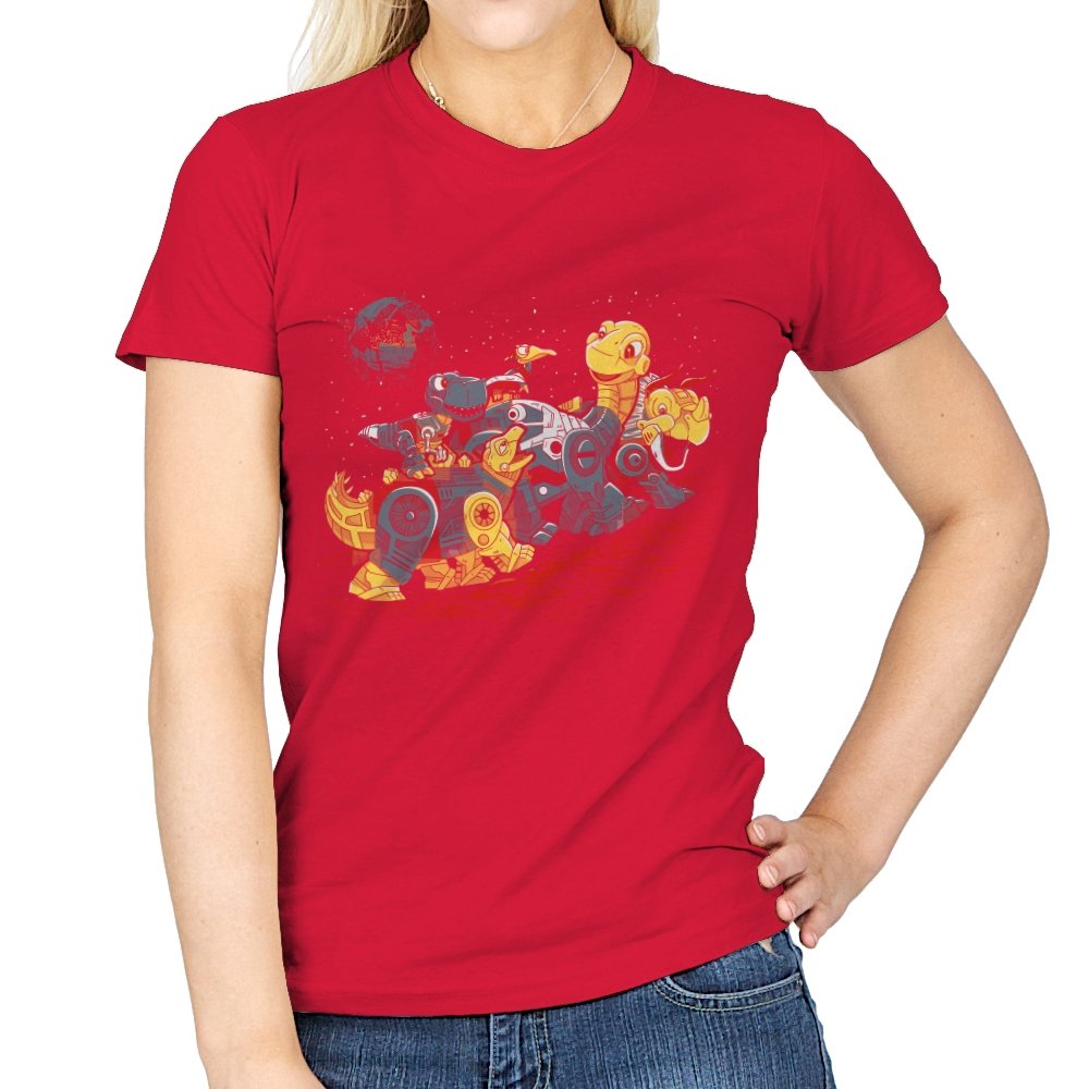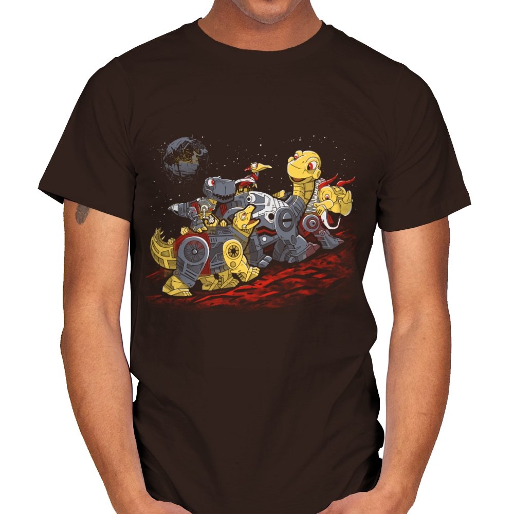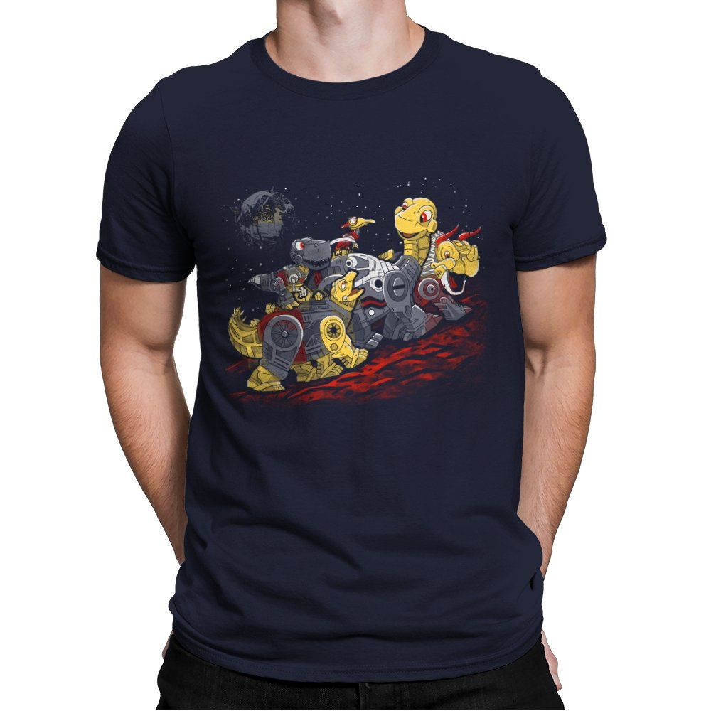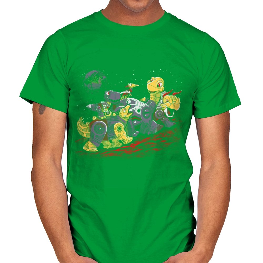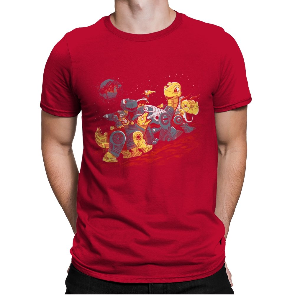 This design turns a childhood dinosaur adventure into a full mechanical crossover. Chunky metal plating, visible gears, and glowing eyes replace soft scales, while the familiar group pose stays intact. The scene is set on an alien red ground with space behind them, pushing the idea even further into sci-fi territory. If you grew up with both cartoons and robots, the reference clicks instantly.