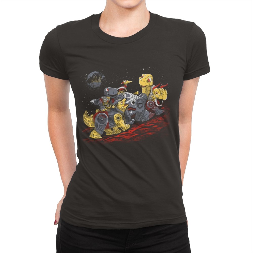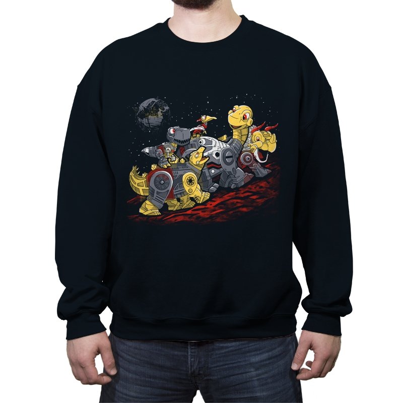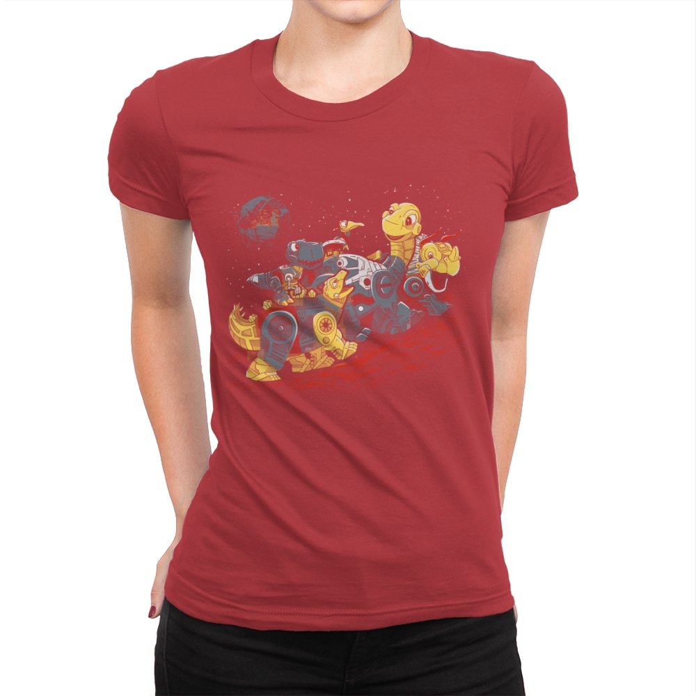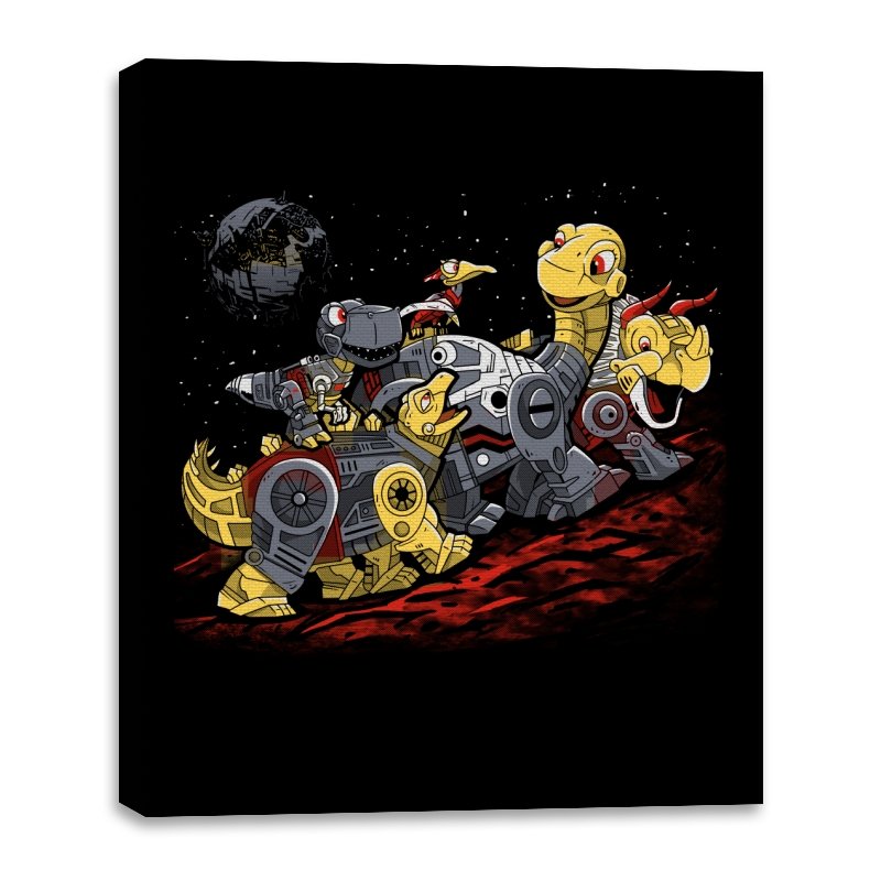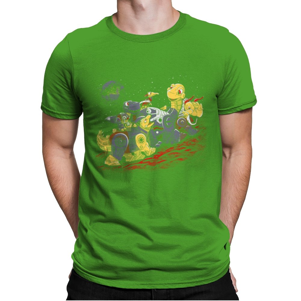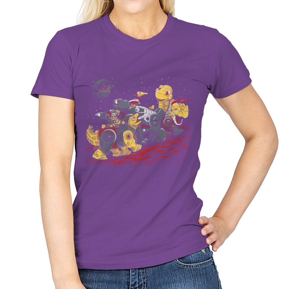 This design turns a childhood dinosaur adventure into a full mechanical crossover. Chunky metal plating, visible gears, and glowing eyes replace soft scales, while the familiar group pose stays intact. The scene is set on an alien red ground with space behind them, pushing the idea even further into sci-fi territory. If you grew up with both cartoons and robots, the reference clicks instantly.
