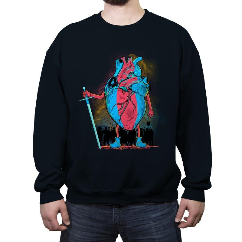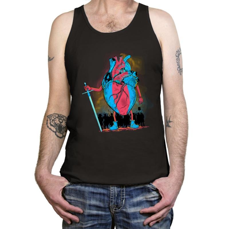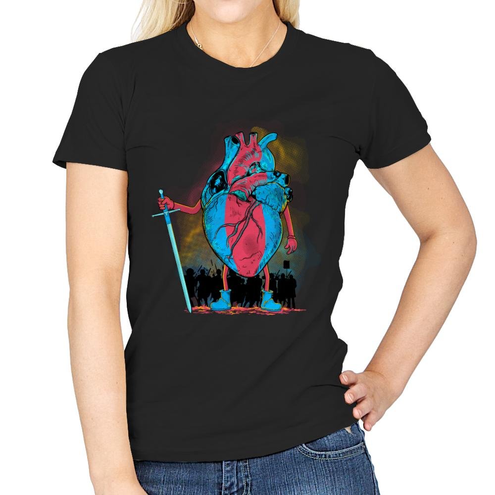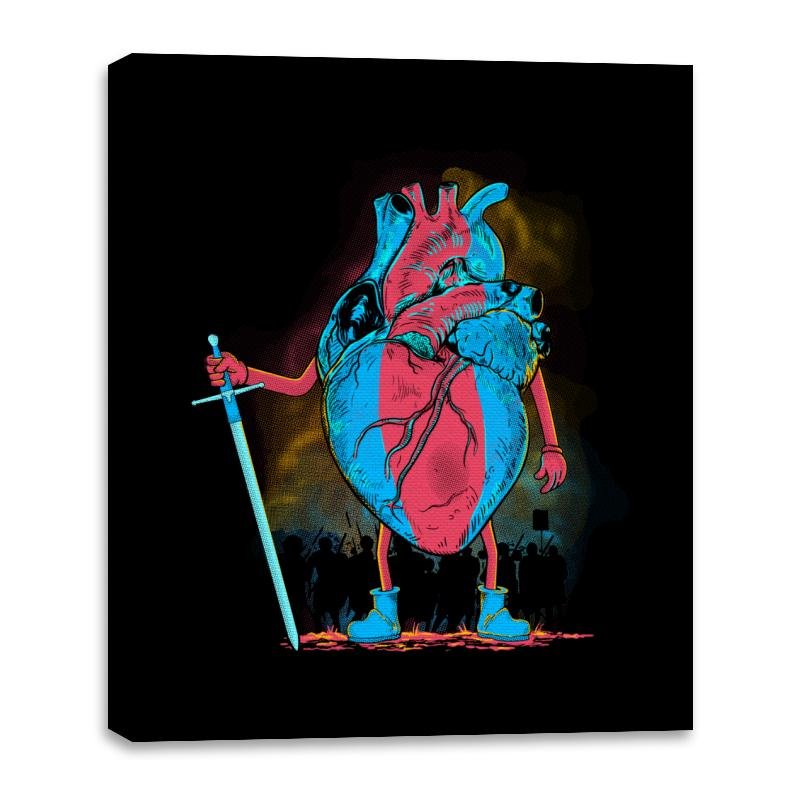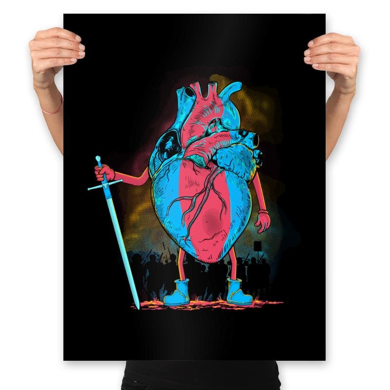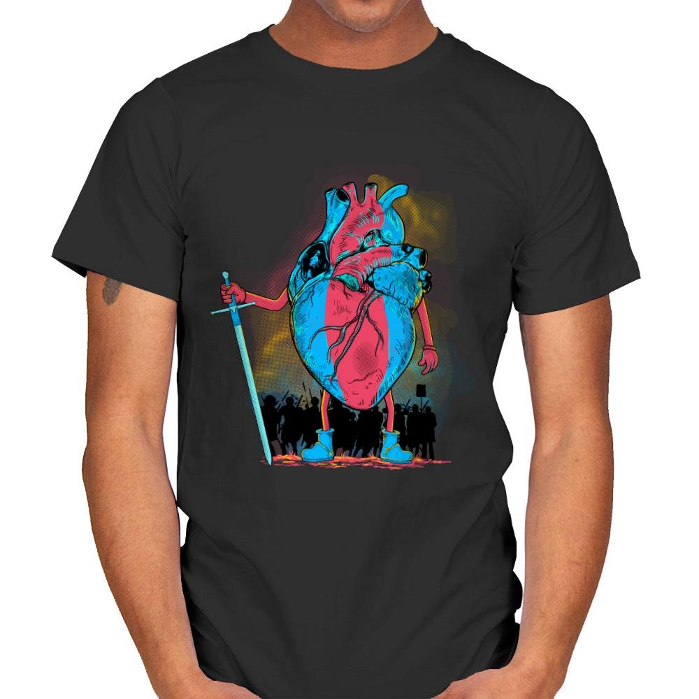 This design takes a literal human heart and drops it into a battlefield moment from pop culture legend. Veins and ventricles form the torso while simple arms, boots, and a towering sword complete the warrior silhouette. The palette flips between electric blue and deep red, giving it a medical diagram glow with comic book drama. Small figures gather in the background, hinting at a larger uprising as the organ takes center stage.
