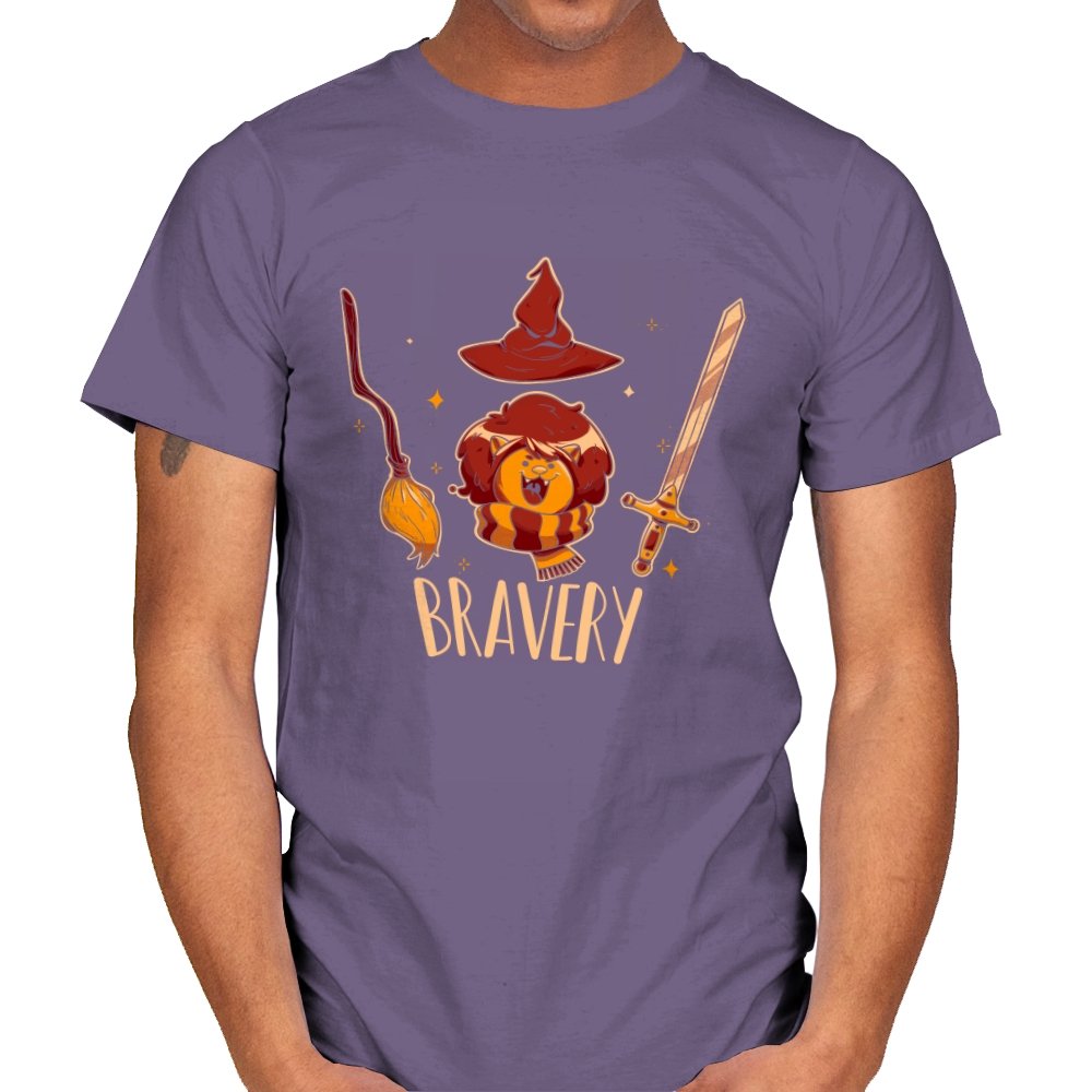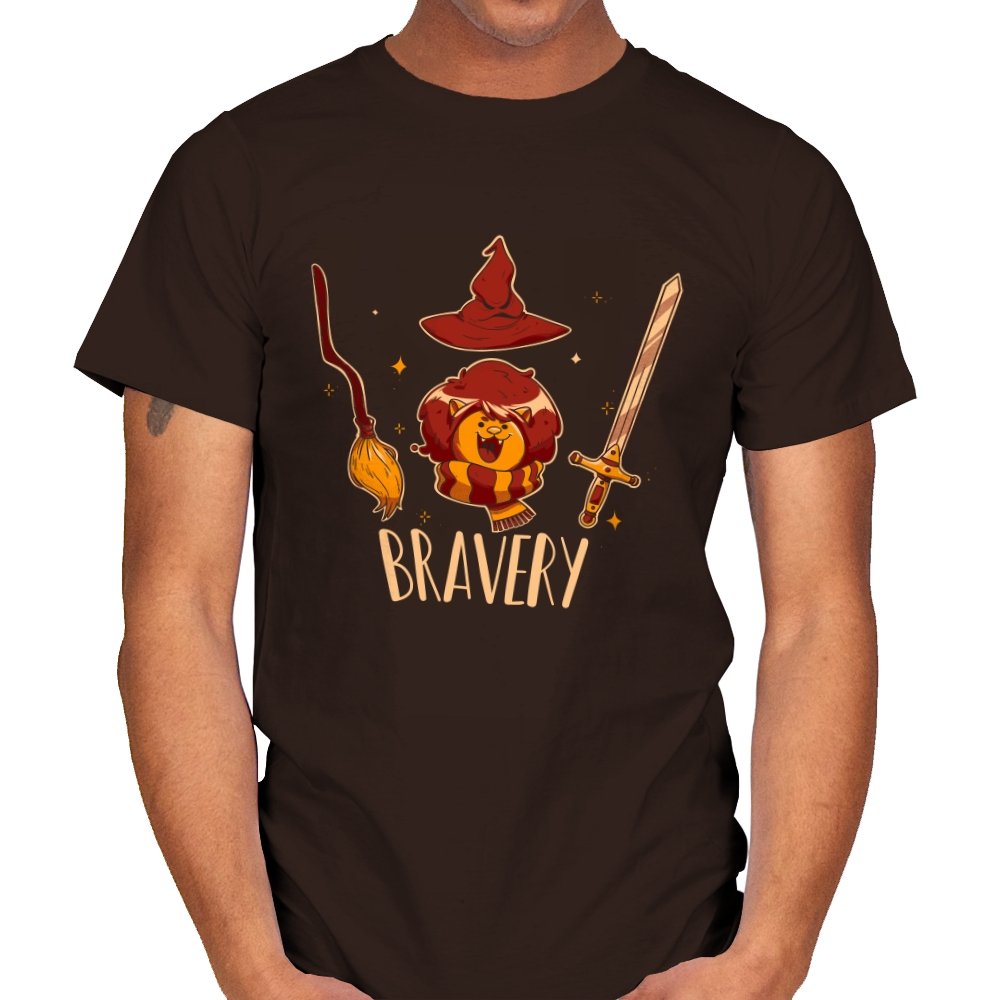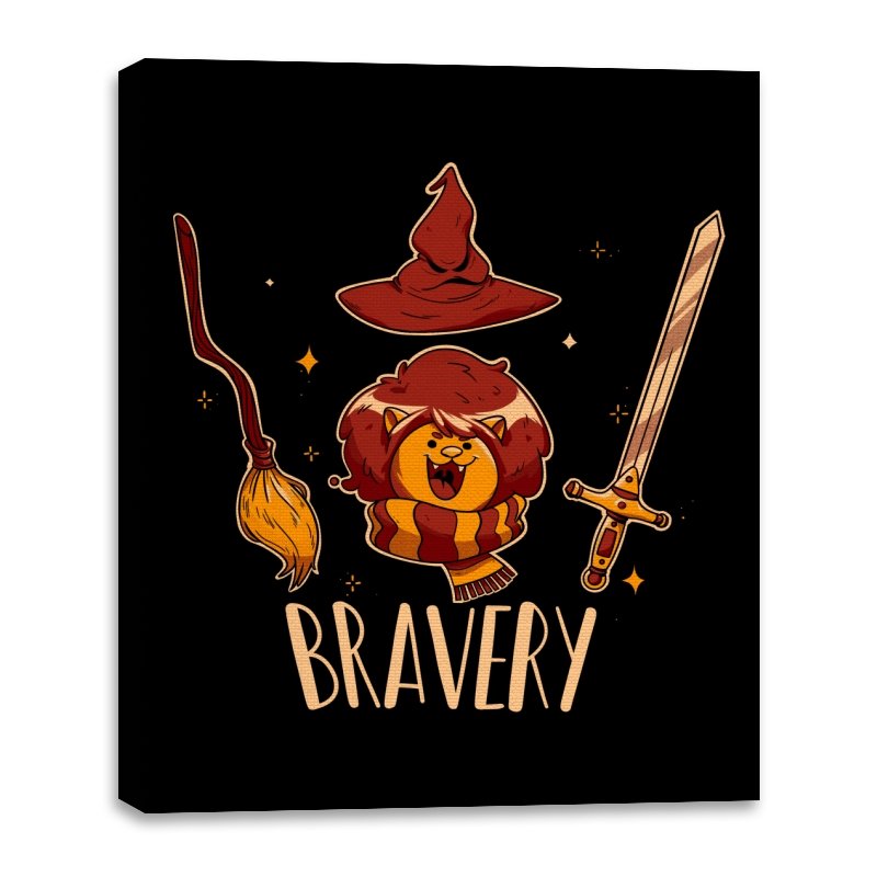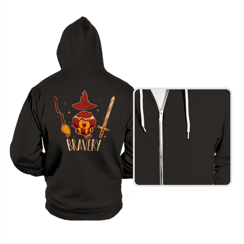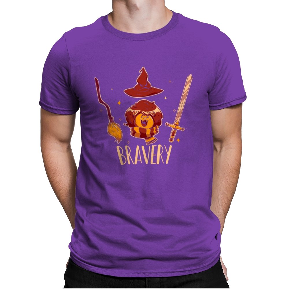 This design breaks courage down into a few instantly recognizable symbols, arranged with playful clarity. A small lion sits proudly beneath a pointed hat, flanked by a broom and a sword, each object doing its share of the storytelling. The warm colors and rounded lines keep the tone friendly rather than epic. Fans who get the reference will smile at how simply the idea is communicated.