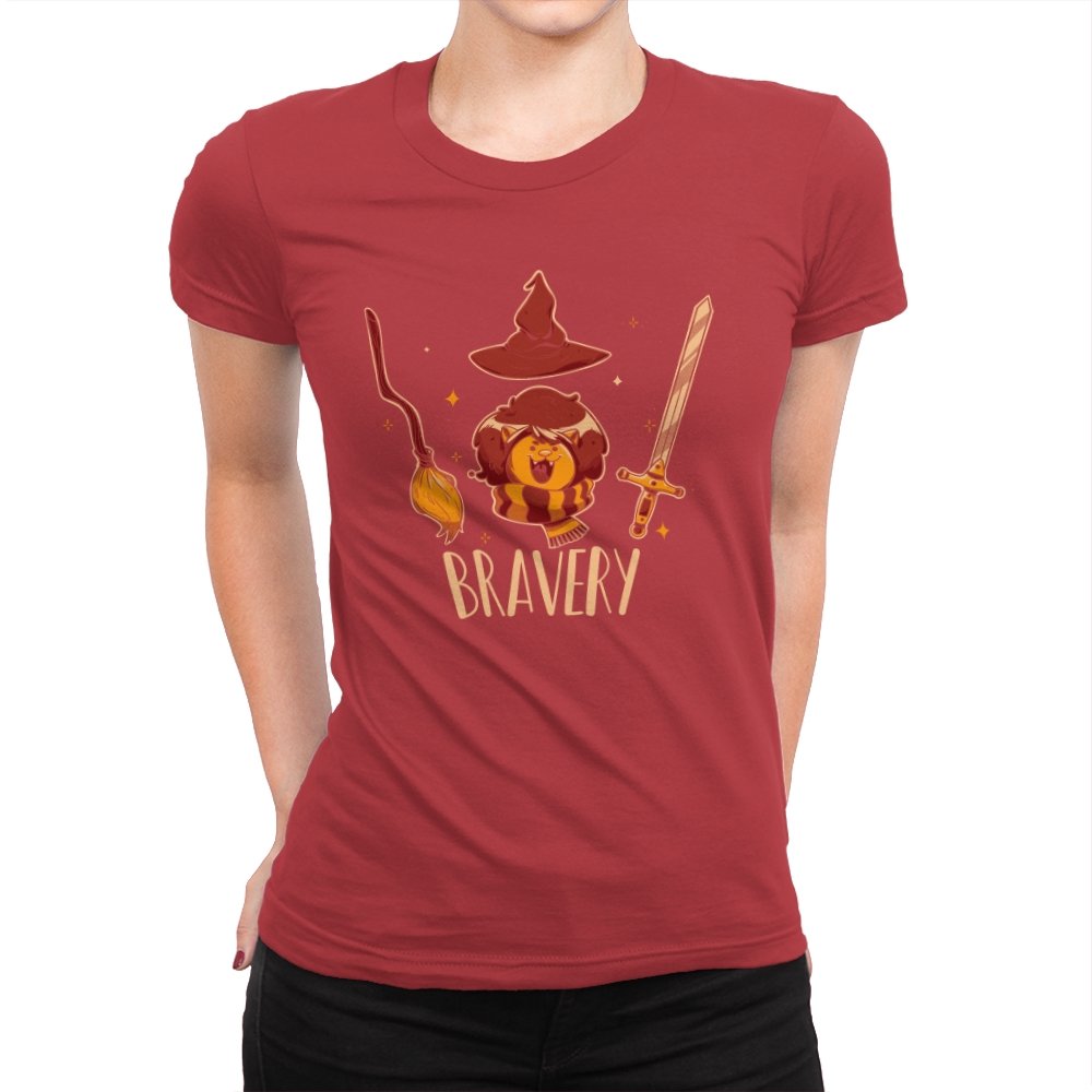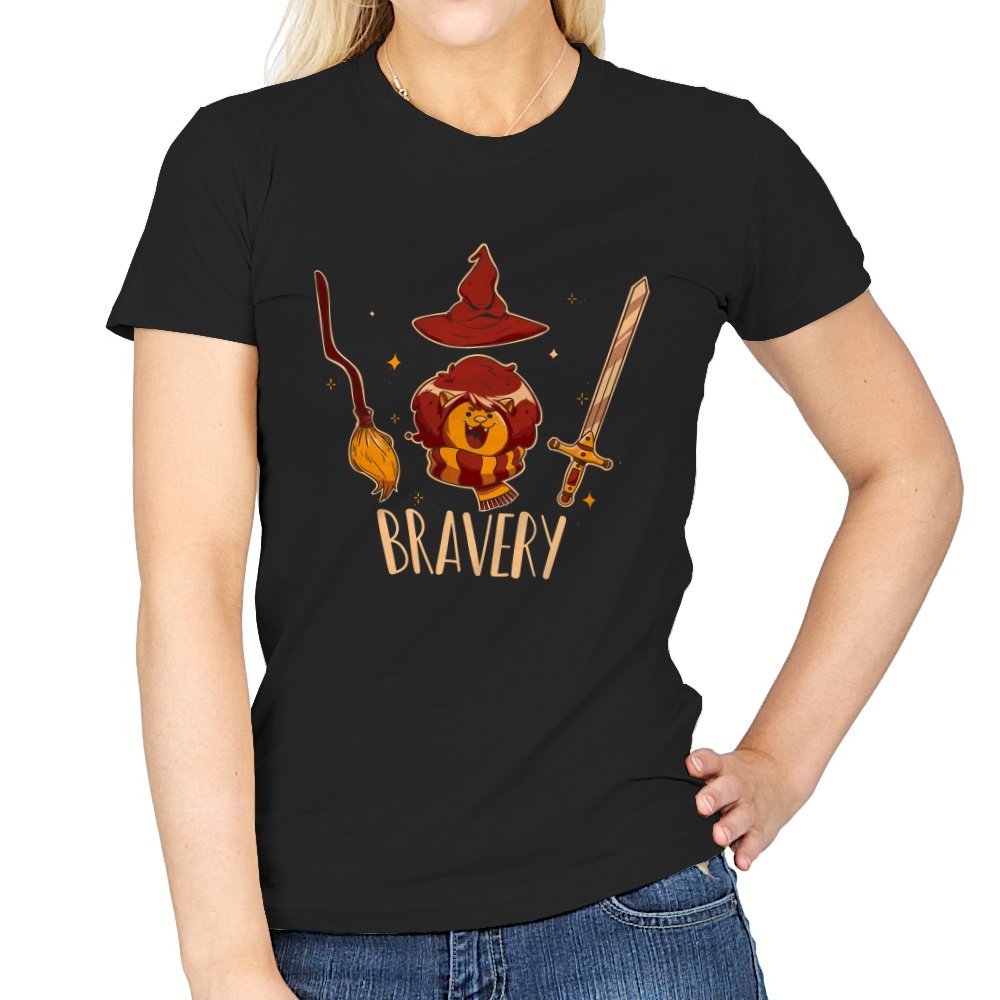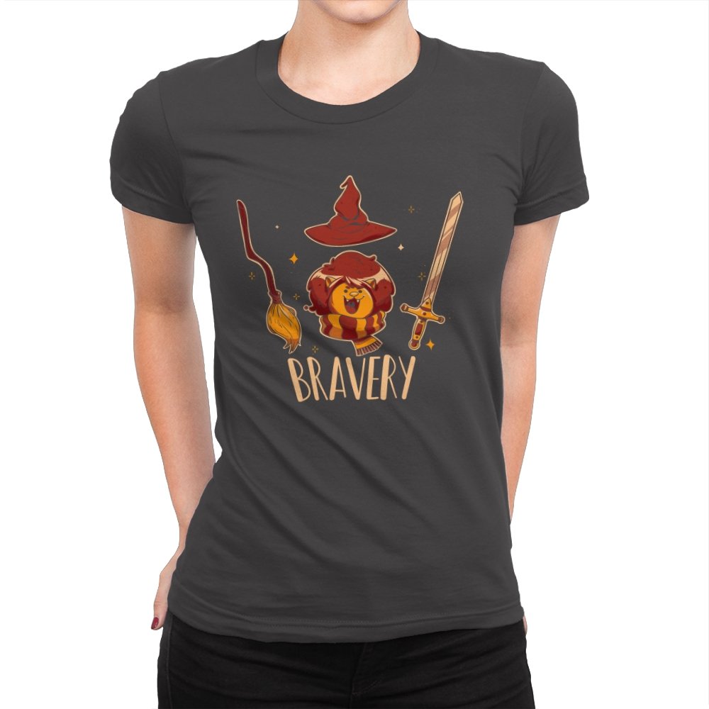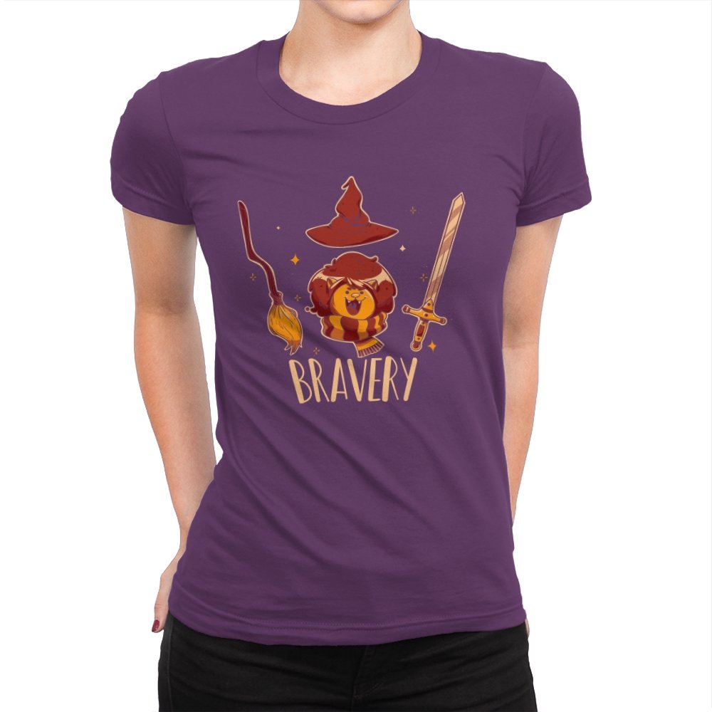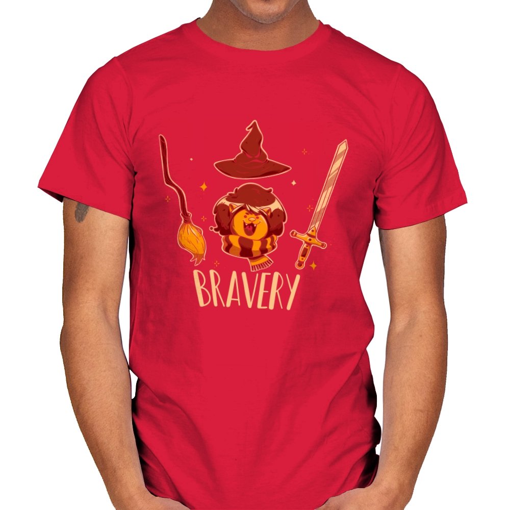 This design breaks courage down into a few instantly recognizable symbols, arranged with playful clarity. A small lion sits proudly beneath a pointed hat, flanked by a broom and a sword, each object doing its share of the storytelling. The warm colors and rounded lines keep the tone friendly rather than epic. Fans who get the reference will smile at how simply the idea is communicated.