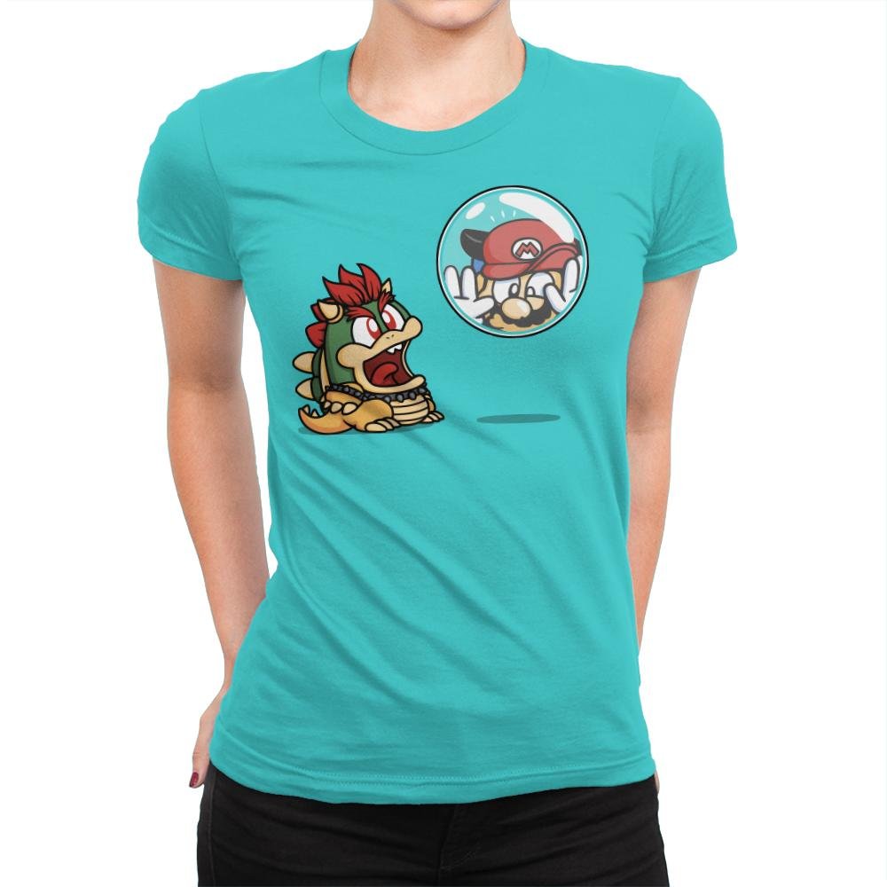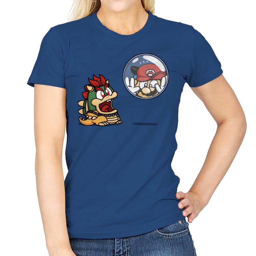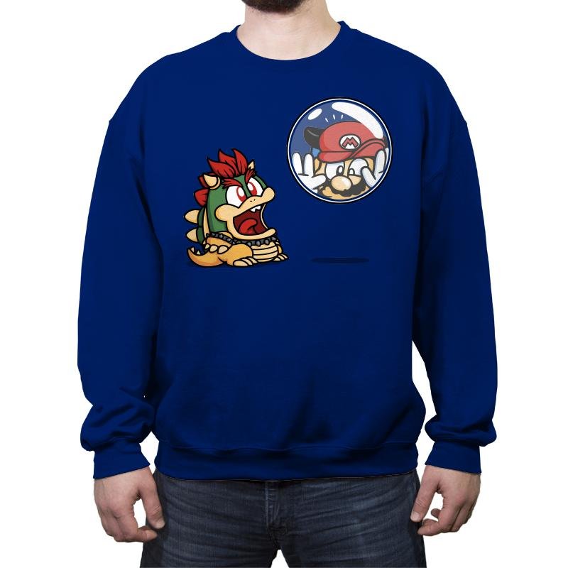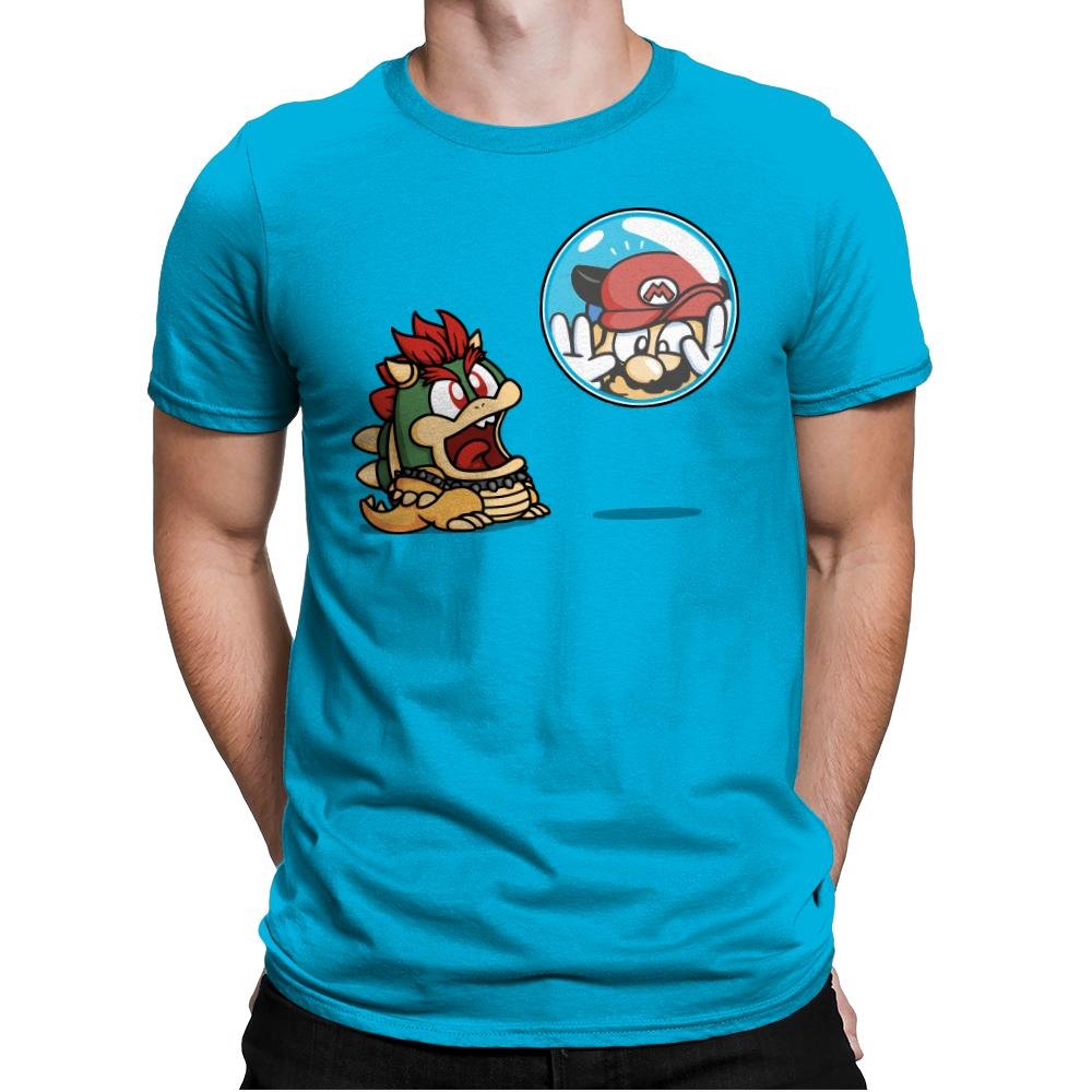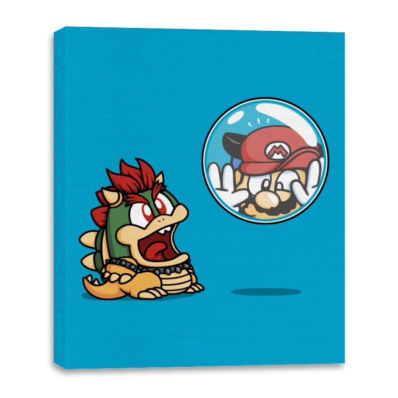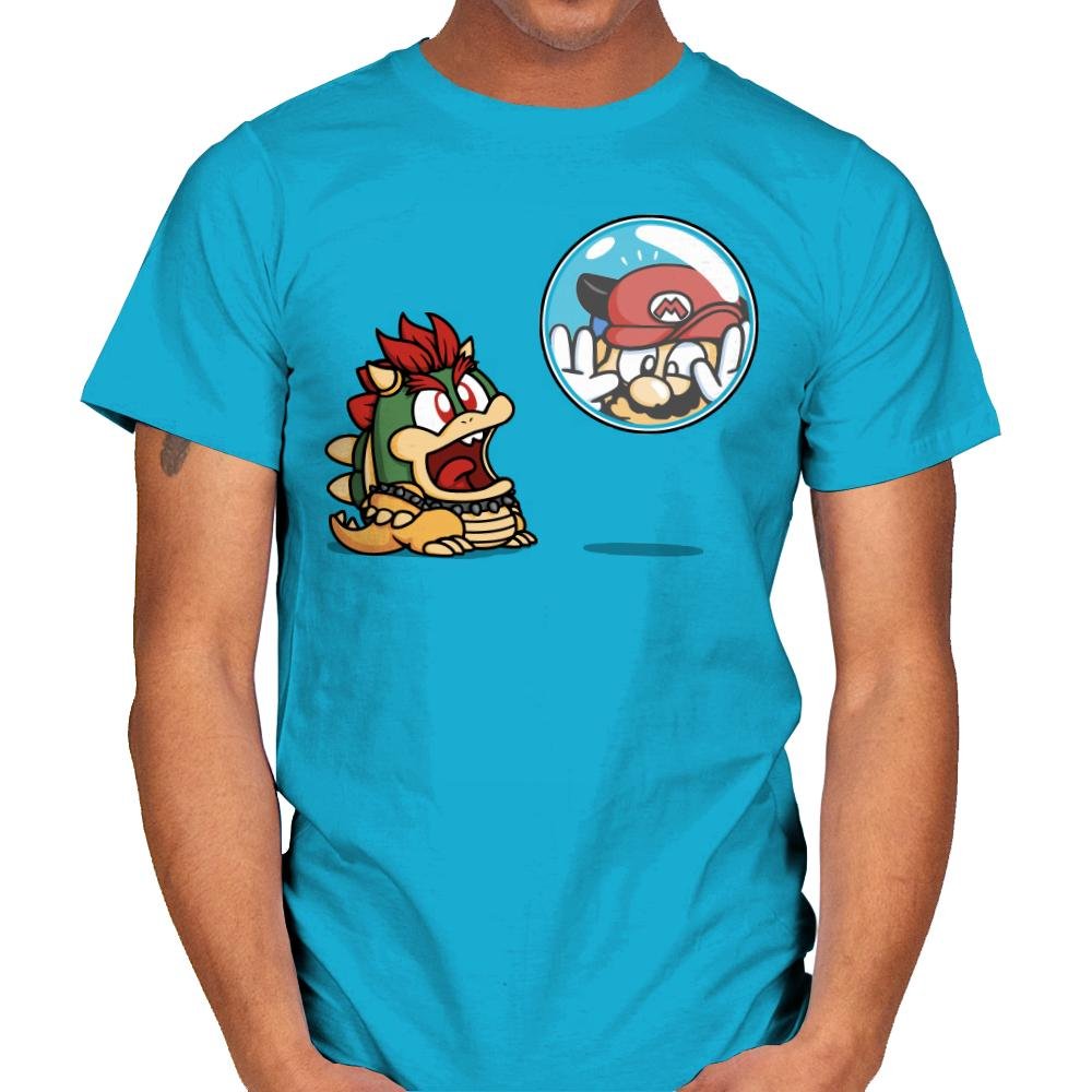 A spiky shell boss stares down a floating bubble that contains a very familiar mustached hero. The scene feels like a paused boss fight where the power balance suddenly flipped. Clean lines, bold colors, and lots of empty space make the joke land fast. If you grew up dodging fireballs and jumping on heads, you already know the moment this is poking at.
