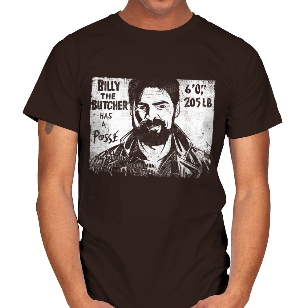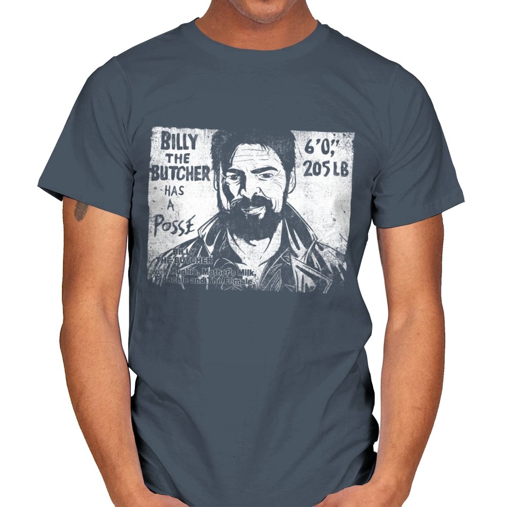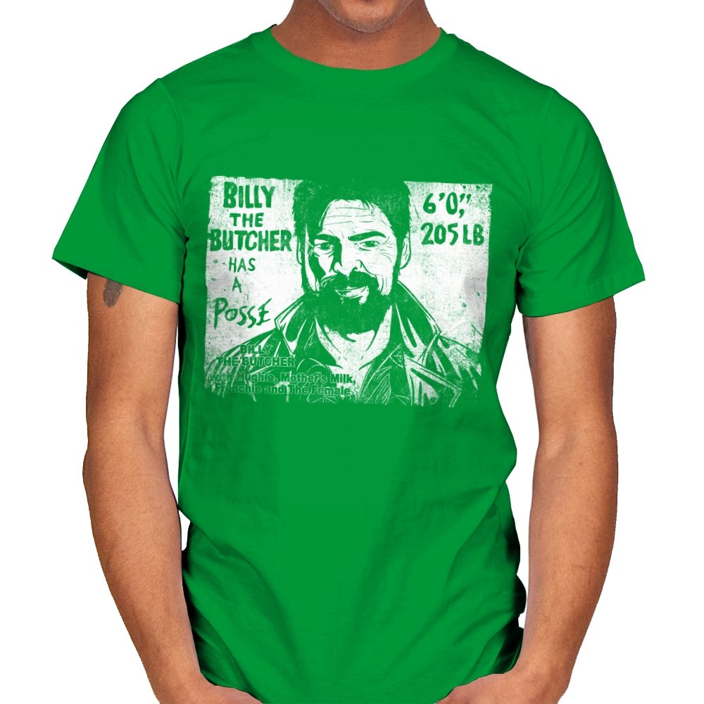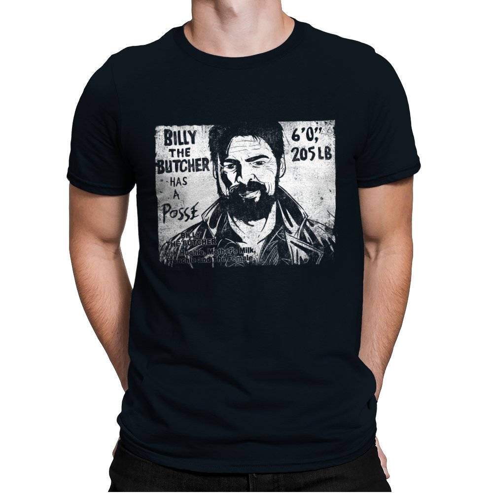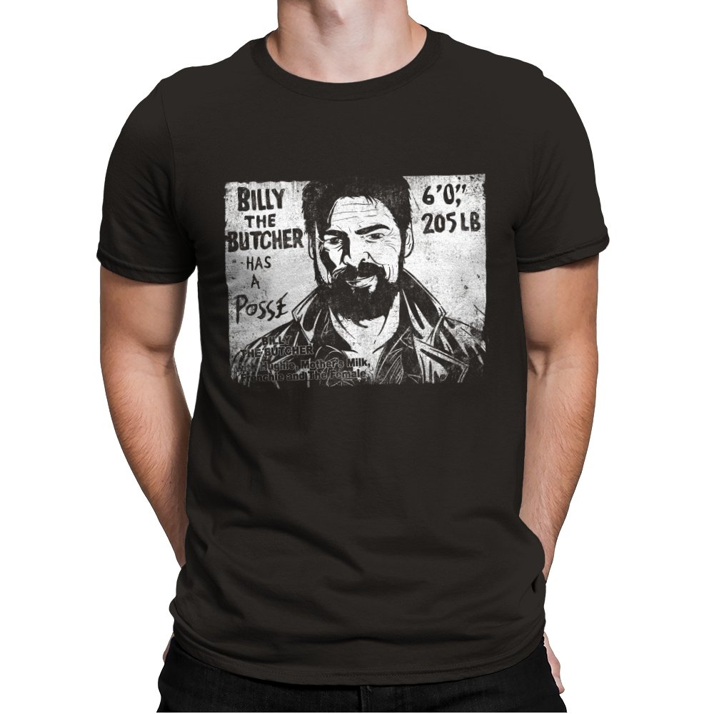 This design turns a grinning trench coat tough guy into the subject of a battered street sticker. The rough black and white texture lists his height, weight, and the fact that he has a posse of misfits that viewers of a certain ultraviolent satire already know well. The lettering feels hand cut, the shadows feel photocopied, and the whole image looks like it belongs on a brick wall behind a dive bar. Fans get the joke instantly because it blends punk attitude with comic book mayhem.