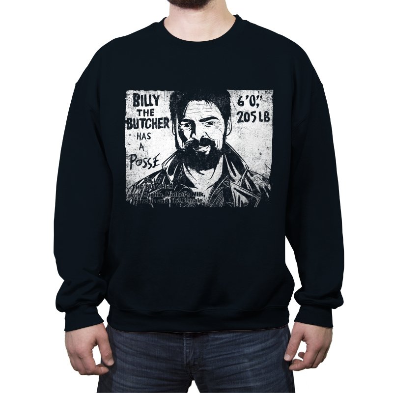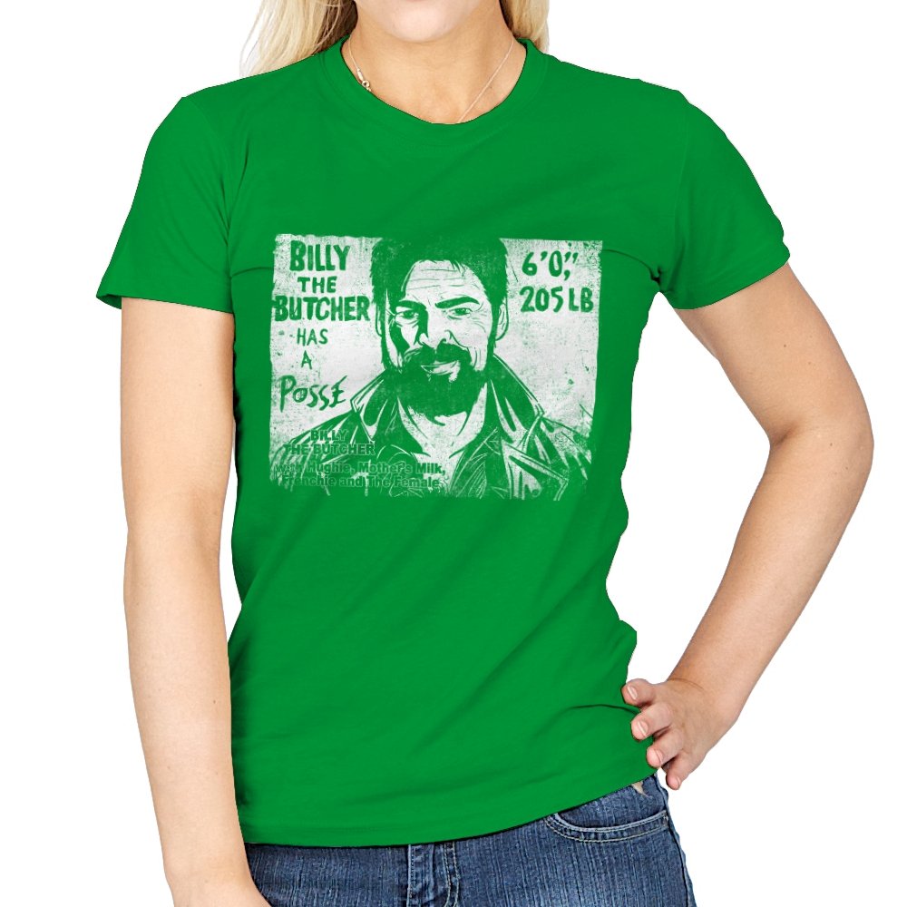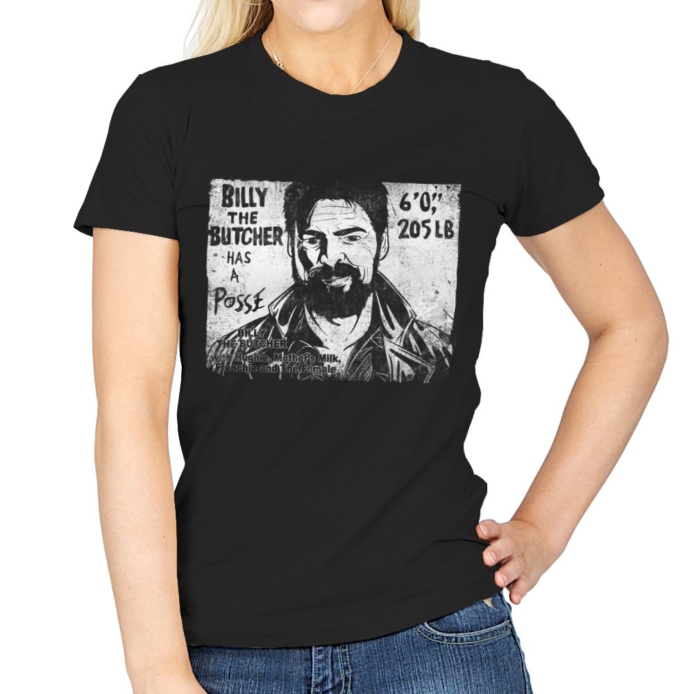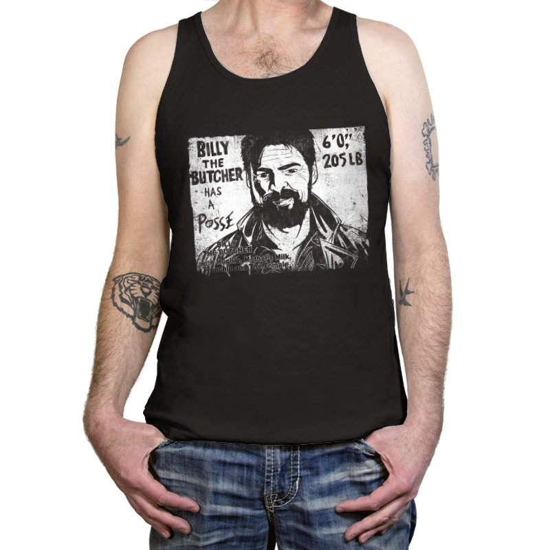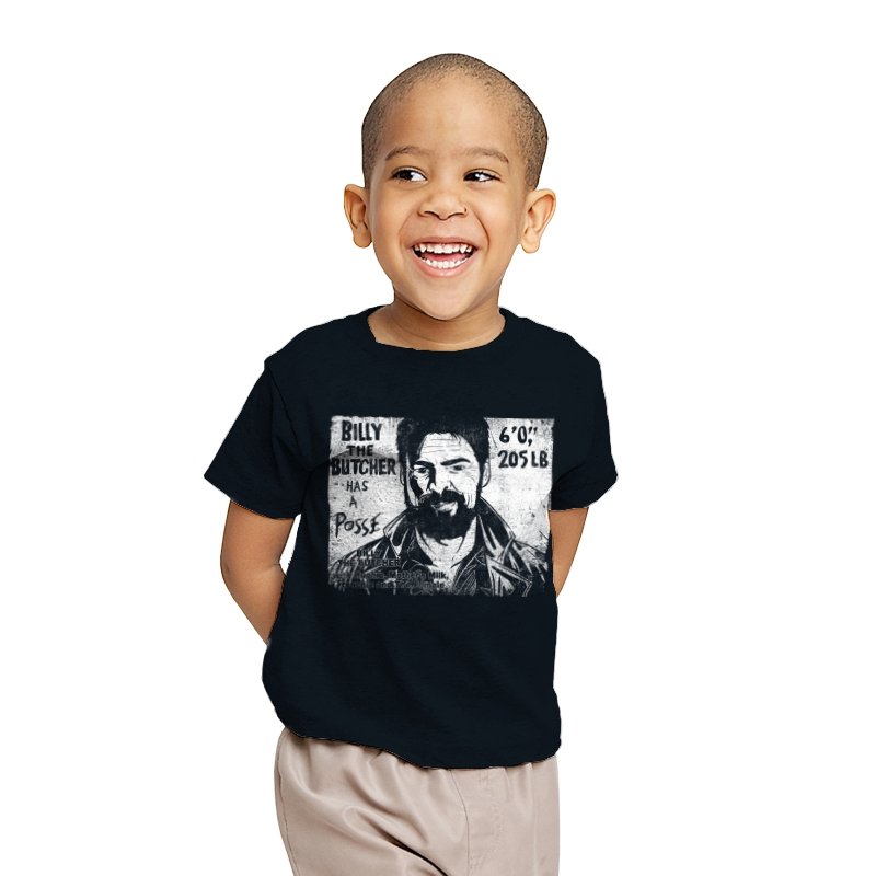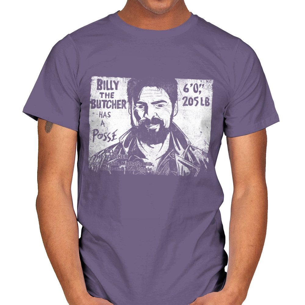 This design turns a grinning trench coat tough guy into the subject of a battered street sticker. The rough black and white texture lists his height, weight, and the fact that he has a posse of misfits that viewers of a certain ultraviolent satire already know well. The lettering feels hand cut, the shadows feel photocopied, and the whole image looks like it belongs on a brick wall behind a dive bar. Fans get the joke instantly because it blends punk attitude with comic book mayhem.