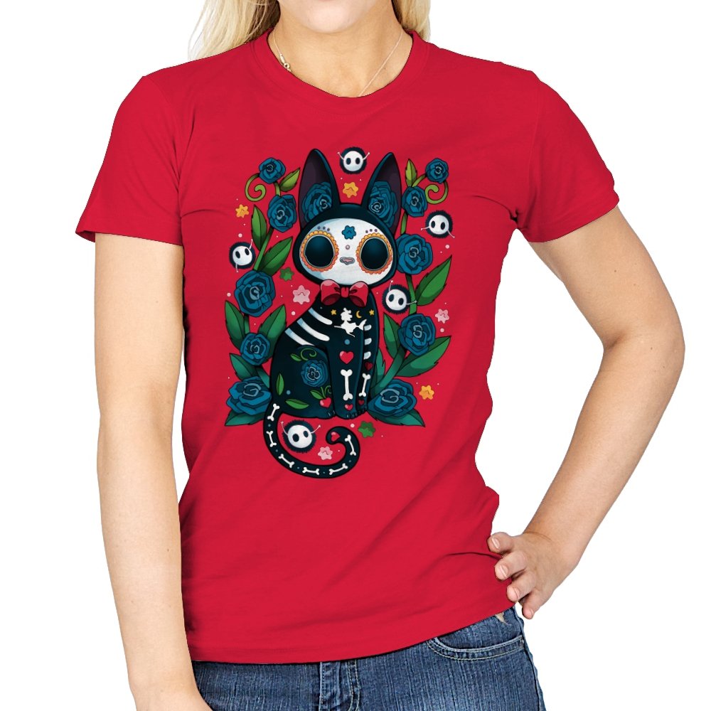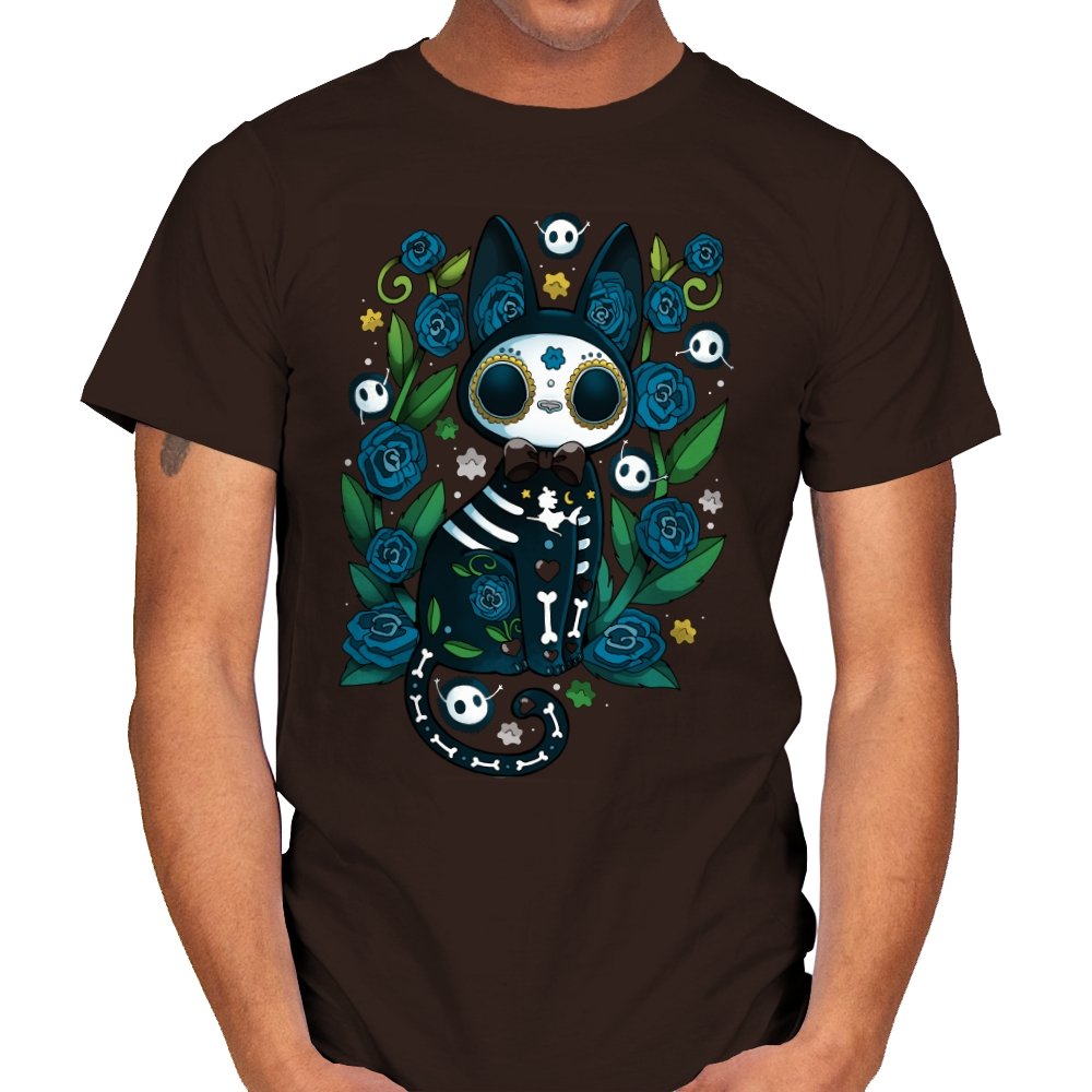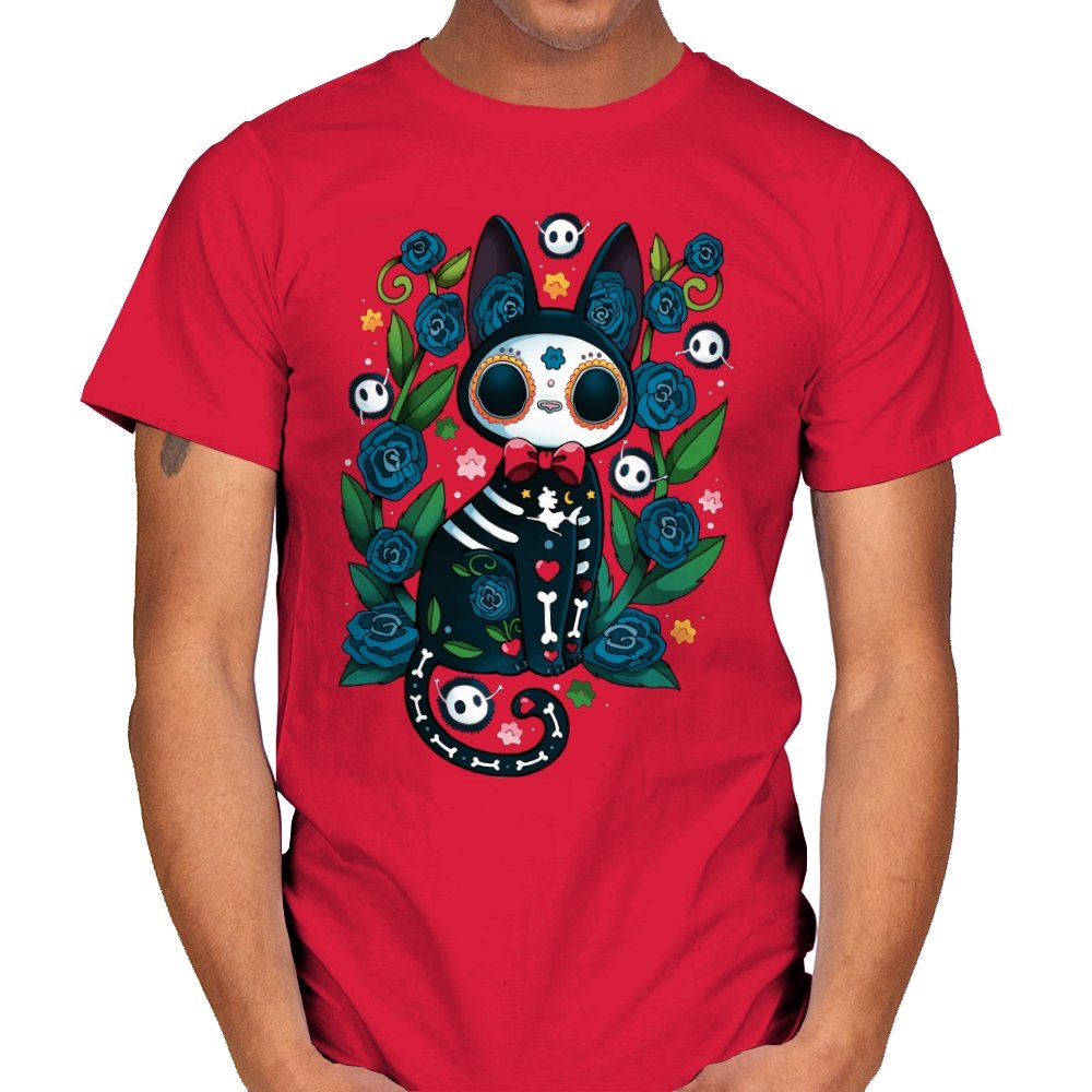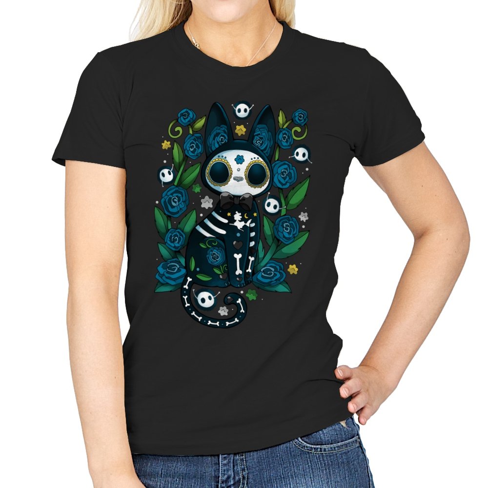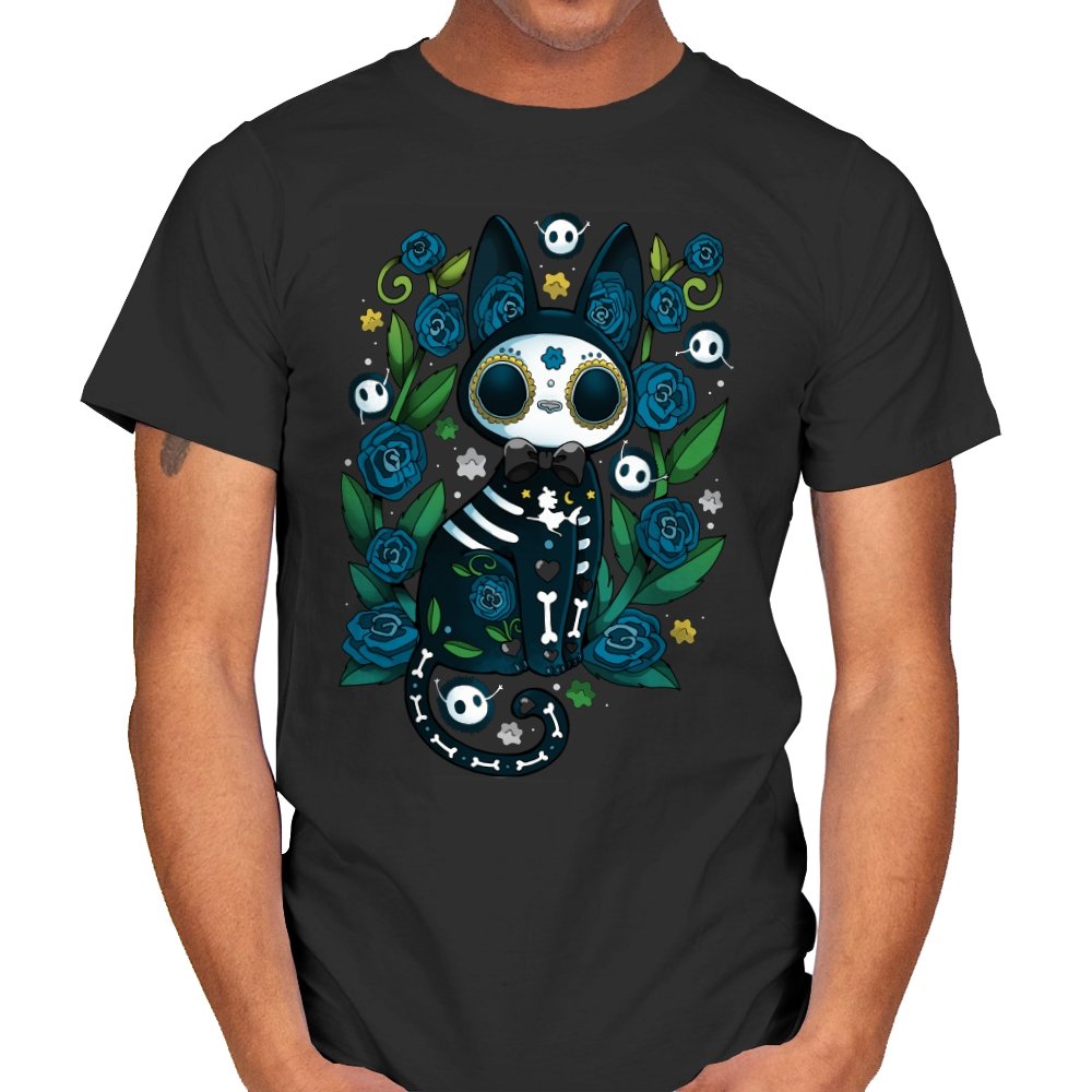 This design blends sugar skull symbolism with a familiar witchy silhouette, turning a black cat into something both cute and ceremonial. Floral details, stitched bones, and bright accents balance the darker theme with careful symmetry and color. It feels hand-illustrated and intentional, pulling from folklore and festival imagery without spelling it out. If you recognize the visual language, the reference speaks quietly but clearly.