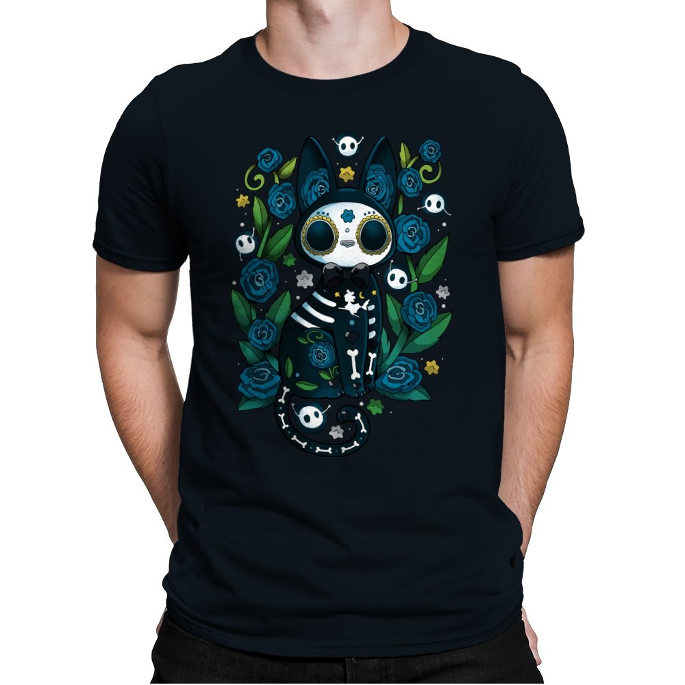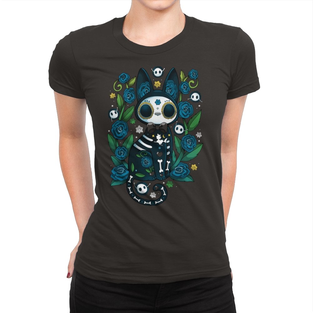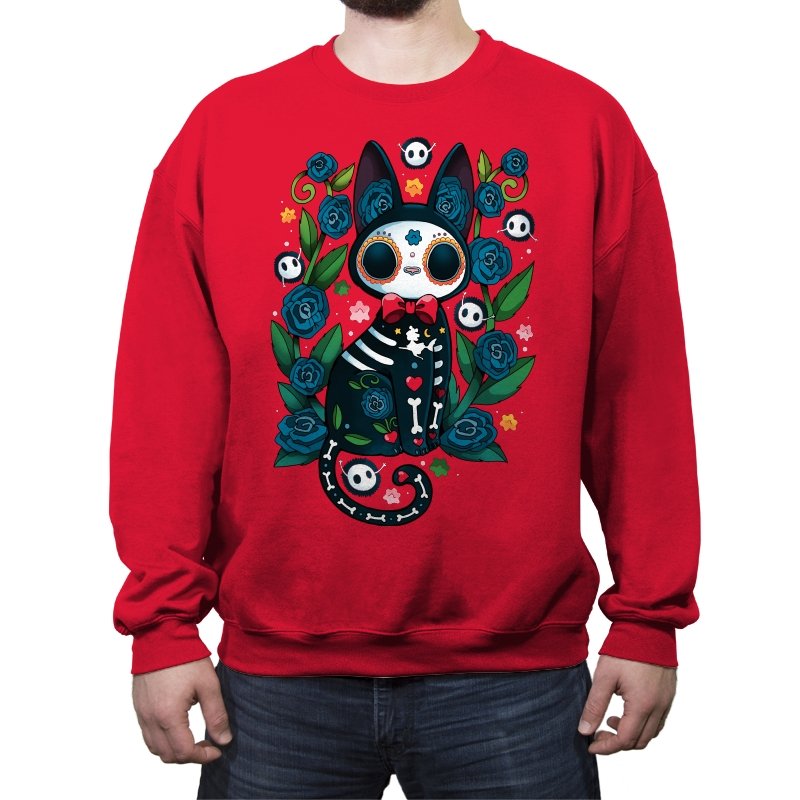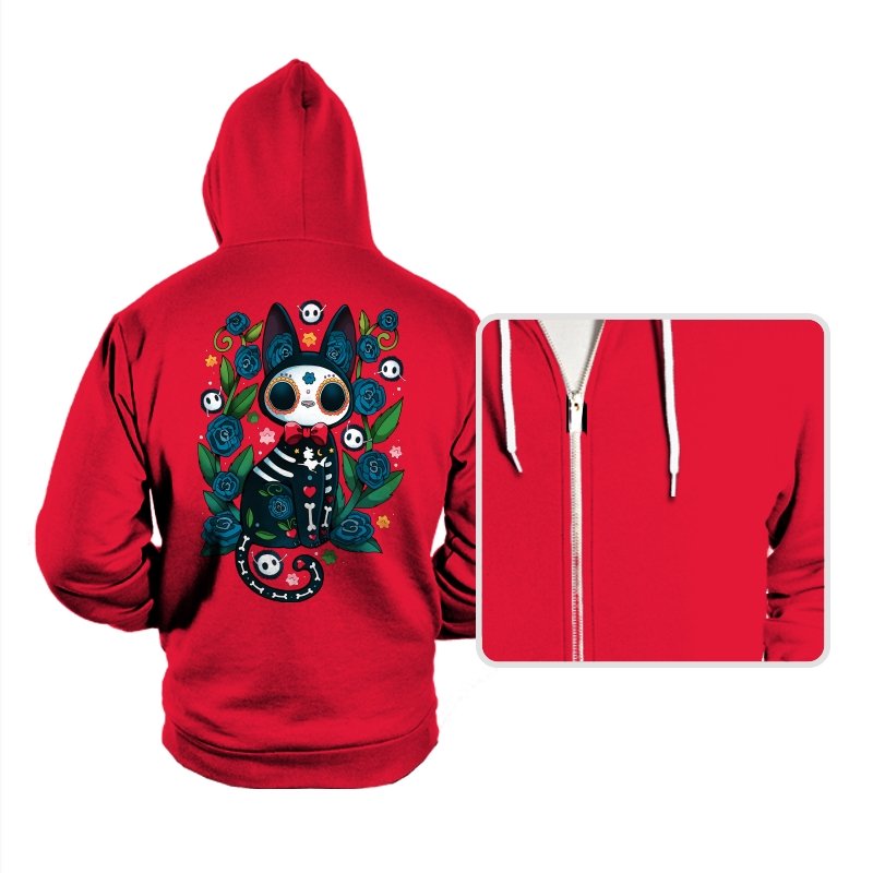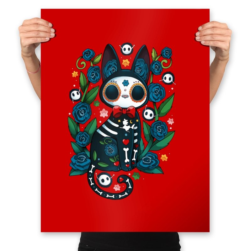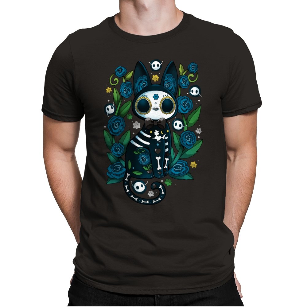 This design blends sugar skull symbolism with a familiar witchy silhouette, turning a black cat into something both cute and ceremonial. Floral details, stitched bones, and bright accents balance the darker theme with careful symmetry and color. It feels hand-illustrated and intentional, pulling from folklore and festival imagery without spelling it out. If you recognize the visual language, the reference speaks quietly but clearly.