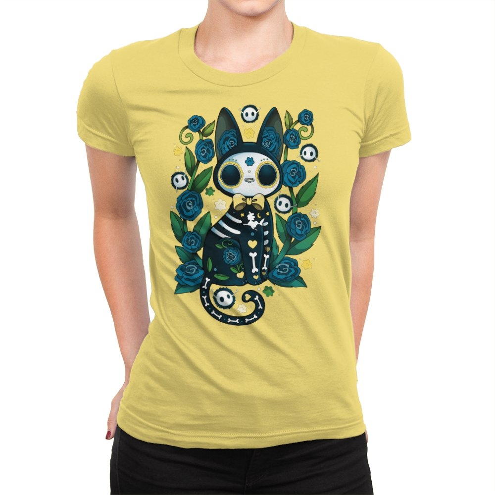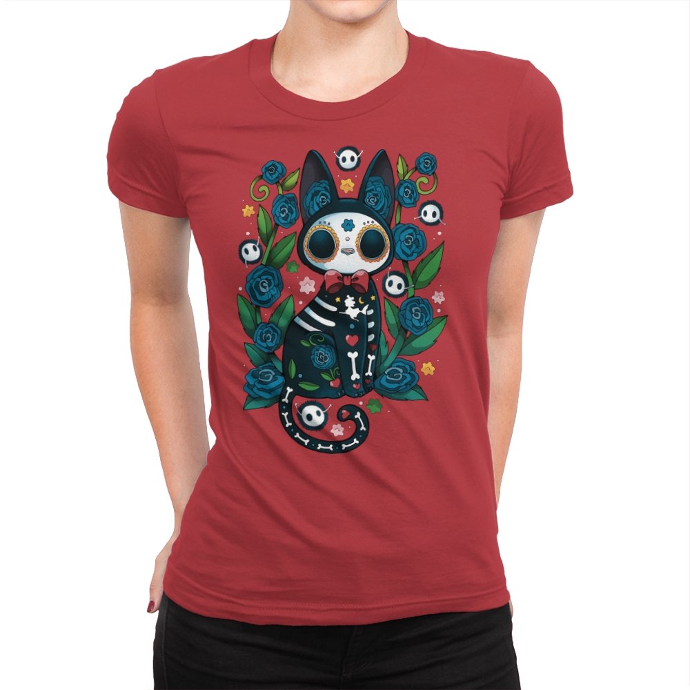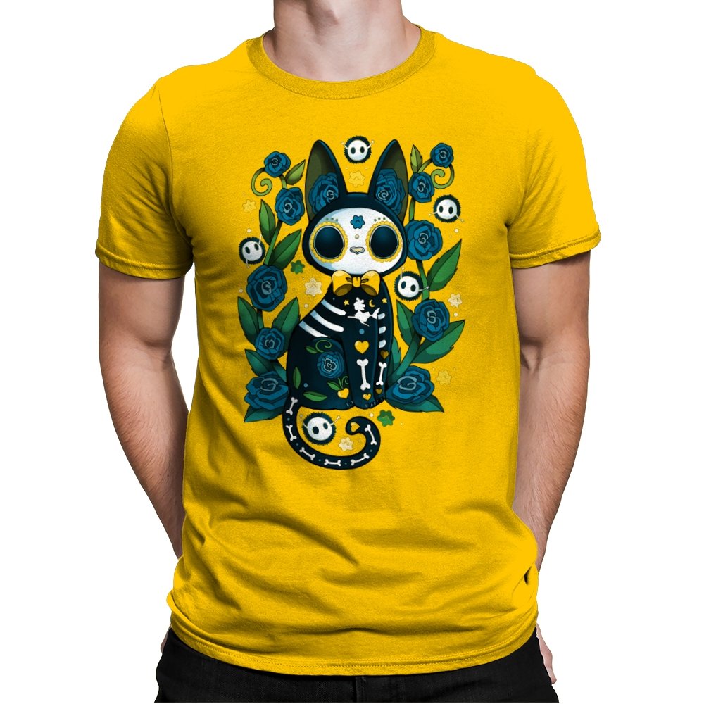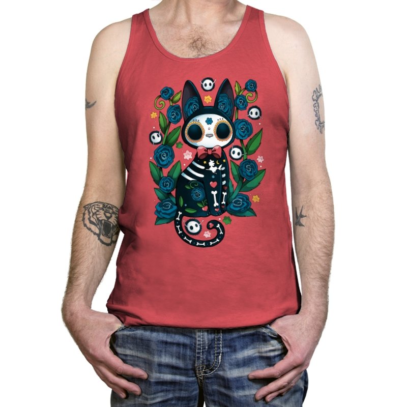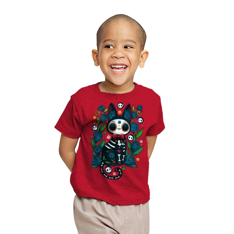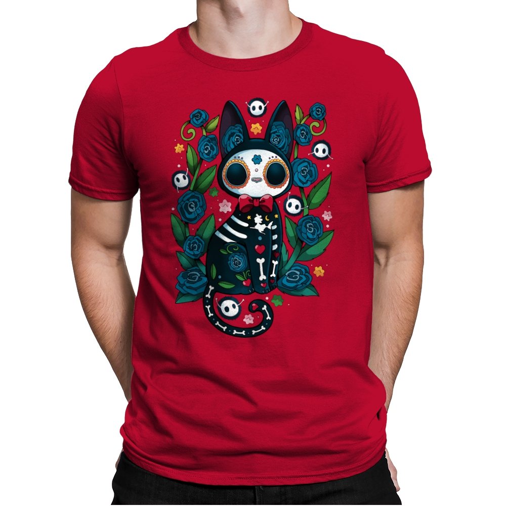 This design blends sugar skull symbolism with a familiar witchy silhouette, turning a black cat into something both cute and ceremonial. Floral details, stitched bones, and bright accents balance the darker theme with careful symmetry and color. It feels hand-illustrated and intentional, pulling from folklore and festival imagery without spelling it out. If you recognize the visual language, the reference speaks quietly but clearly.