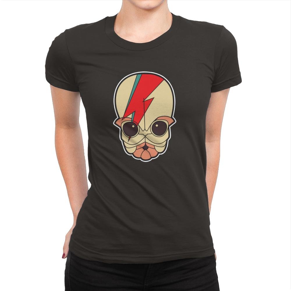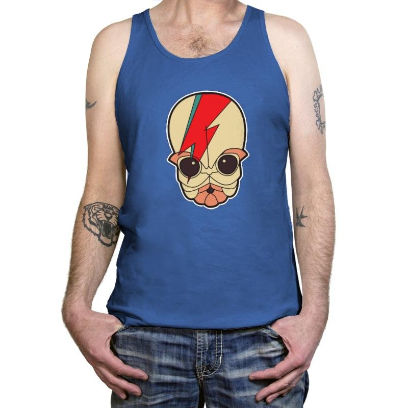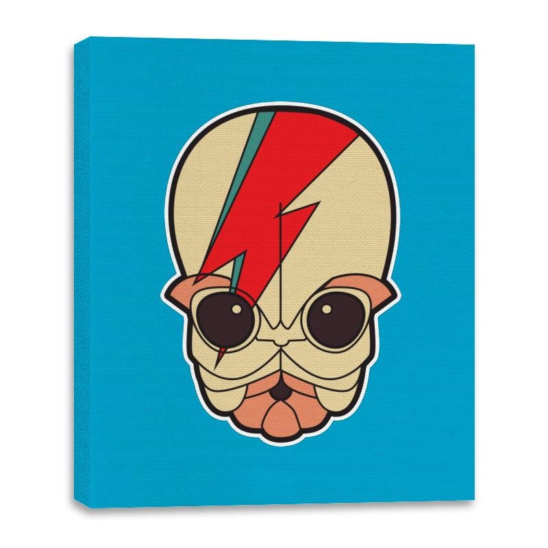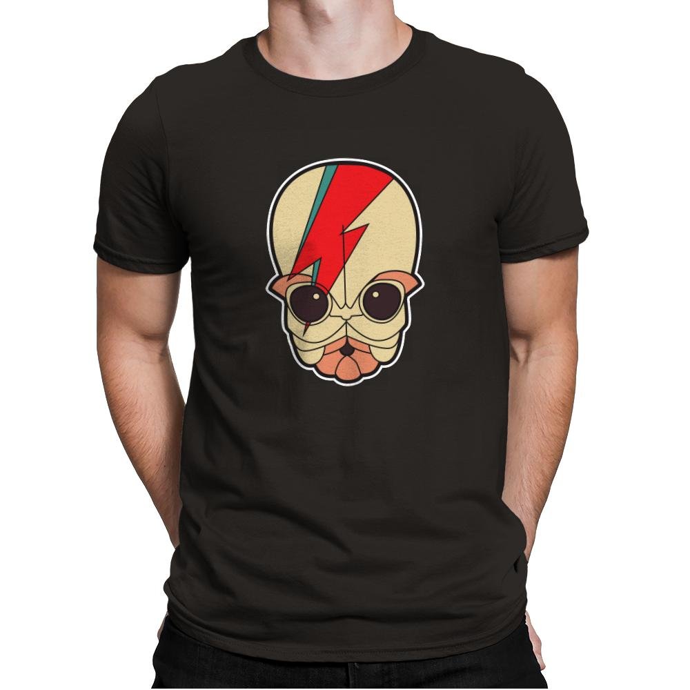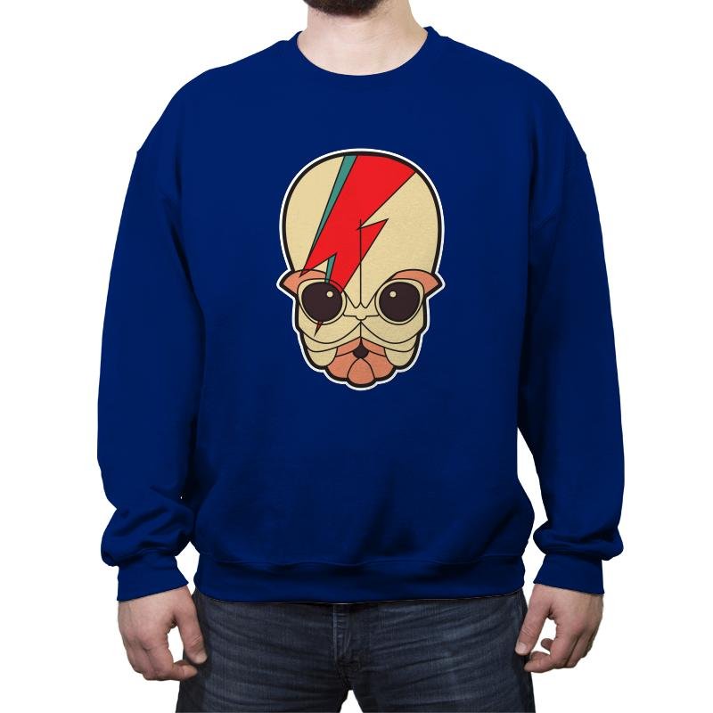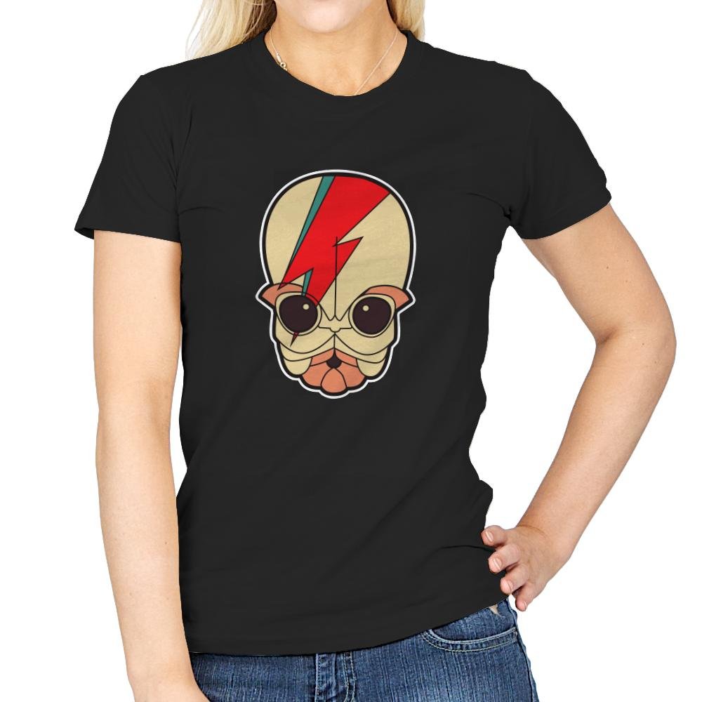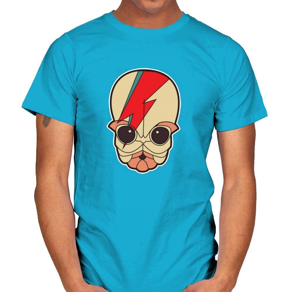 This design turns a big eyed cantina alien into a glam era lightning icon. The head is drawn in a clean cartoon style, then cut by a bold red bolt across one eye. It blends space bar weirdness with vintage stage persona energy in one simple graphic. The flat colors and thick lines make the mashup readable from across the room.