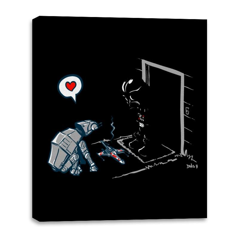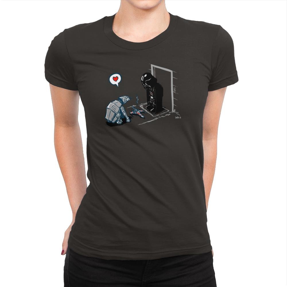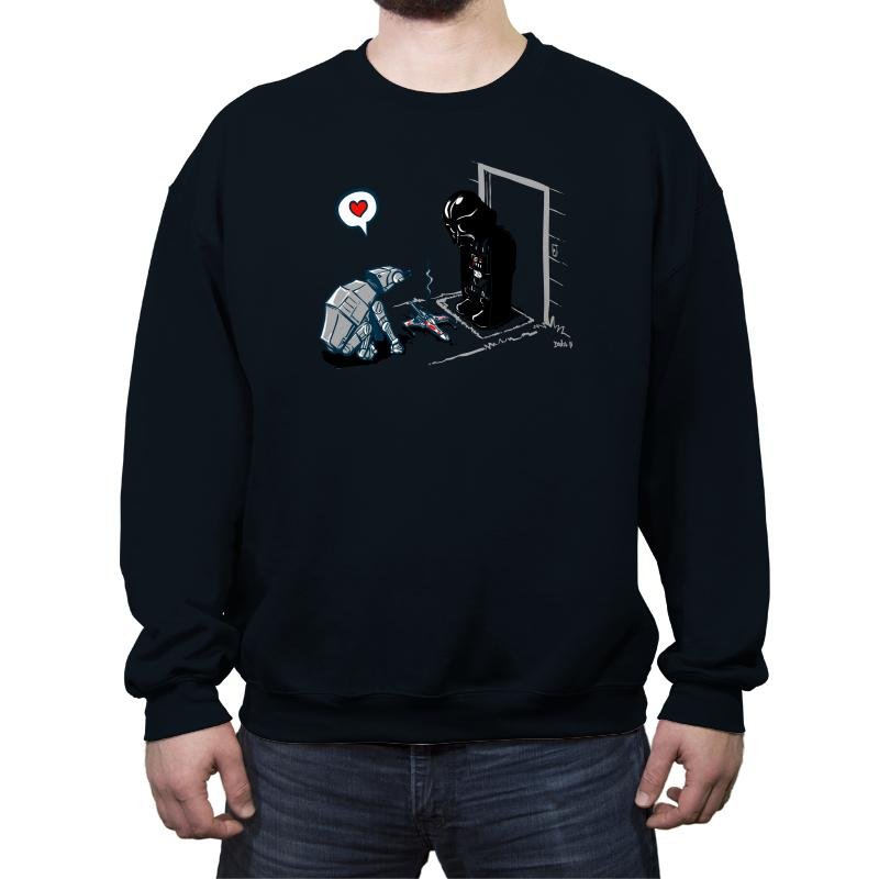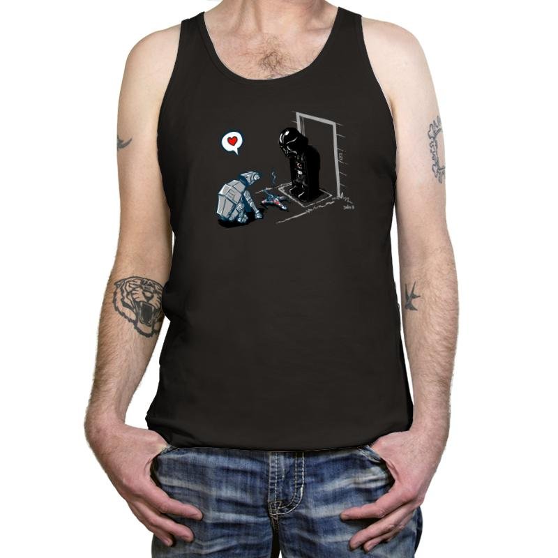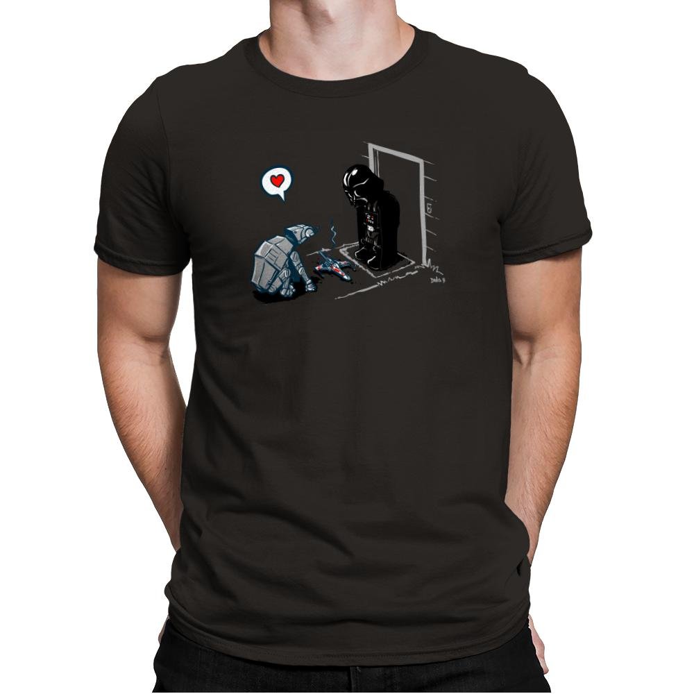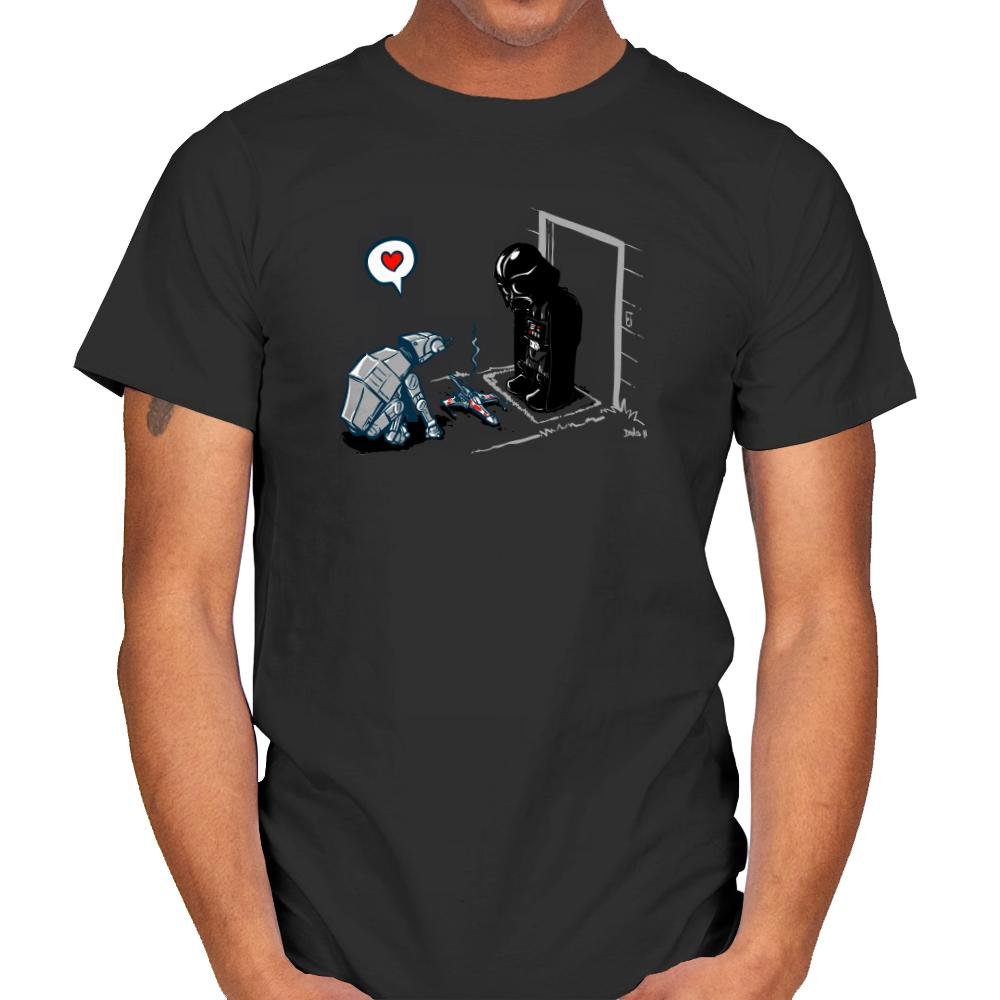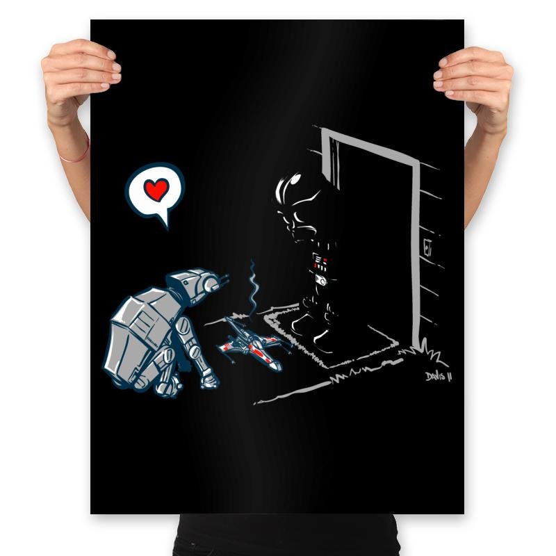 This design captures the moment when your massive four-legged Imperial walker decides to act like a house cat, bringing a “gift” through the pet door to its owner. The fallen droid serves as the offering while the dark lord inside receives this gesture of feline affection with appropriate menace. The heart speech bubble and the walker’s posture perfectly mirror that universal cat behavior of presenting dead things as tokens of love. It’s Star Wars filtered through the logic of domestic cat ownership.