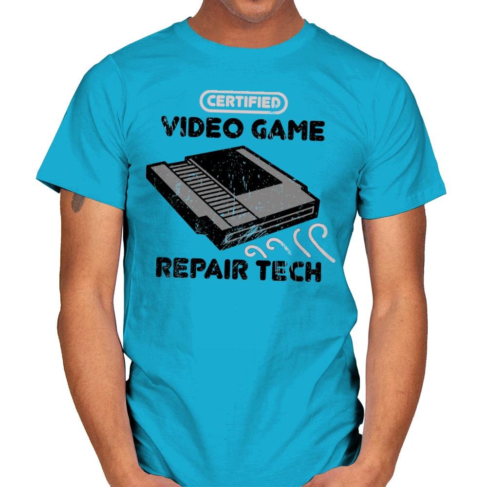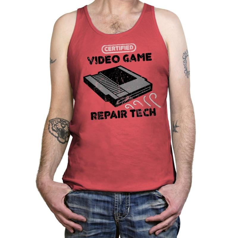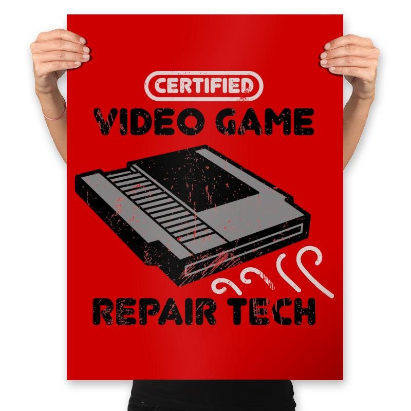 This design treats early gaming hardware like a professional credential. A classic cartridge console sits front and center, rendered with sharp angles and worn texture, framed by bold text that reads like a stamped certification. The red background and distressed finish give it the look of a shop sign or a warning label pulled straight from a repair bench. It feels earned, not decorative.