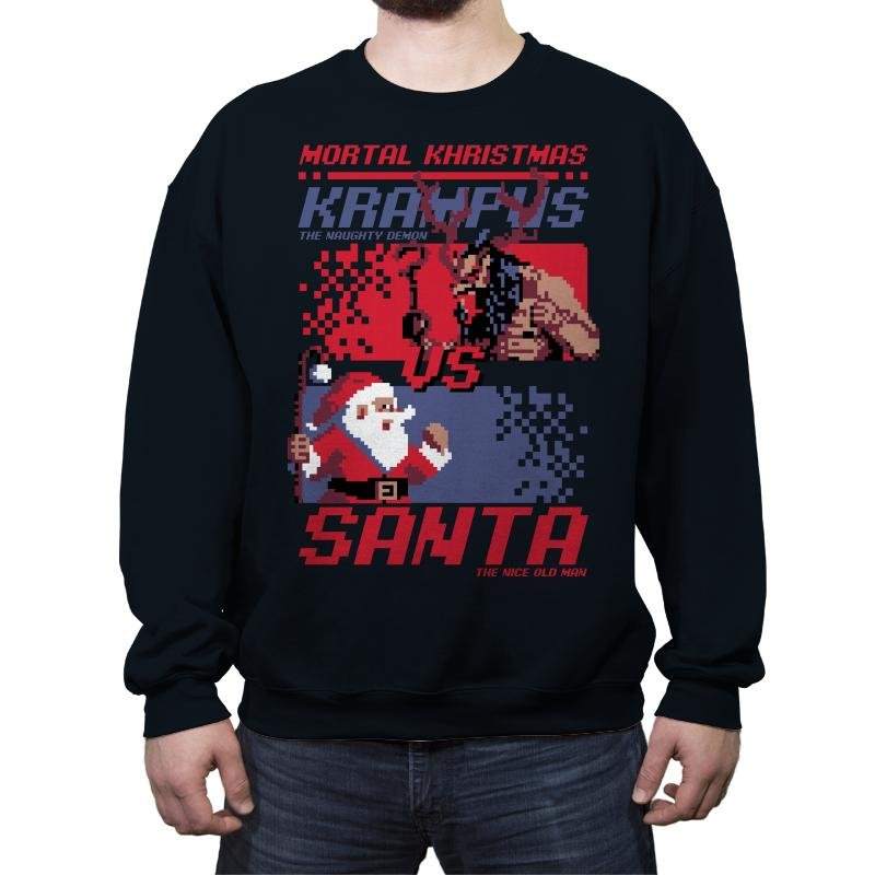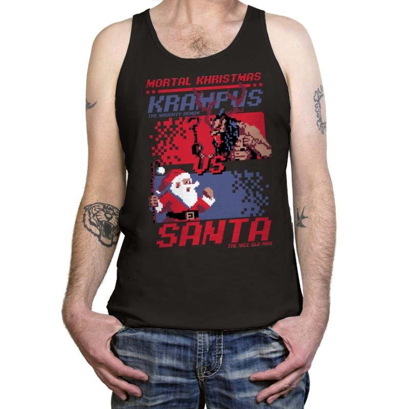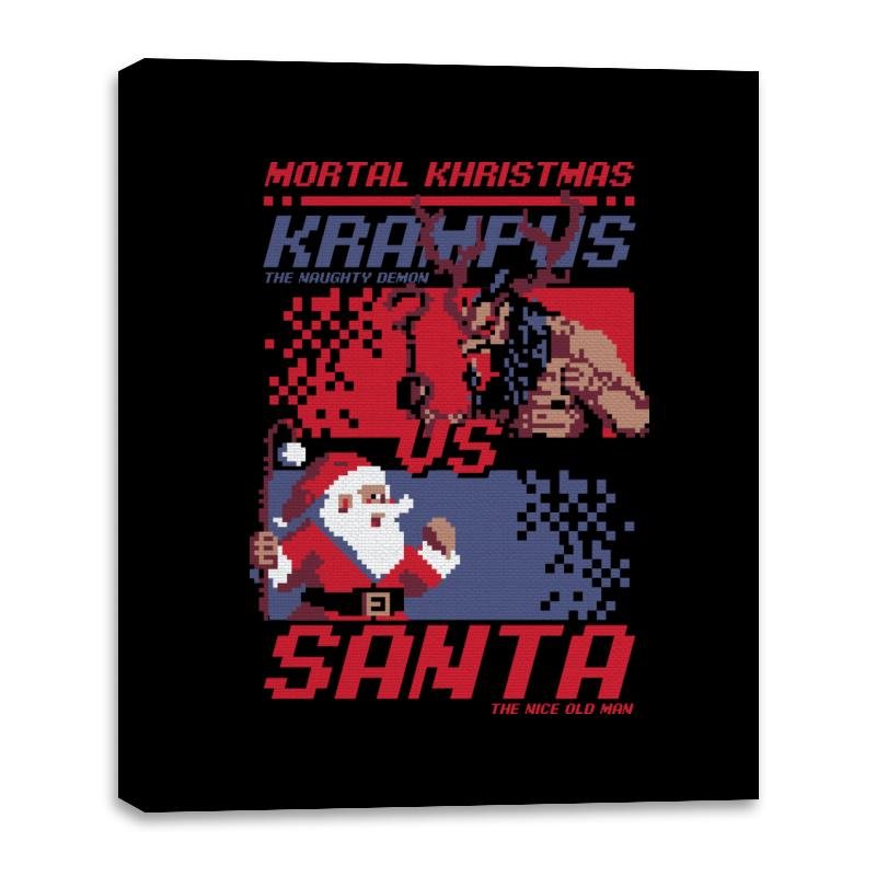 A split-screen pixel arena pits a blocky holiday hero against a horned winter menace, rendered in chunky sprites and limited color like a late-night arcade cabinet. The layout echoes classic fighting game intros, complete with dramatic poses and glitchy transitions between sides. Red and blue panels clash while digital debris sells the impact, making it feel mid-match rather than promotional. It captures the joy of button-mashing bravado with a seasonal twist.