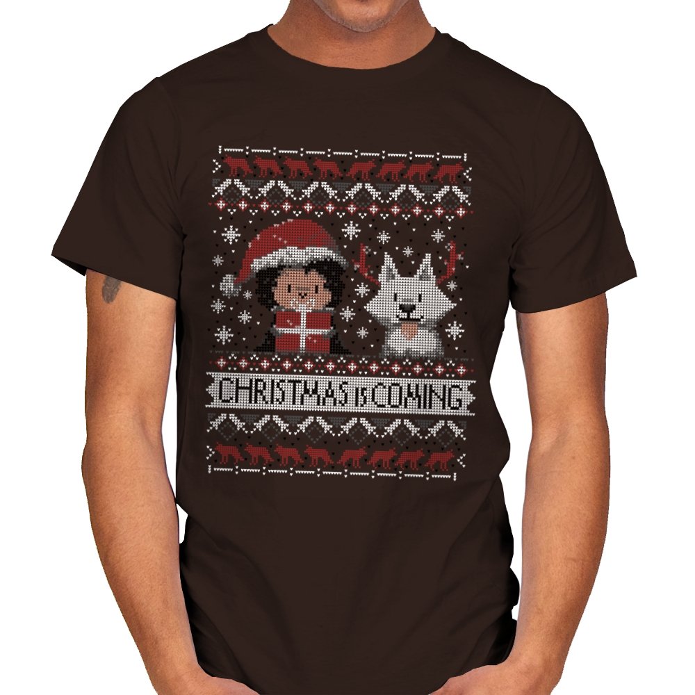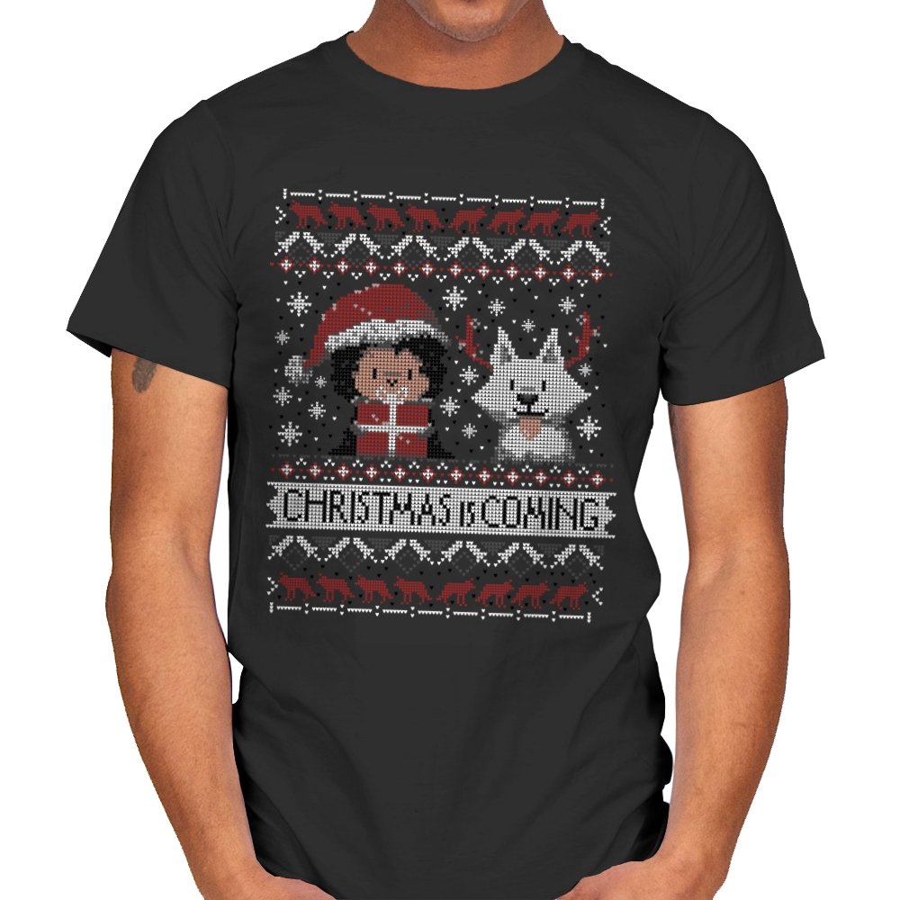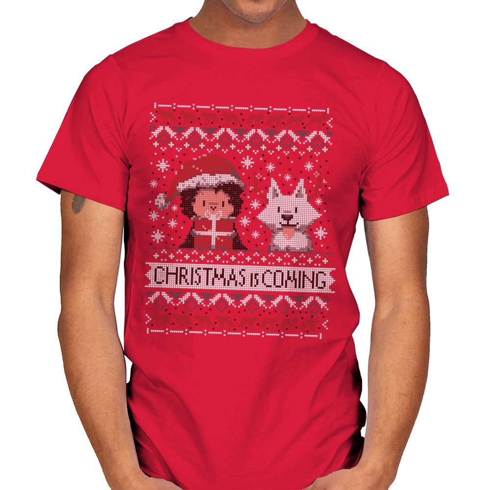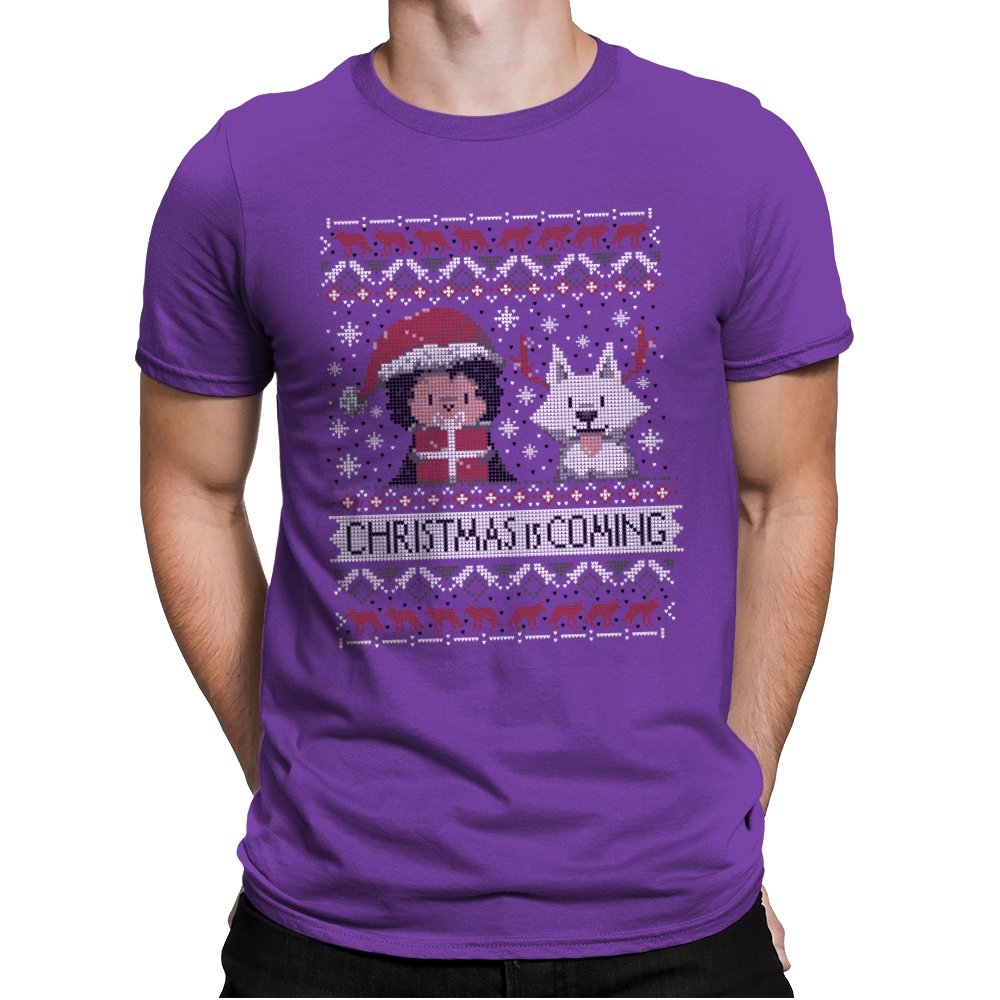 This design riffs on a famous fantasy winter warning but flips it into holiday mode. A chibi warrior in red stands beside a pale wolf companion, both stitched in a pixel sweater style. Snowflakes, deer, and stark patterns frame the pair as “Christmas Is Coming” anchors the scene. Fans will spot the reference without needing it spelled out.