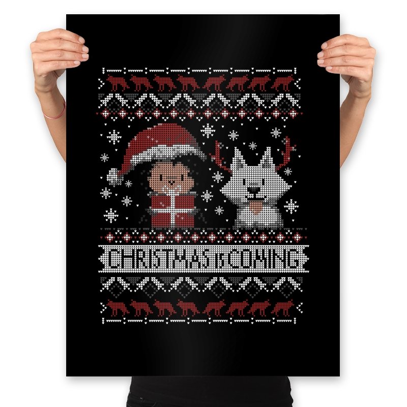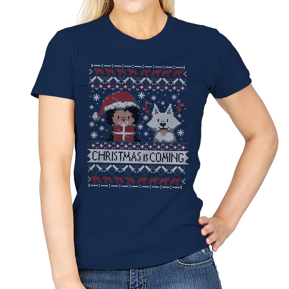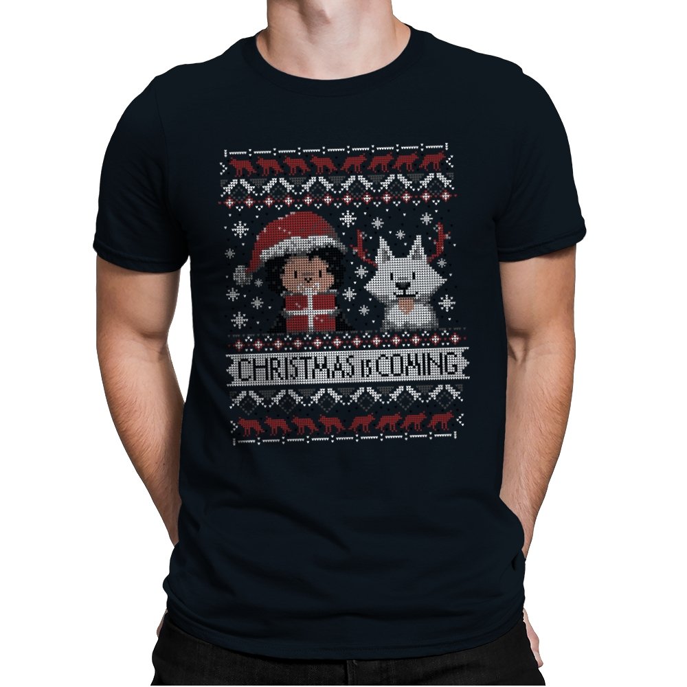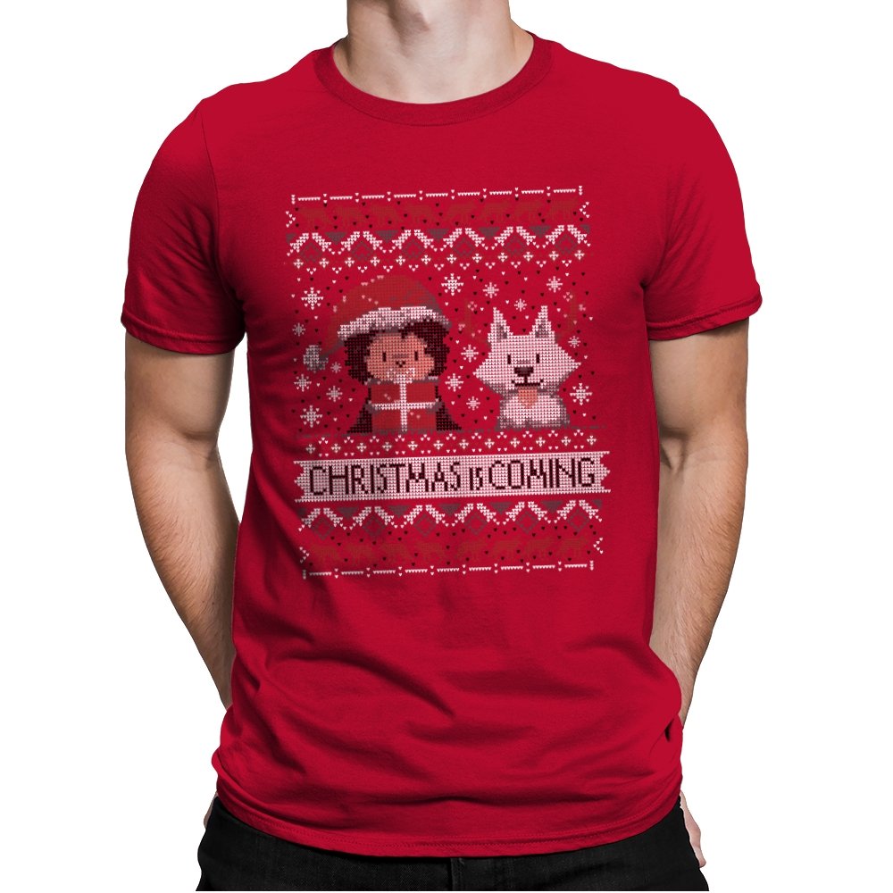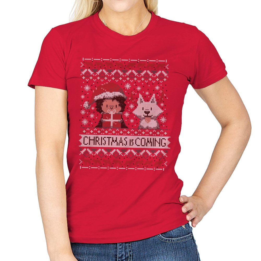 This design riffs on a famous fantasy winter warning but flips it into holiday mode. A chibi warrior in red stands beside a pale wolf companion, both stitched in a pixel sweater style. Snowflakes, deer, and stark patterns frame the pair as “Christmas Is Coming” anchors the scene. Fans will spot the reference without needing it spelled out.