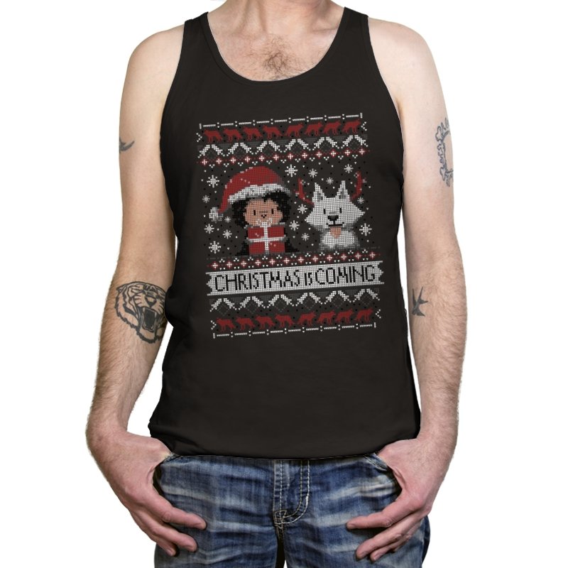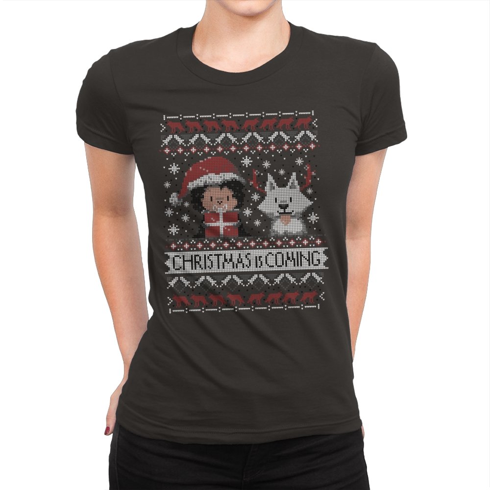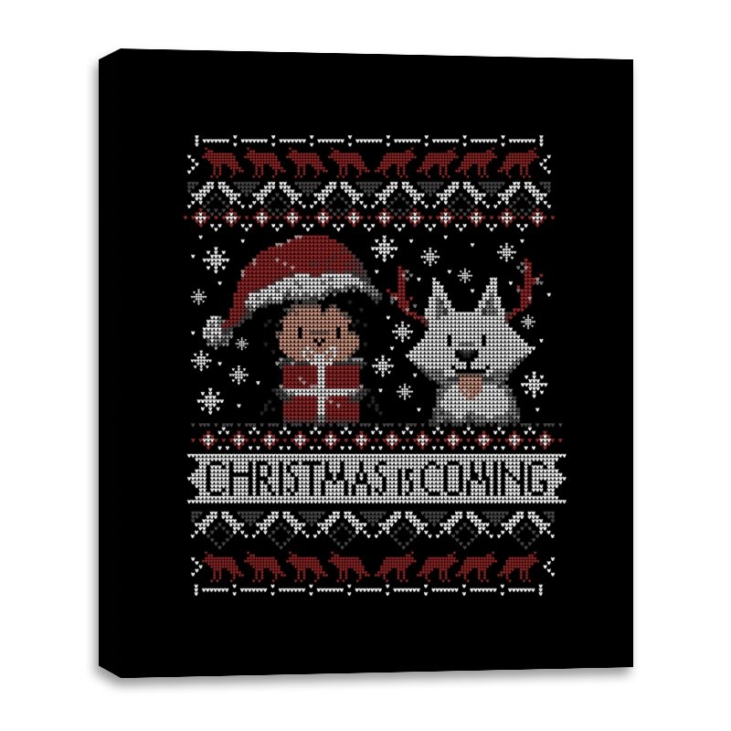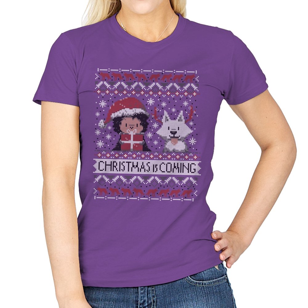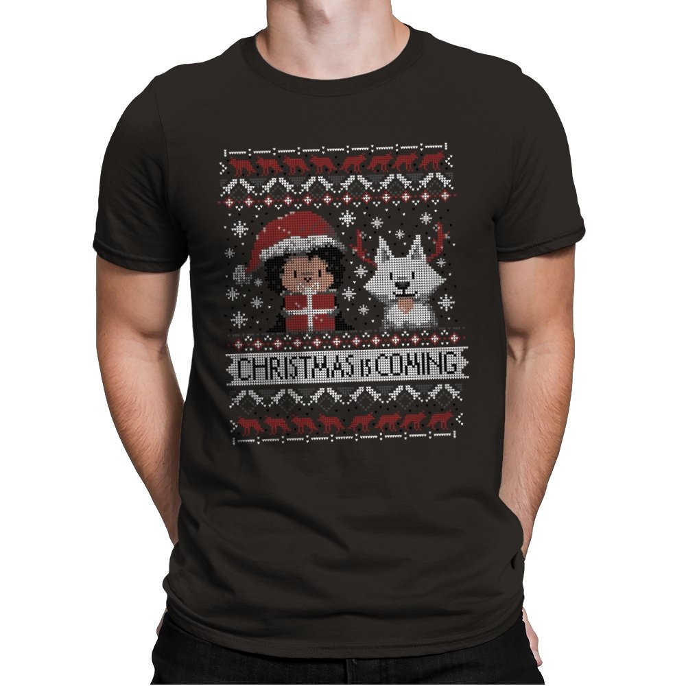 This design riffs on a famous fantasy winter warning but flips it into holiday mode. A chibi warrior in red stands beside a pale wolf companion, both stitched in a pixel sweater style. Snowflakes, deer, and stark patterns frame the pair as “Christmas Is Coming” anchors the scene. Fans will spot the reference without needing it spelled out.