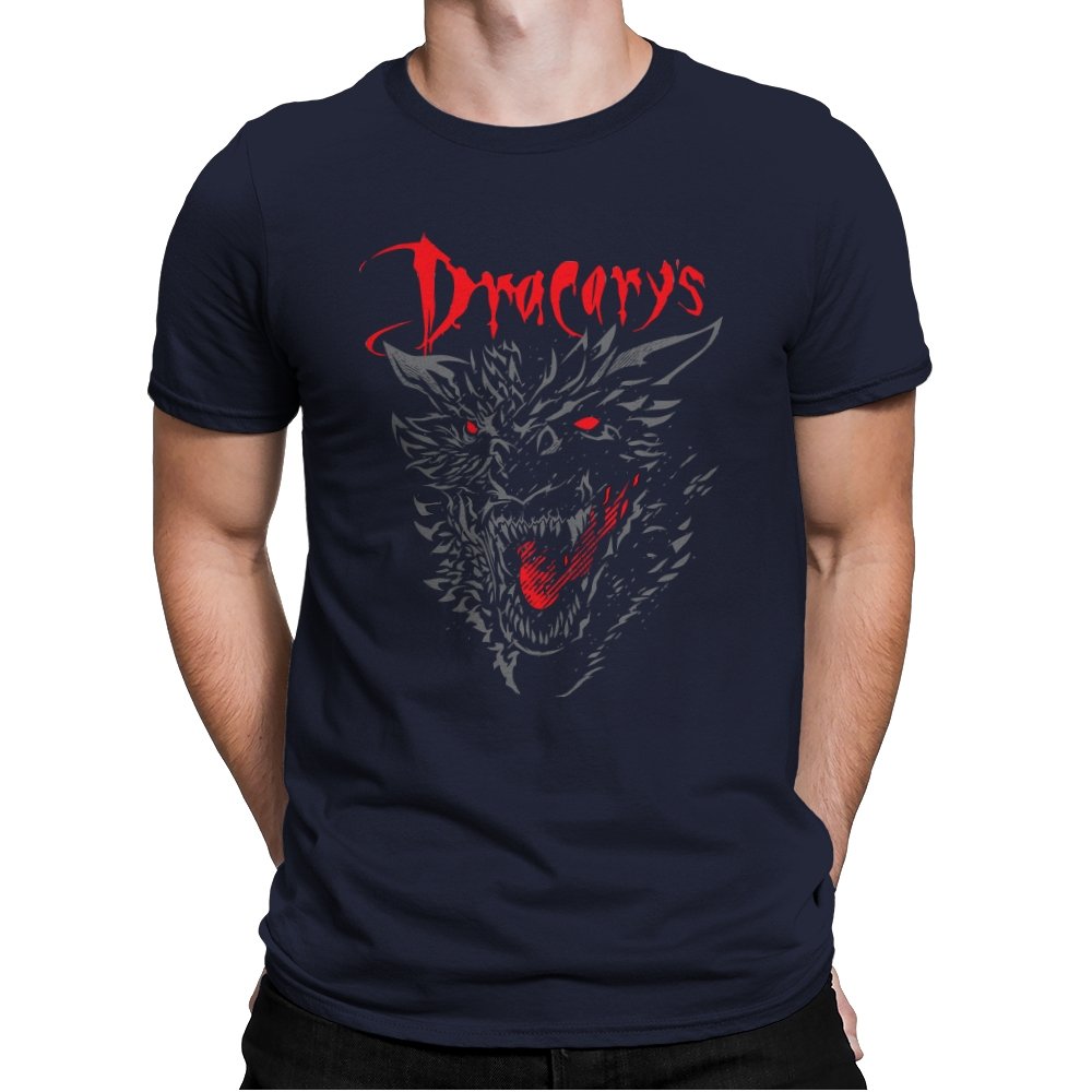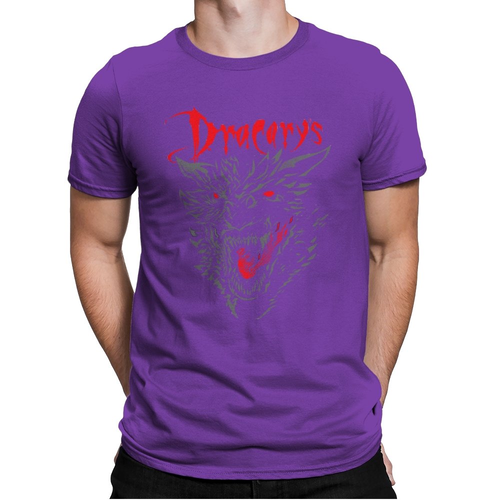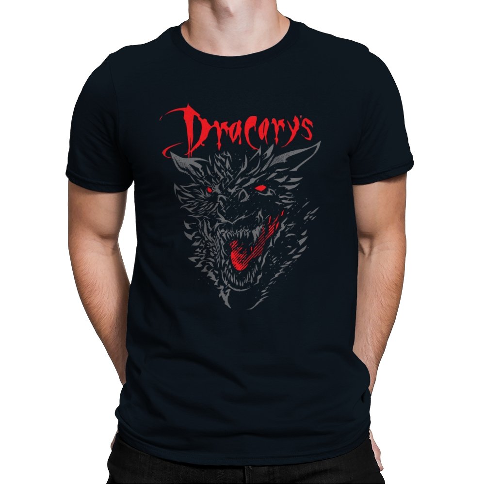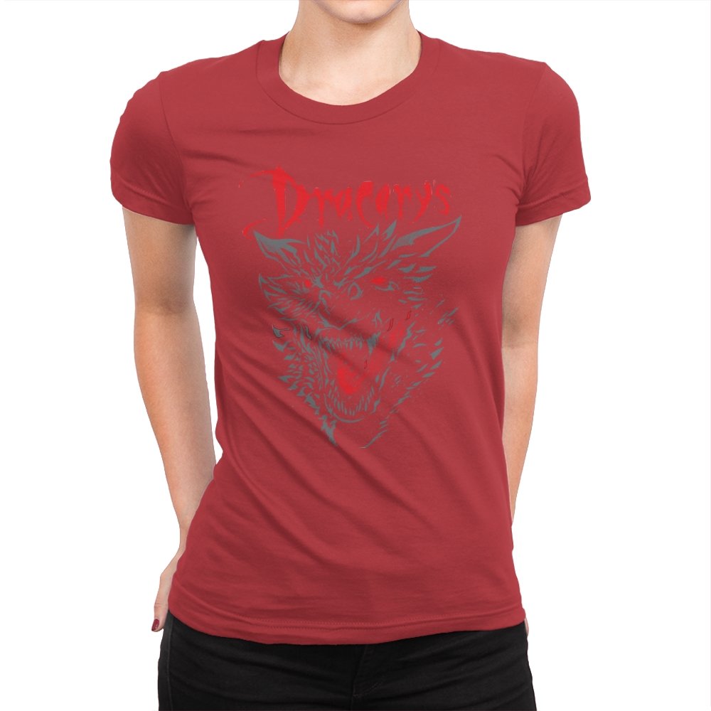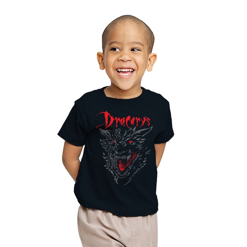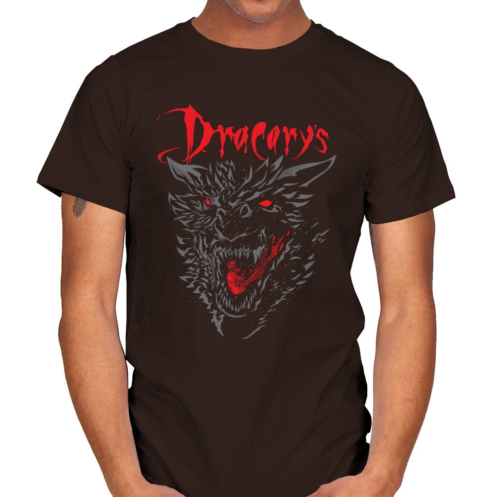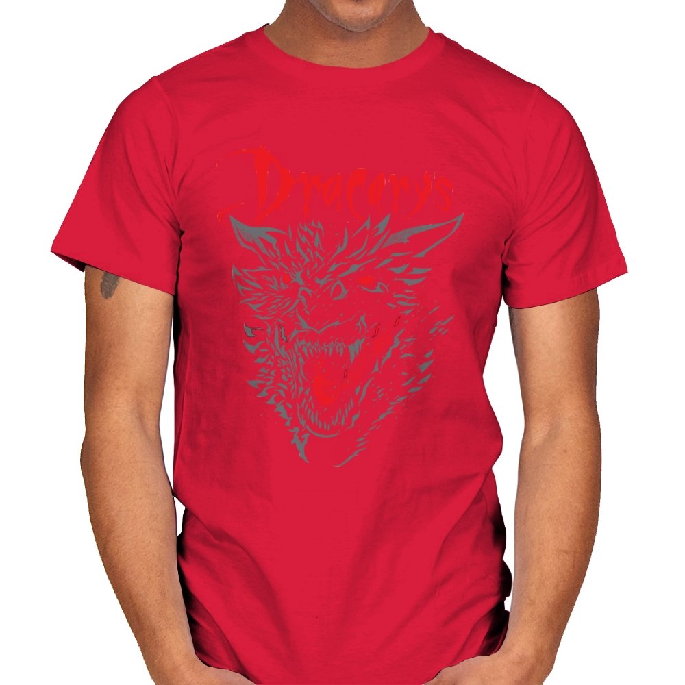 The design presents a snarling dragon head emerging from darkness, all jagged lines and burning eyes, with the name rendered in sharp crimson above it. The illustration leans into medieval fantasy iconography filtered through a modern metal aesthetic, where fire and fury are implied rather than shown outright. It feels less like a scene and more like a sigil, something meant to be worn as a declaration. Fans who recognize the phrase understand the weight behind it without needing explanation.
