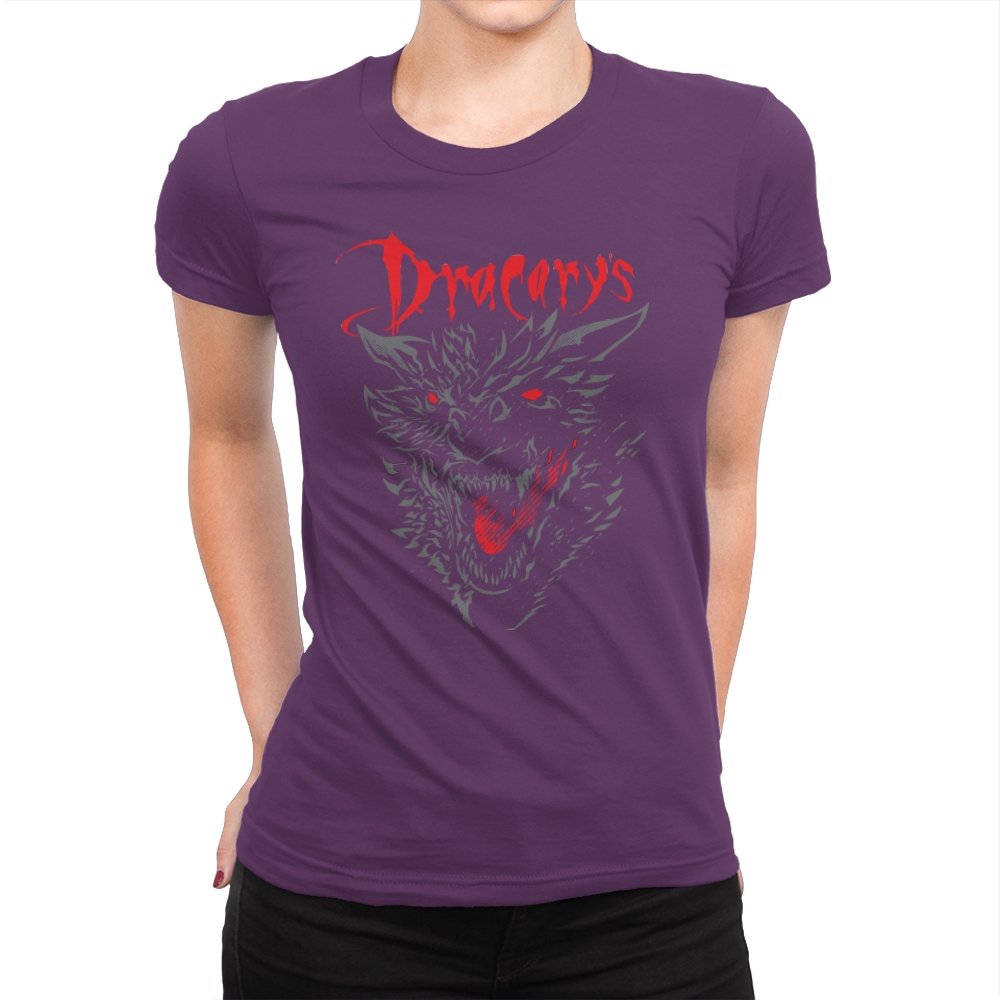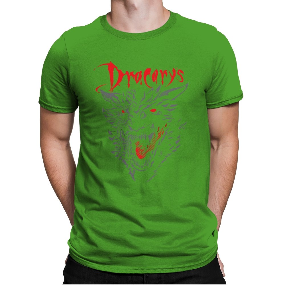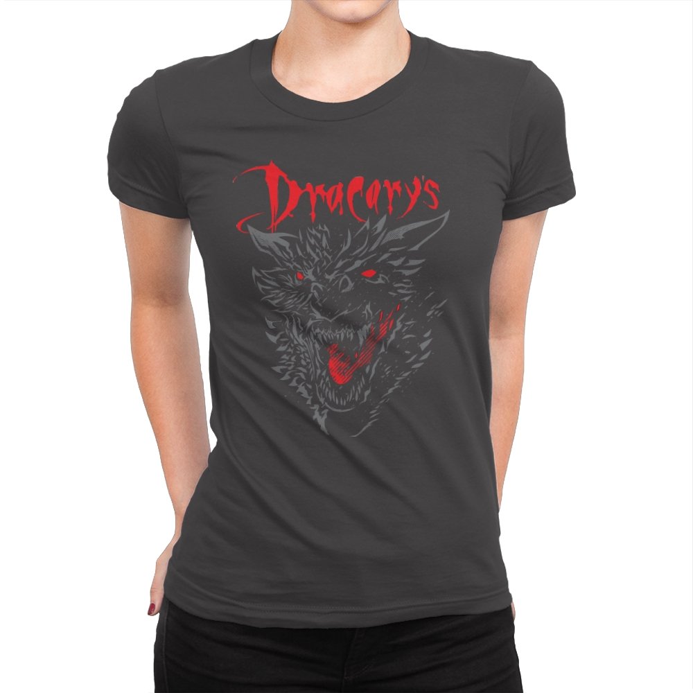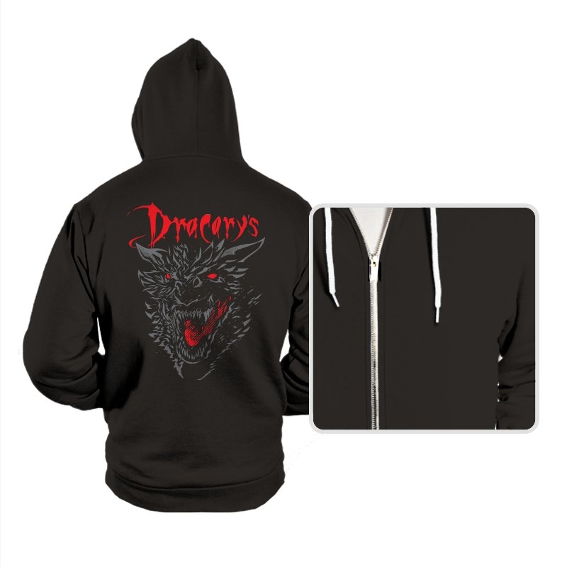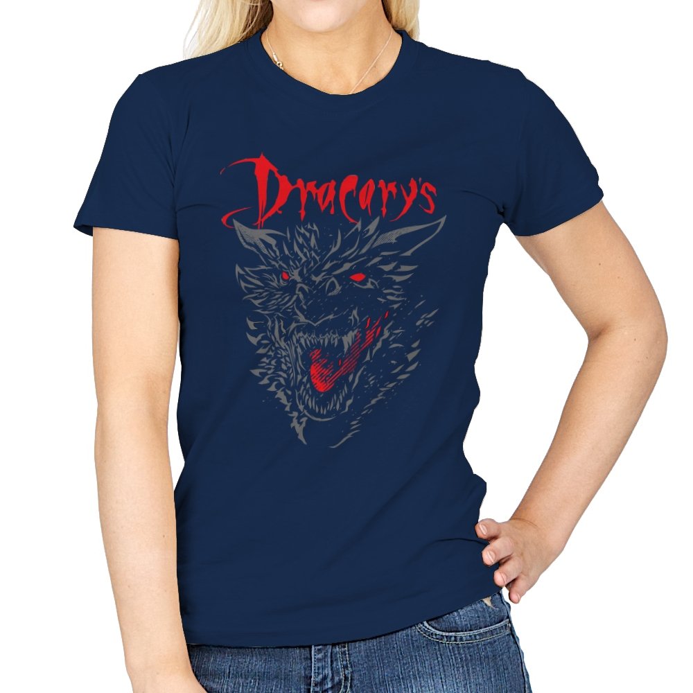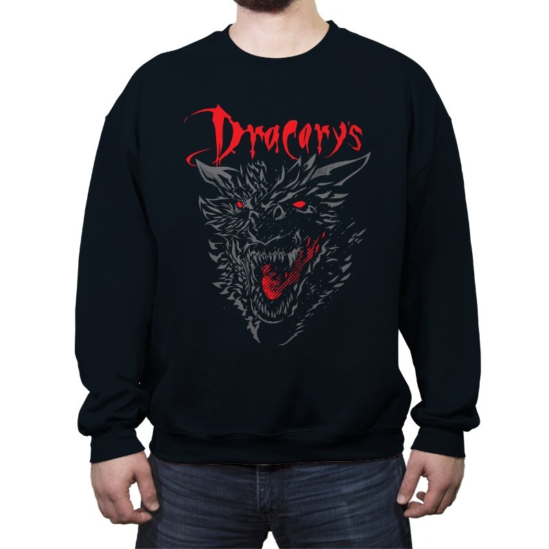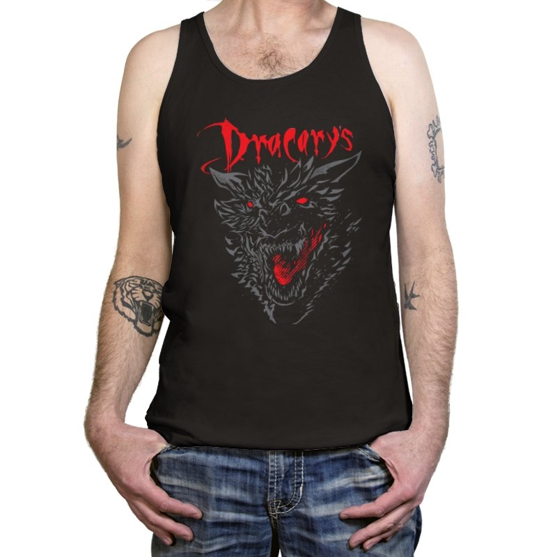 The design presents a snarling dragon head emerging from darkness, all jagged lines and burning eyes, with the name rendered in sharp crimson above it. The illustration leans into medieval fantasy iconography filtered through a modern metal aesthetic, where fire and fury are implied rather than shown outright. It feels less like a scene and more like a sigil, something meant to be worn as a declaration. Fans who recognize the phrase understand the weight behind it without needing explanation.