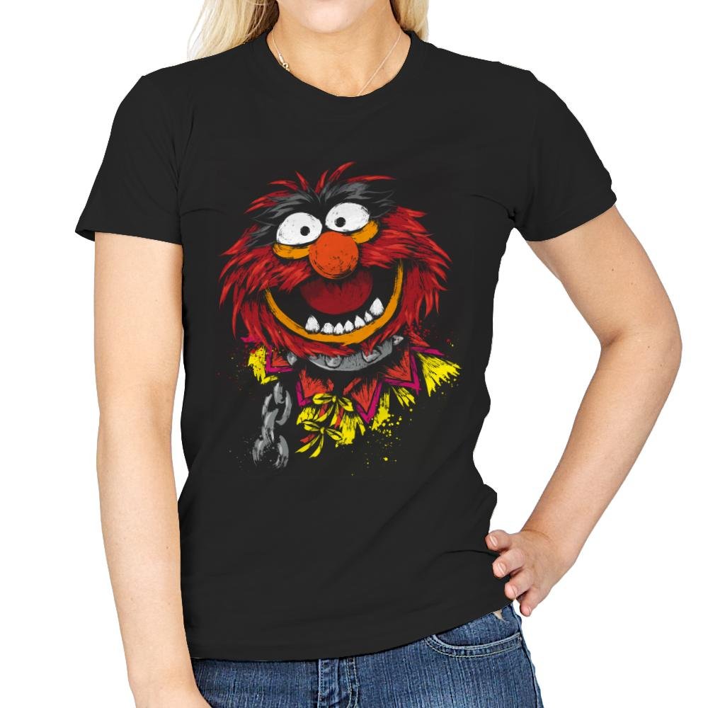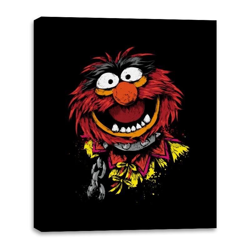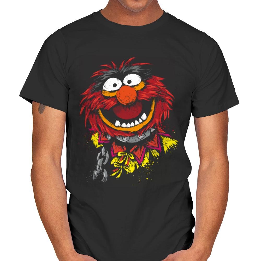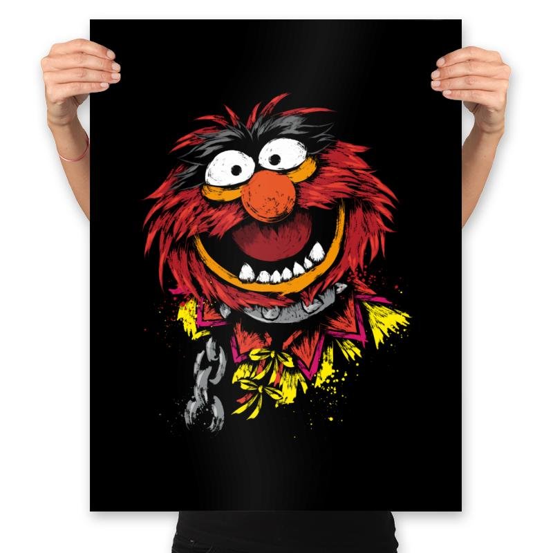 This design captures pure chaotic joy in a single frozen moment. A wild eyed, red furred drummer explodes off the dark background, mouth open mid laugh, collar crooked, energy completely uncontained. The rough textures and splattered edges make it feel loud even without sound, like a beat you can almost hear. Fans who grew up loving unhinged side characters know exactly why this image works.