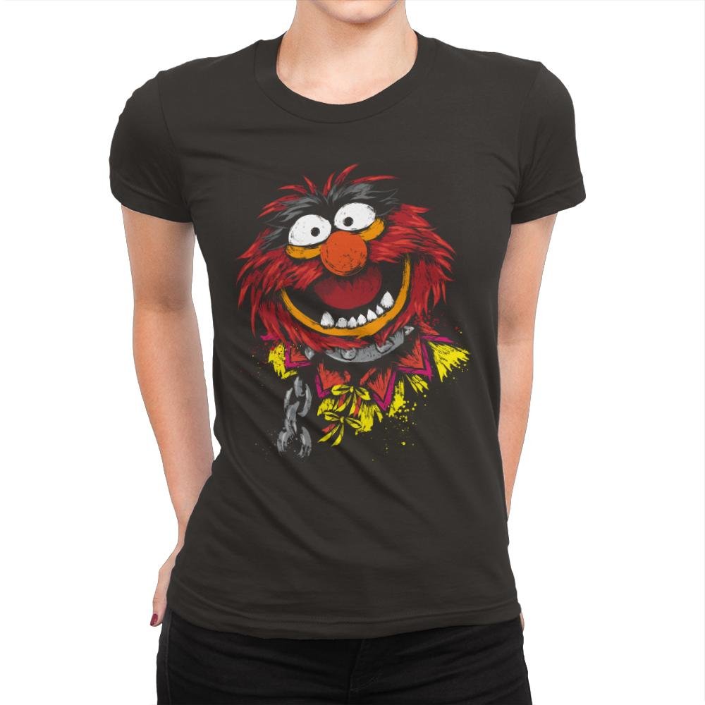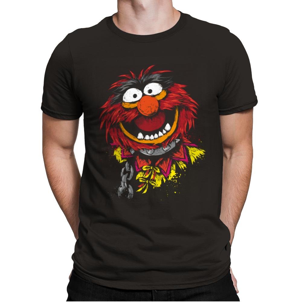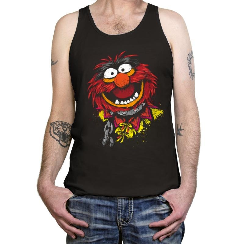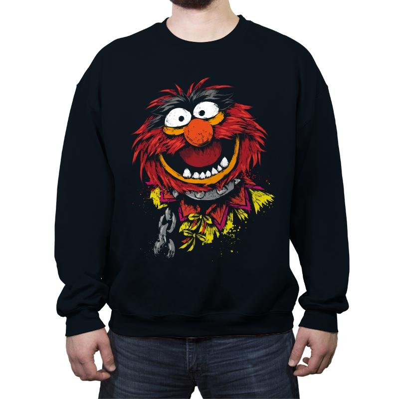 This design captures pure chaotic joy in a single frozen moment. A wild eyed, red furred drummer explodes off the dark background, mouth open mid laugh, collar crooked, energy completely uncontained. The rough textures and splattered edges make it feel loud even without sound, like a beat you can almost hear. Fans who grew up loving unhinged side characters know exactly why this image works.